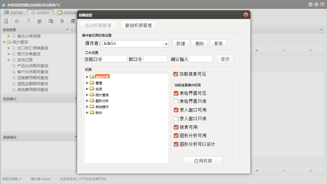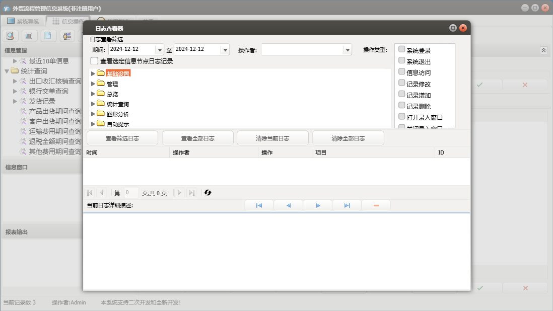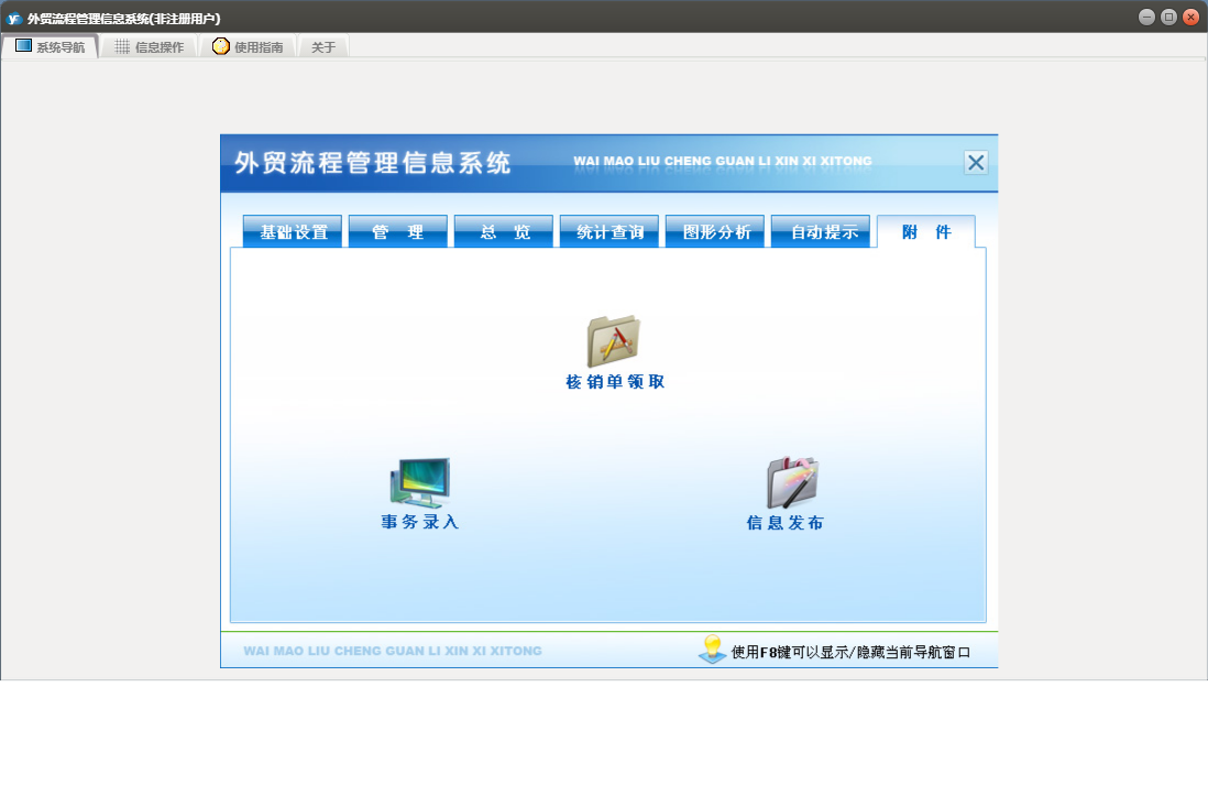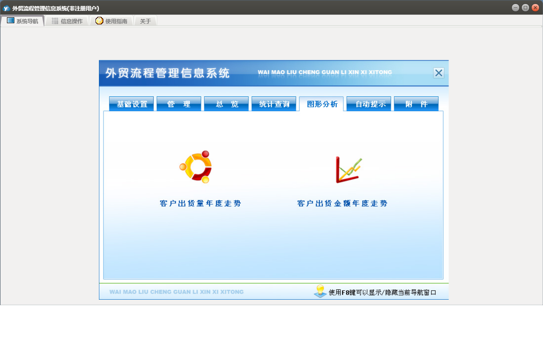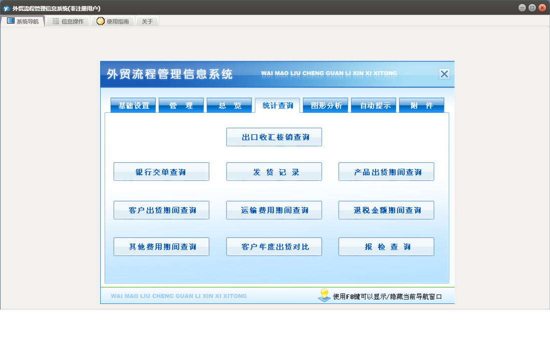 外贸流程管理信息系统包含以下功能:基本设置、币制、管理、产品信息、总览、最近10单信息、目的地、附件、船公司、目的港、场站、客户、事务录入、公司抬头、自动提示、权限设置、统计查询、期间单证信息、结汇方式、成交方式、起运港、包装种类、银行、运费种类、关于、纯录入、精确查询、图形分析、箱型、集装箱信息、信息发布、事务提醒、信息阅读、日志、所有单证信息、货运代理、目的国等