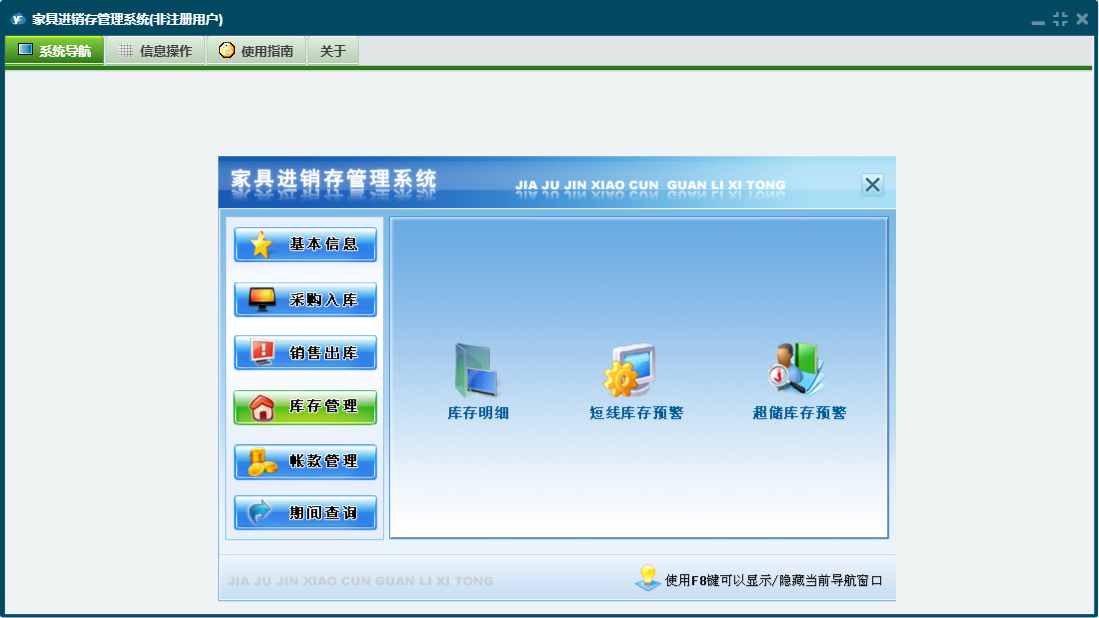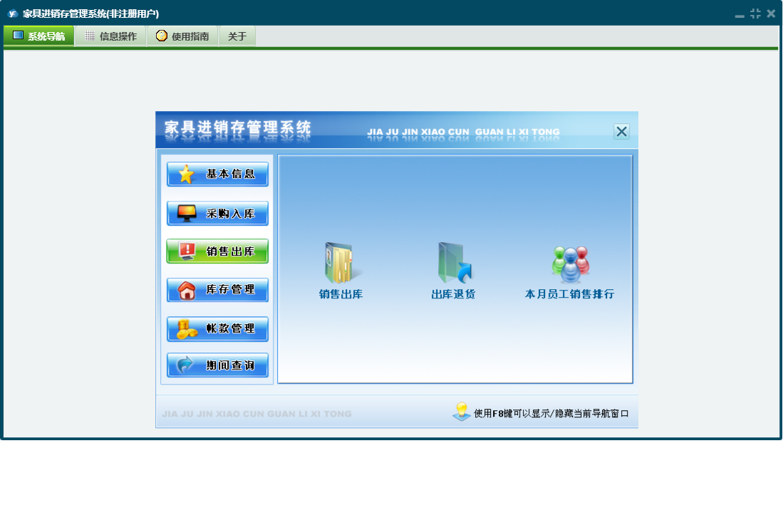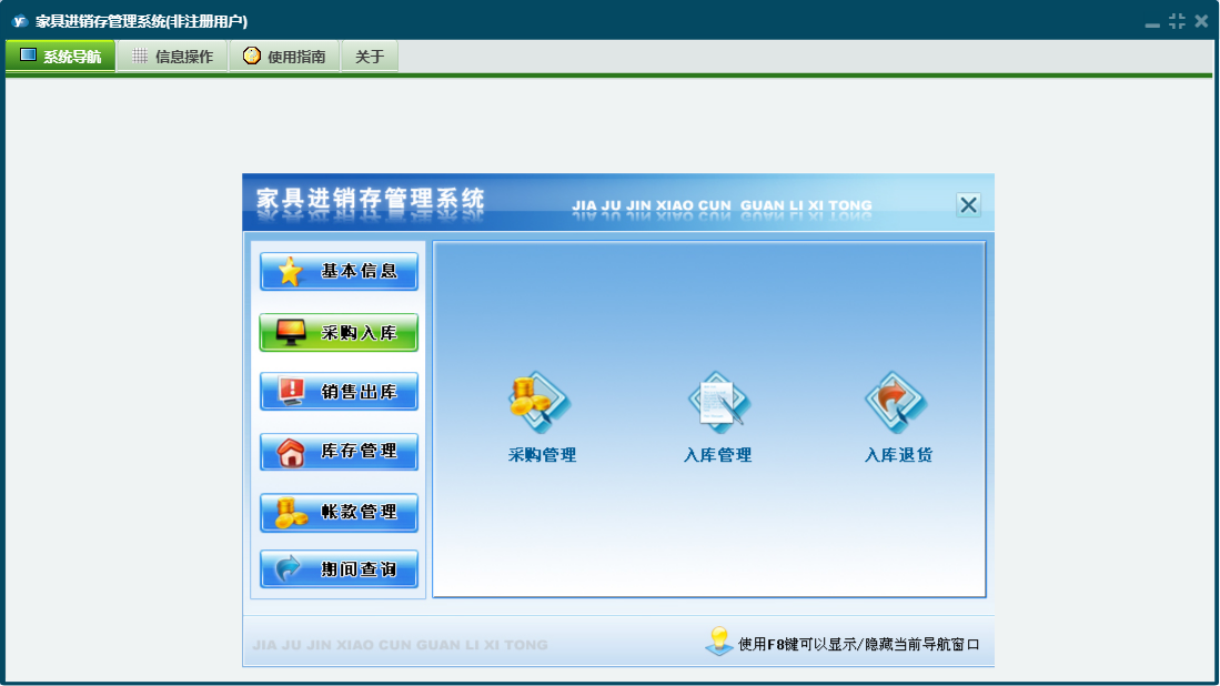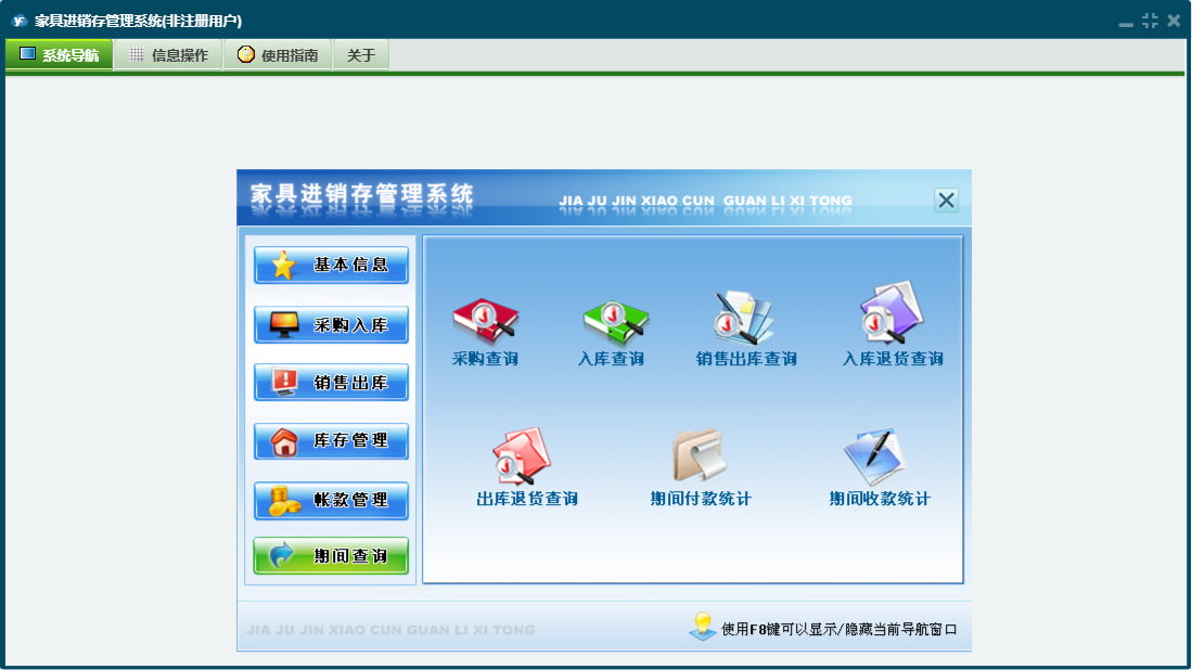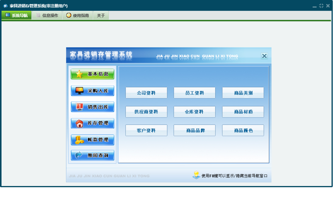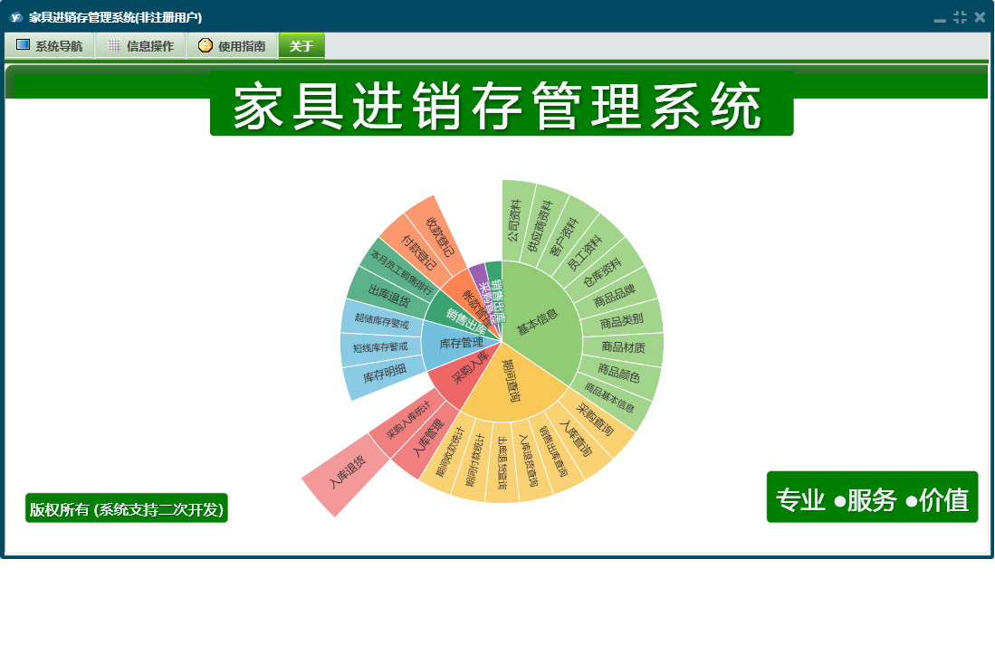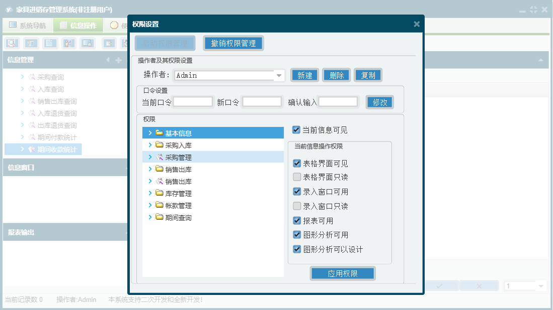 家具进销存管理系统包含以下功能:供应商资料、商品材质、员工资料、期间查询、商品品牌、商品类别、商品基本信息、付款登记、仓库资料、权限设置、出库退货、销售出库、收款登记、入库退货、公司资料、库存管理、关于、基本信息、明细账簿、客户资料、入库管理、日志、采购管理、采购入库、超储库存警戒、商品颜色等