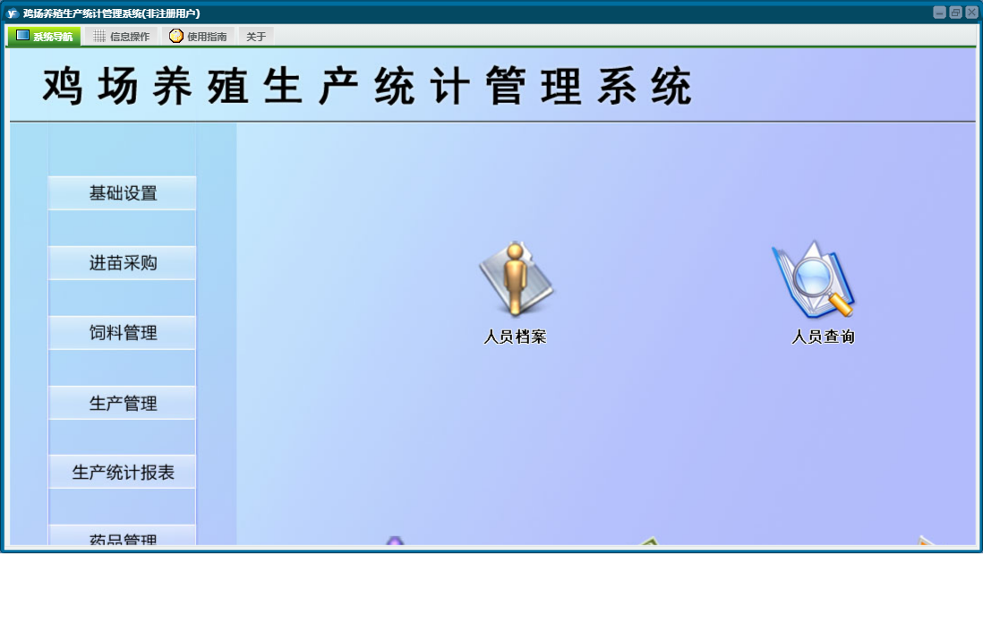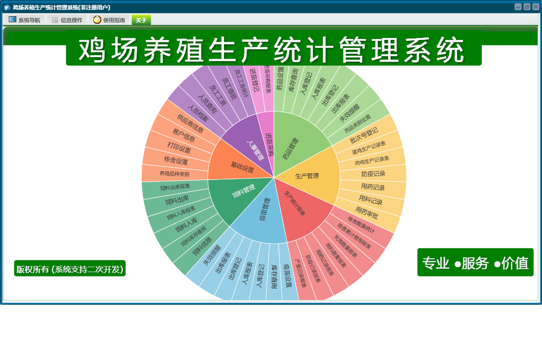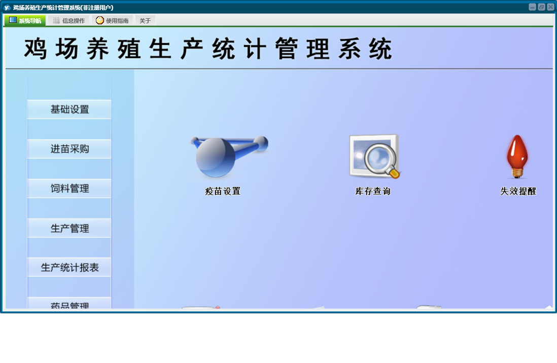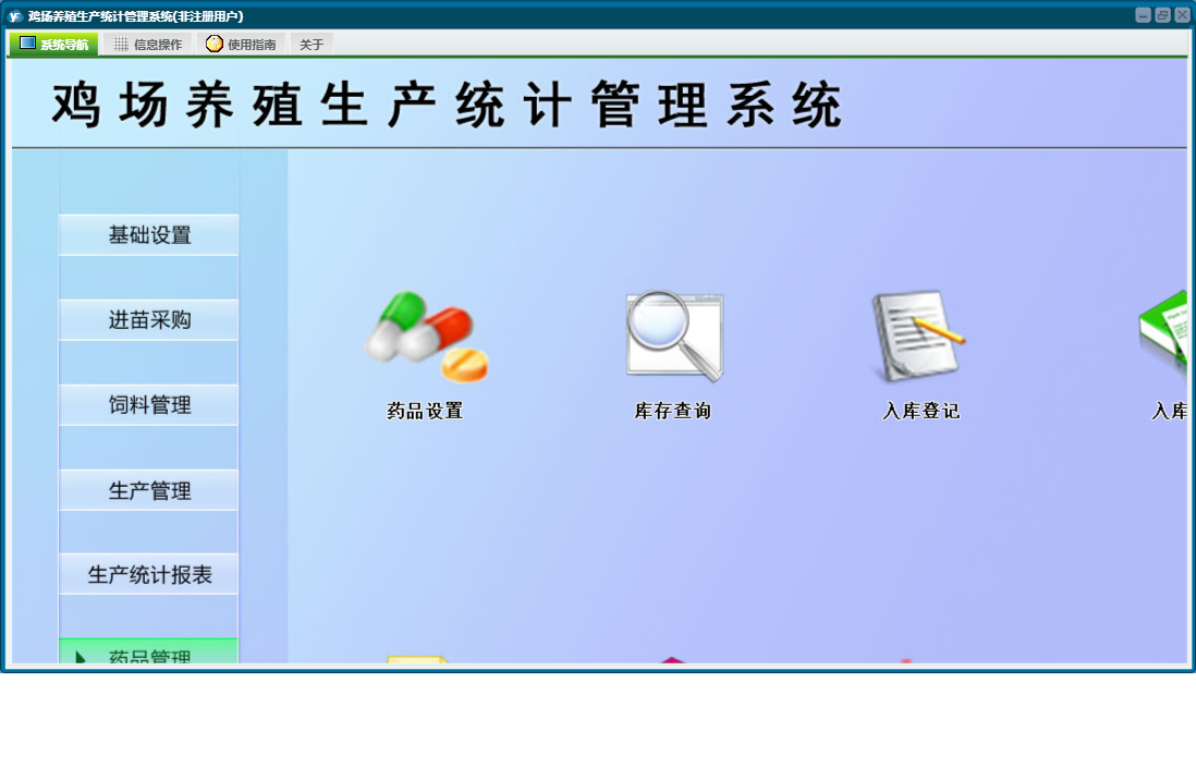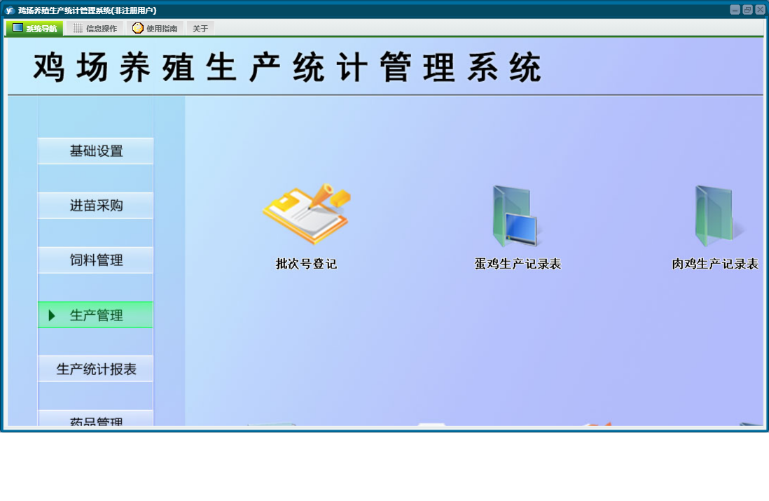 鸡场养殖生产统计管理系统包含以下功能:基础设置、药品管理、出库登记、肉鸡生产记录表、用料记录、人事管理、药品类别设置、入库登记、权限设置、饲料信息、养殖品种类别、人员档案、供应商信息、员工工资、蛋鸡生产记录表、关于、疫苗管理、进苗采购、客户信息、用药记录、员工借款、生产统计、饲料管理、疫苗设置、药品设置、日志、栋舍设置、防疫记录、生产管理、饲料出库、进苗登记、用药审批、饲料入库等