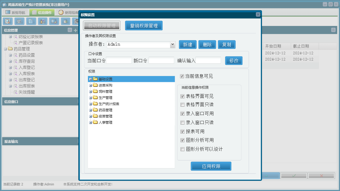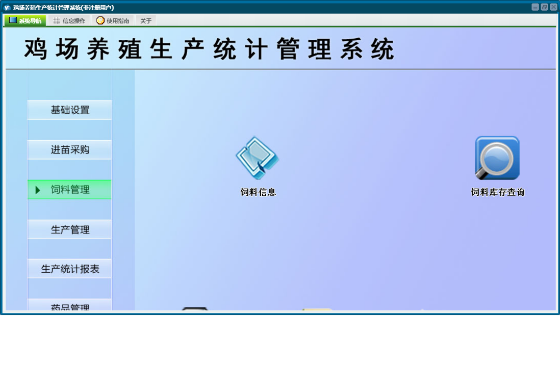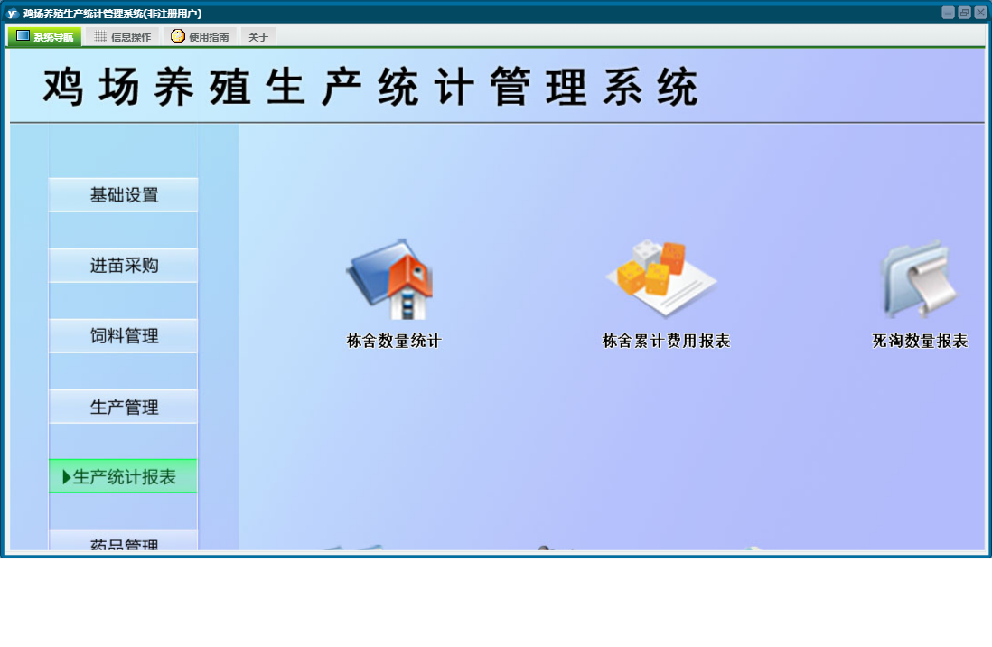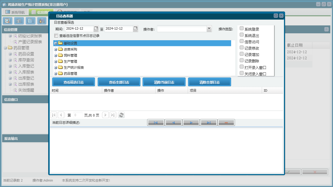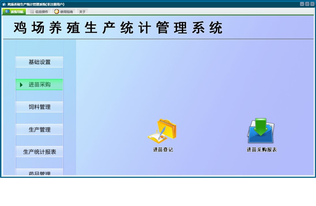 鸡场养殖生产统计管理系统包含以下功能:基础设置、药品管理、出库登记、肉鸡生产记录表、用料记录、人事管理、药品类别设置、入库登记、权限设置、饲料信息、养殖品种类别、人员档案、供应商信息、员工工资、蛋鸡生产记录表、关于、疫苗管理、进苗采购、客户信息、用药记录、员工借款、生产统计、饲料管理、疫苗设置、药品设置、日志、栋舍设置、防疫记录、生产管理、饲料出库、进苗登记、用药审批、饲料入库等