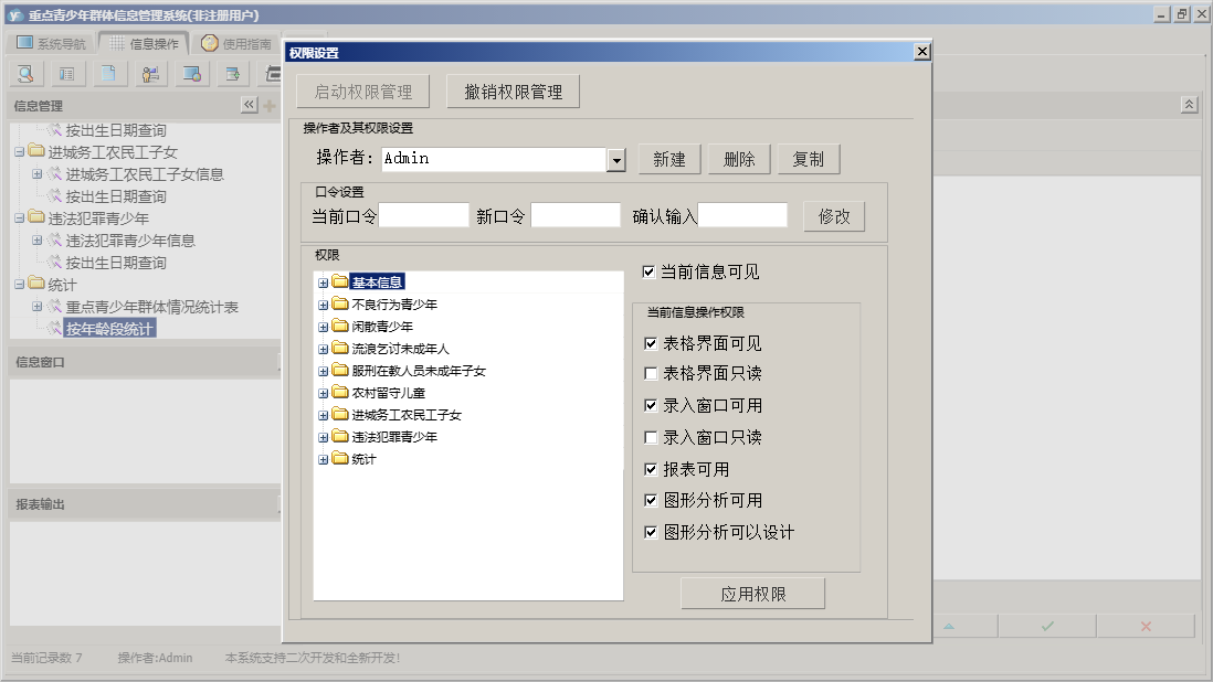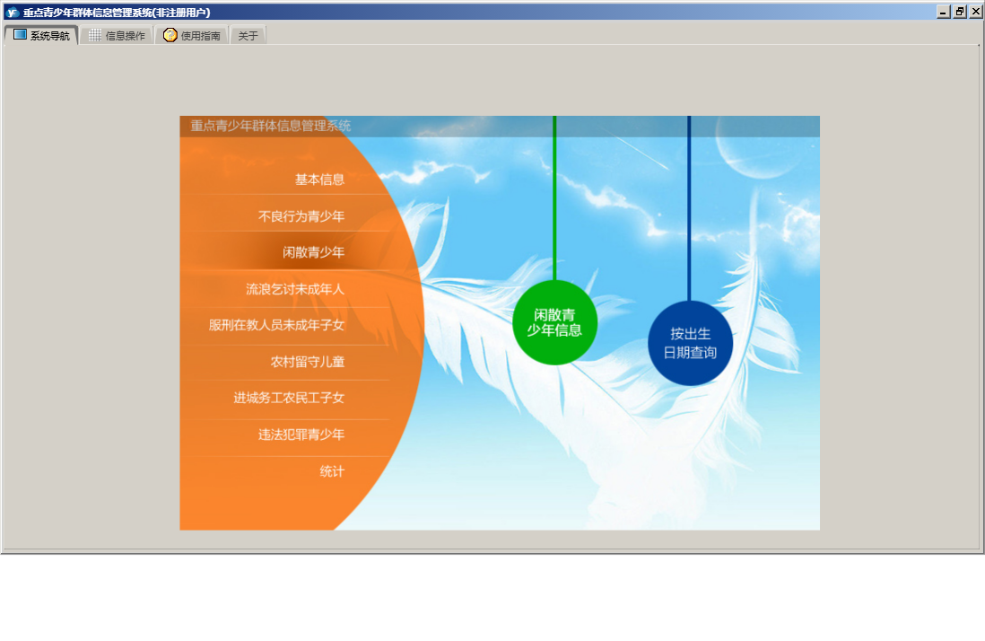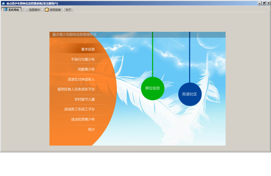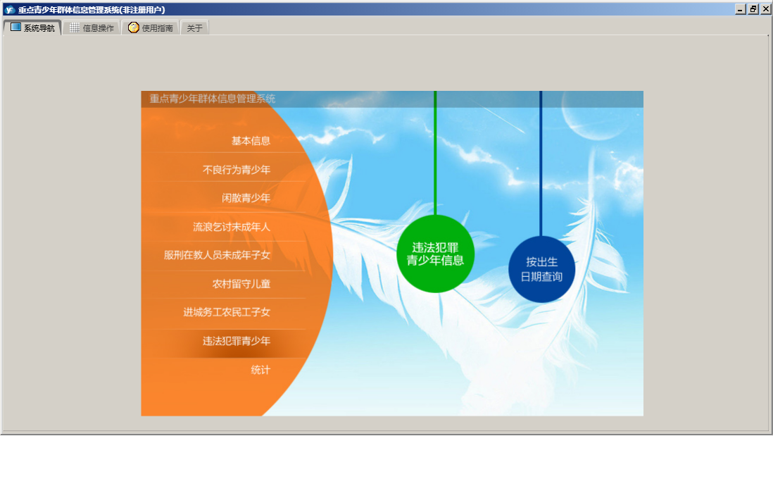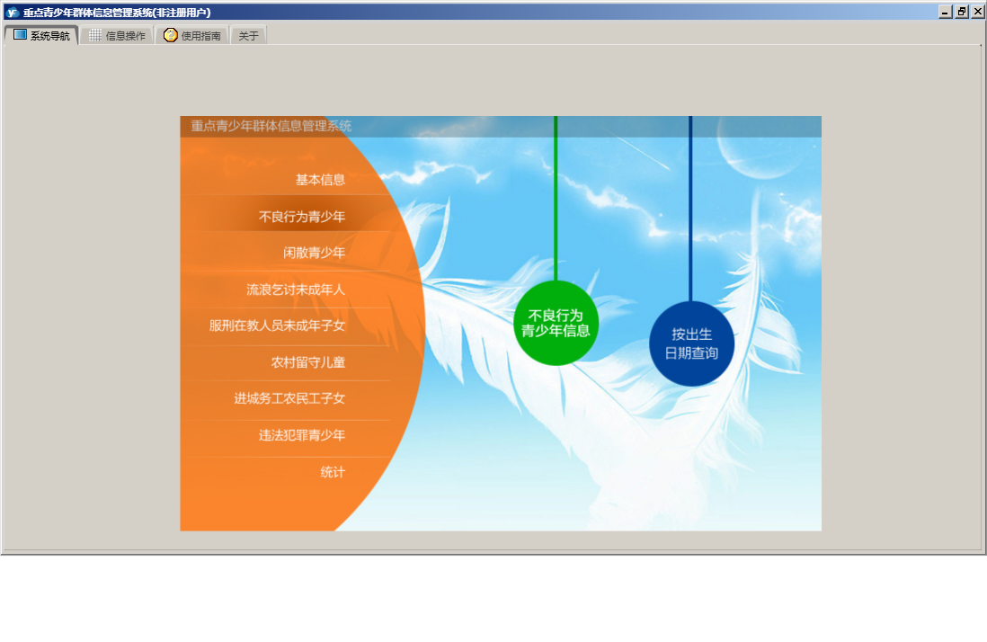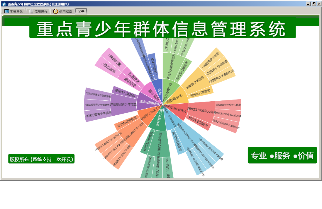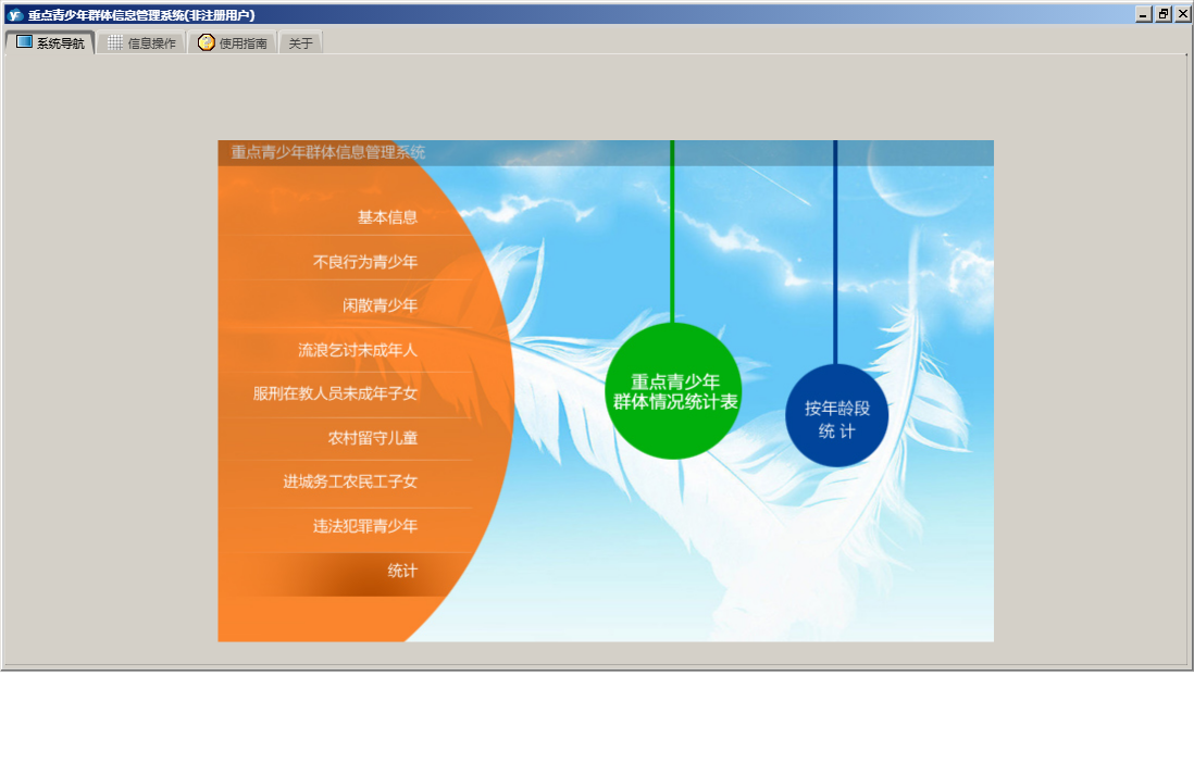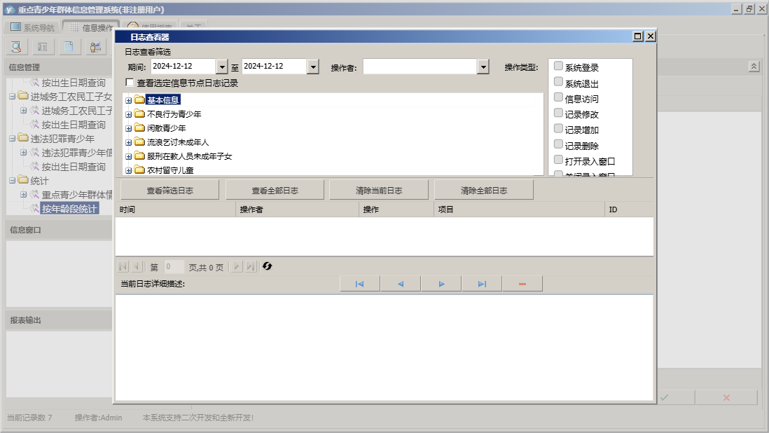 重点青少年群体信息管理系统包含以下功能:农村留守儿童信息、违法犯罪、服刑在教人员未成年子女信息、闲散、进城务工、统计、流浪乞讨未成年人信息、进城务工农民工子女信息、权限设置、街道社区、单位信息、服刑在教、流浪乞讨、农村留守、不良行为、关于、基本信息、不良行为青少年信息、闲散青少年信息、日志、违法犯罪青少年信息等