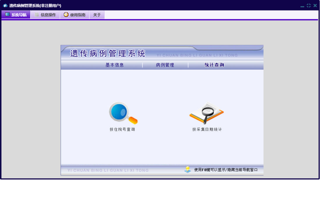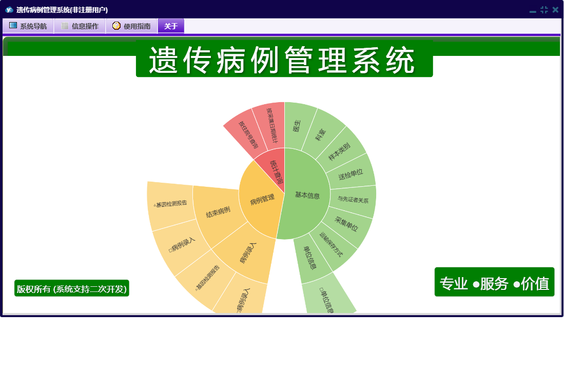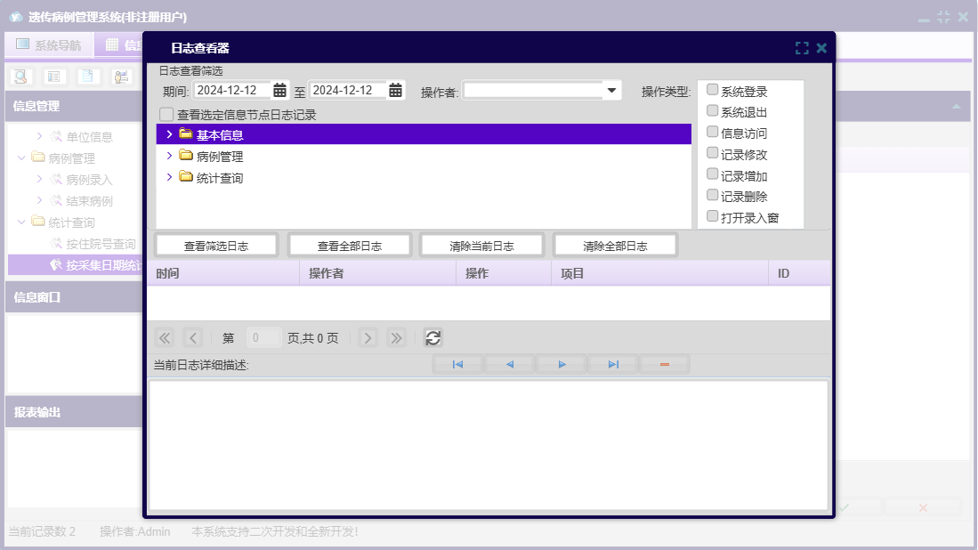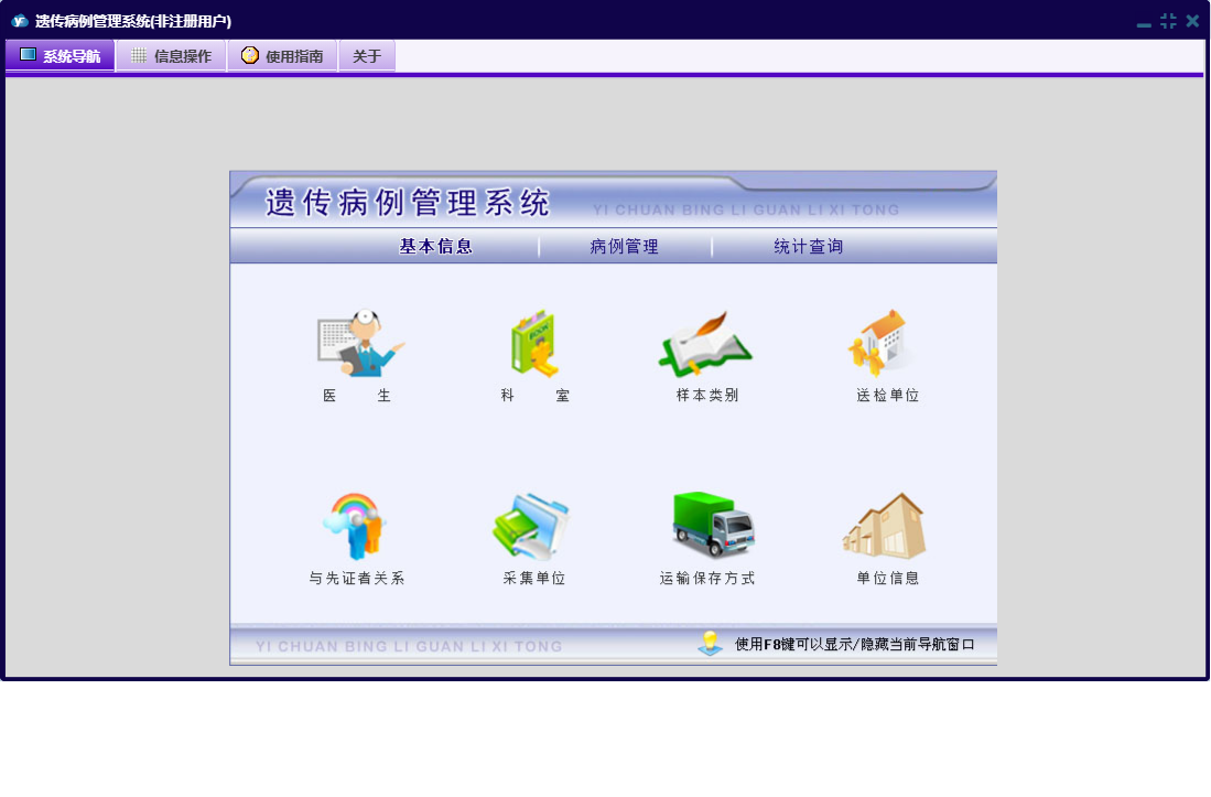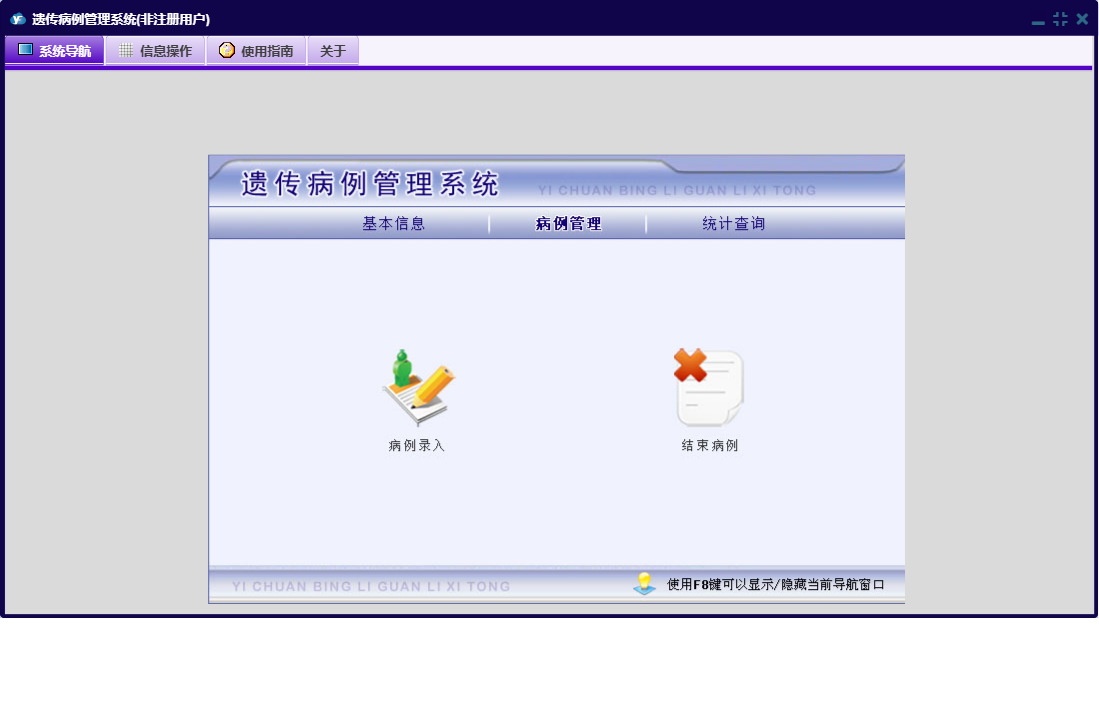 遗传病例管理系统包含以下功能:单位信息、病例管理、日志、结束病例、关于、权限设置、基本信息、统计查询、病例录入等