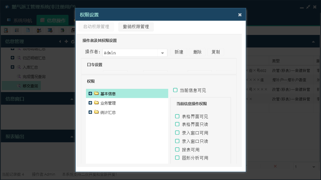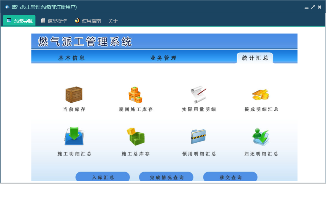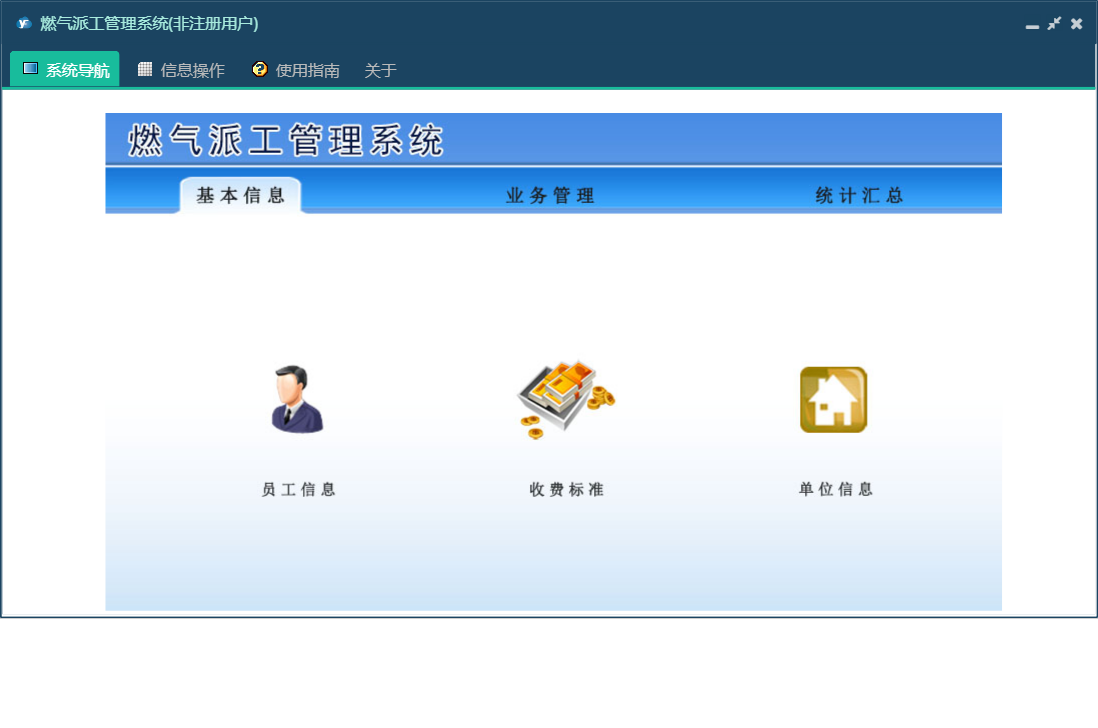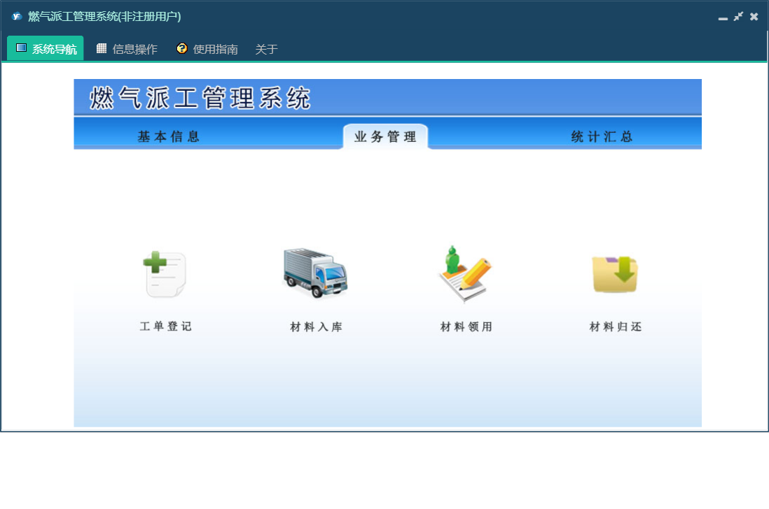 燃气派工管理系统包含以下功能:材料领用、收费标准、员工信息、日志、统计汇总、关于、基本信息、权限设置、材料归还、工单登记、材料入库、业务管理等