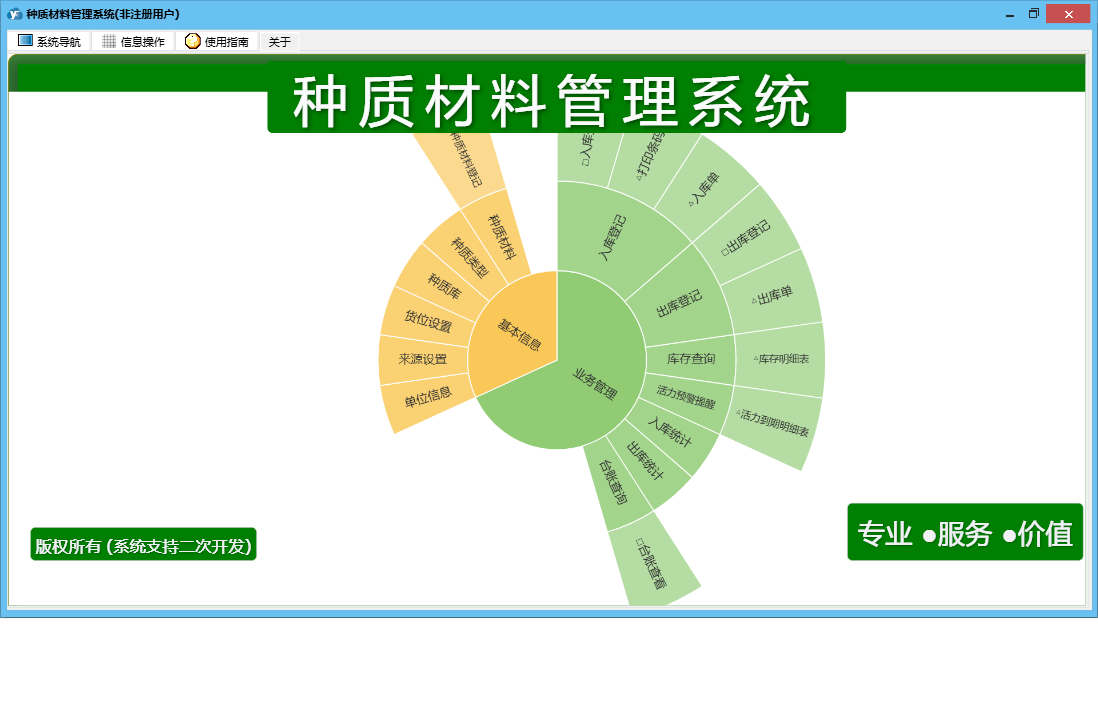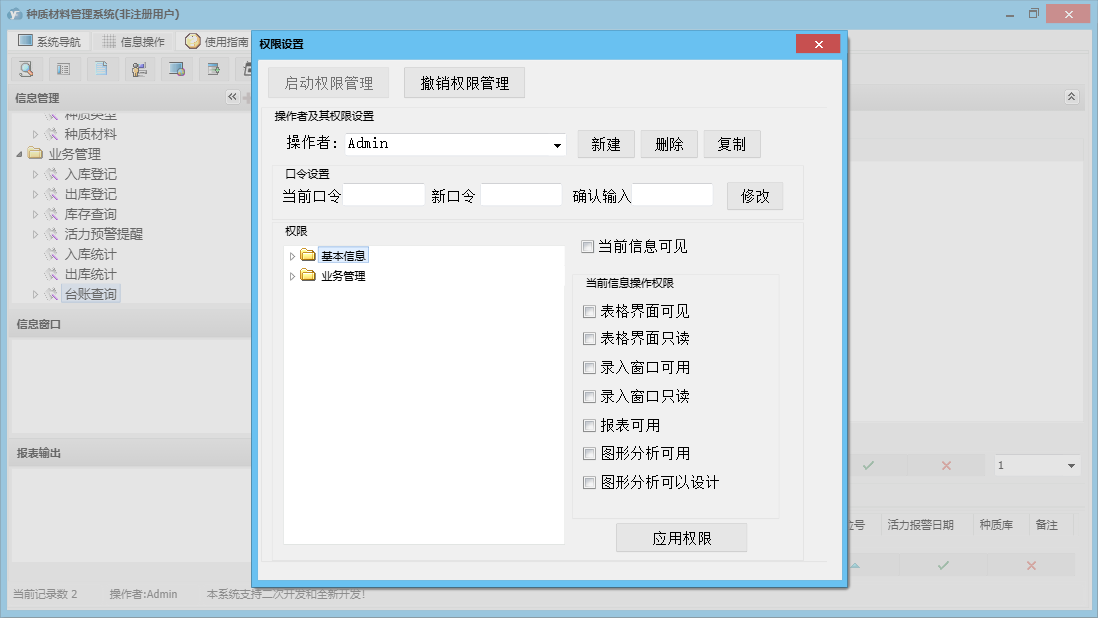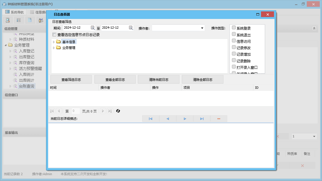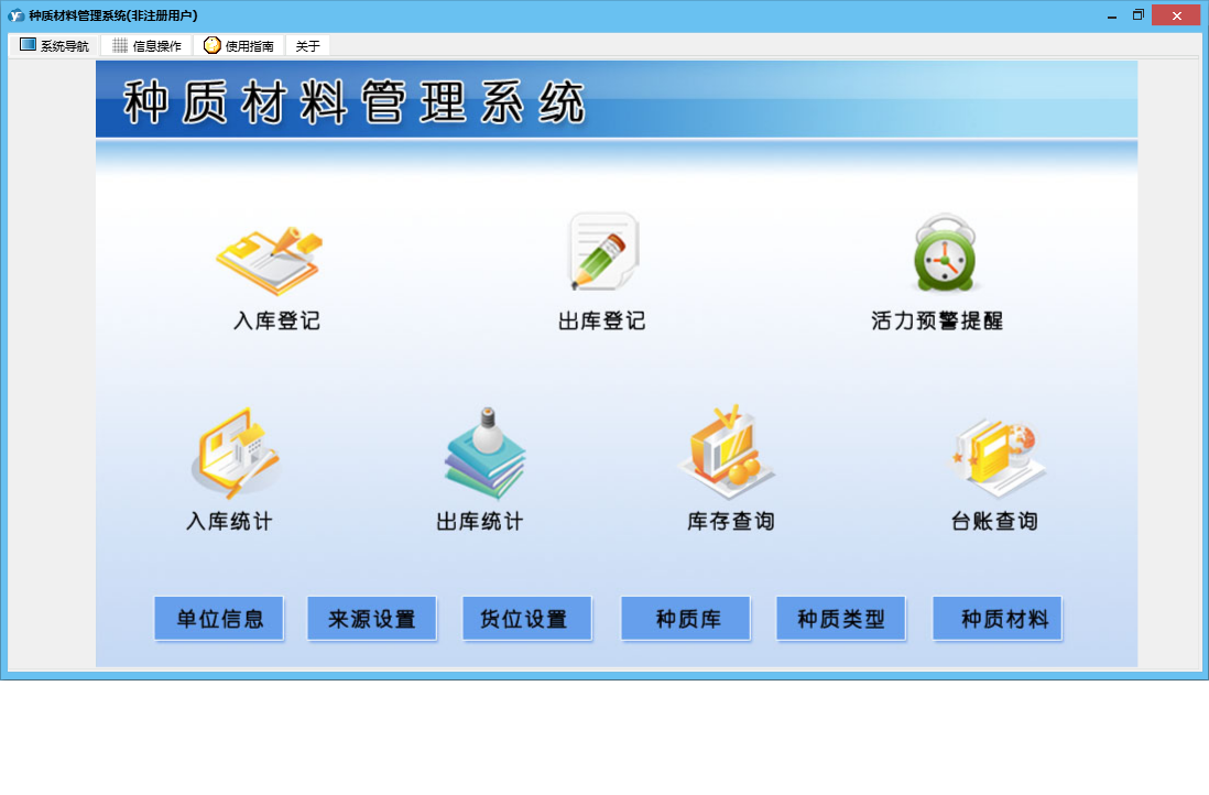 种质材料管理系统包含以下功能:台账查询、面板、入库登记、出库登记、日志、关于、权限设置、种质材料等
