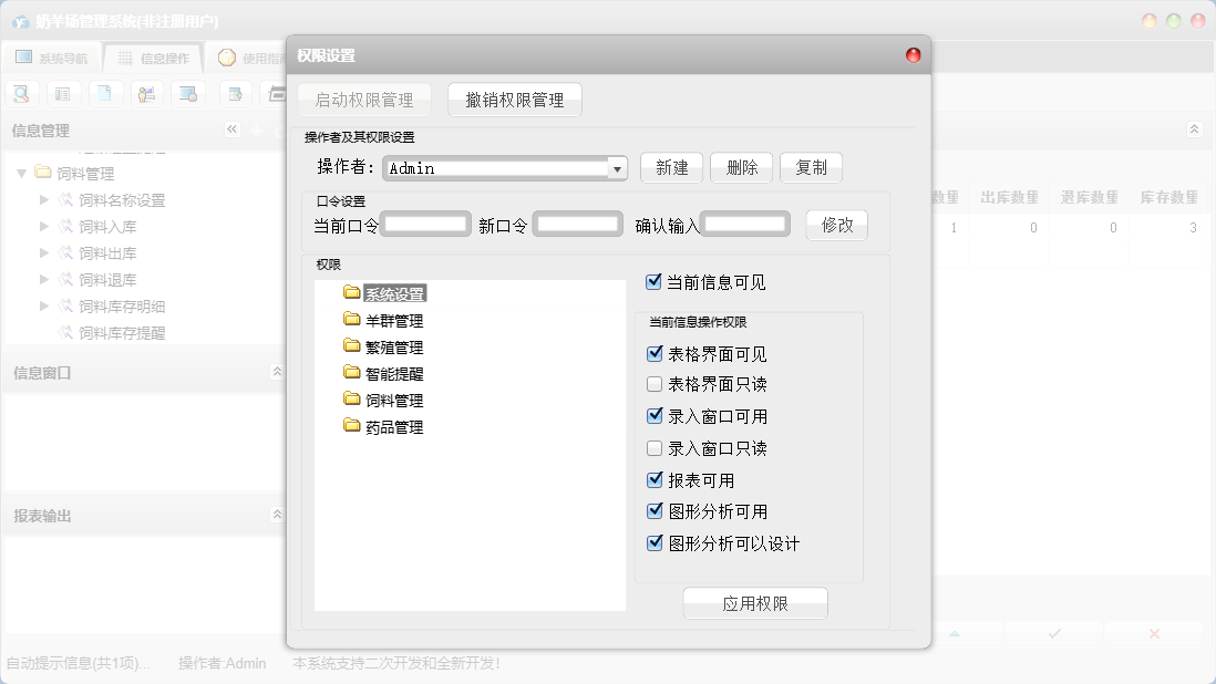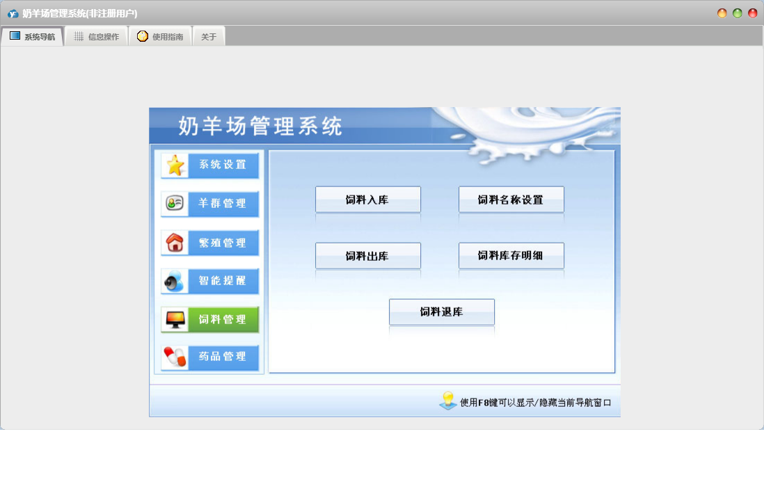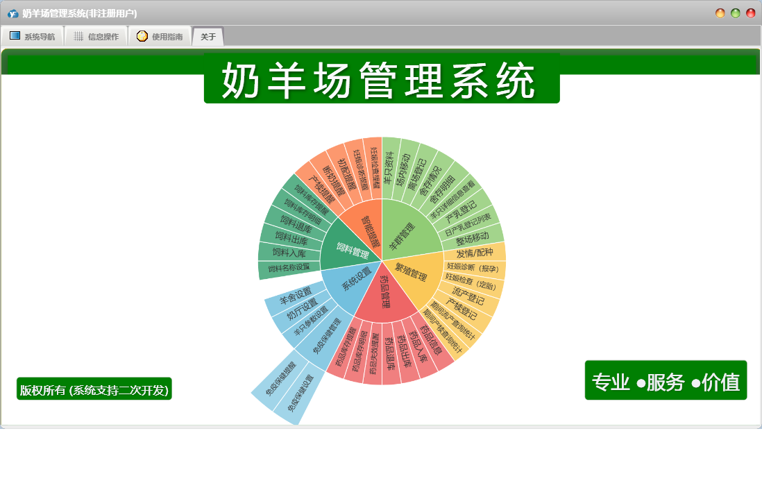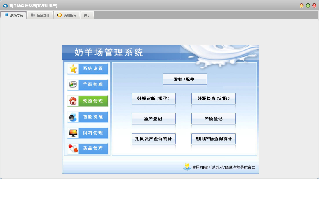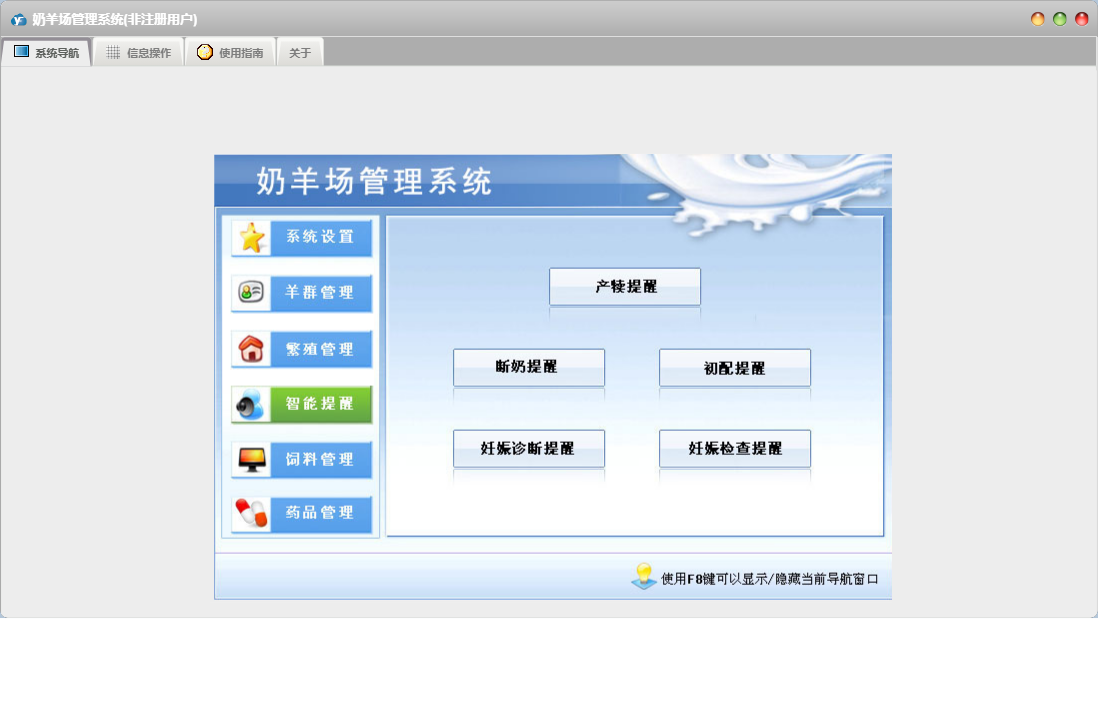 奶羊场管理系统包含以下功能:药品管理、饲料名称设置、免疫保健设置、繁殖管理、妊娠诊断(报孕)、场内移动、药品入库、羊群管理、发情、权限设置、产犊登记、羊只资料、药品信息、羊舍设置、智能提醒、关于、药品退库、系统设置、药品出库、饲料管理、离场登记、饲料退库、产乳登记、妊娠检查(定胎)、日志、整场移动、流产登记、饲料出库、奶厅设置、饲料入库等
