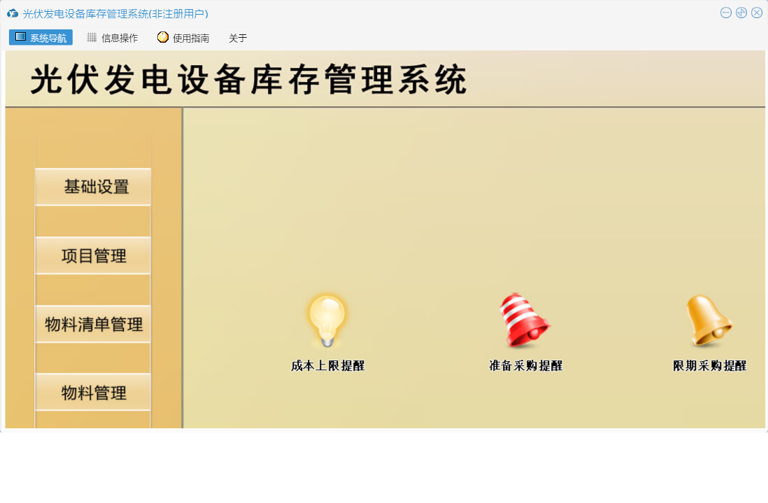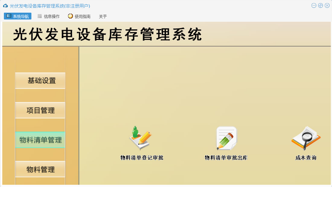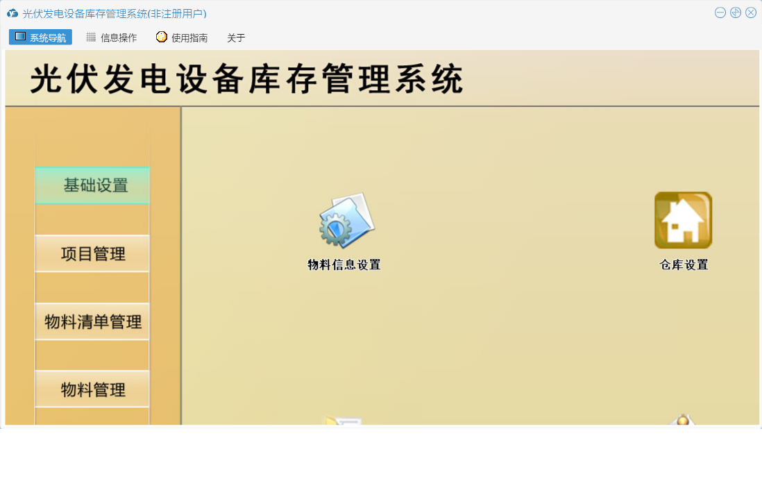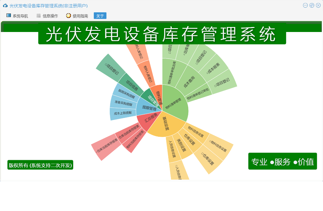 光伏发电设备库存管理系统包含以下功能:仓库设置、基础设置、提醒管理、物流清单管理、物料信息设置、项目信息、成本查询、日志、物料清单审批出库、关于、人员信息设置、权限设置、物料入库登记、物料管理、项目管理、物料清单登记审批、汇总等