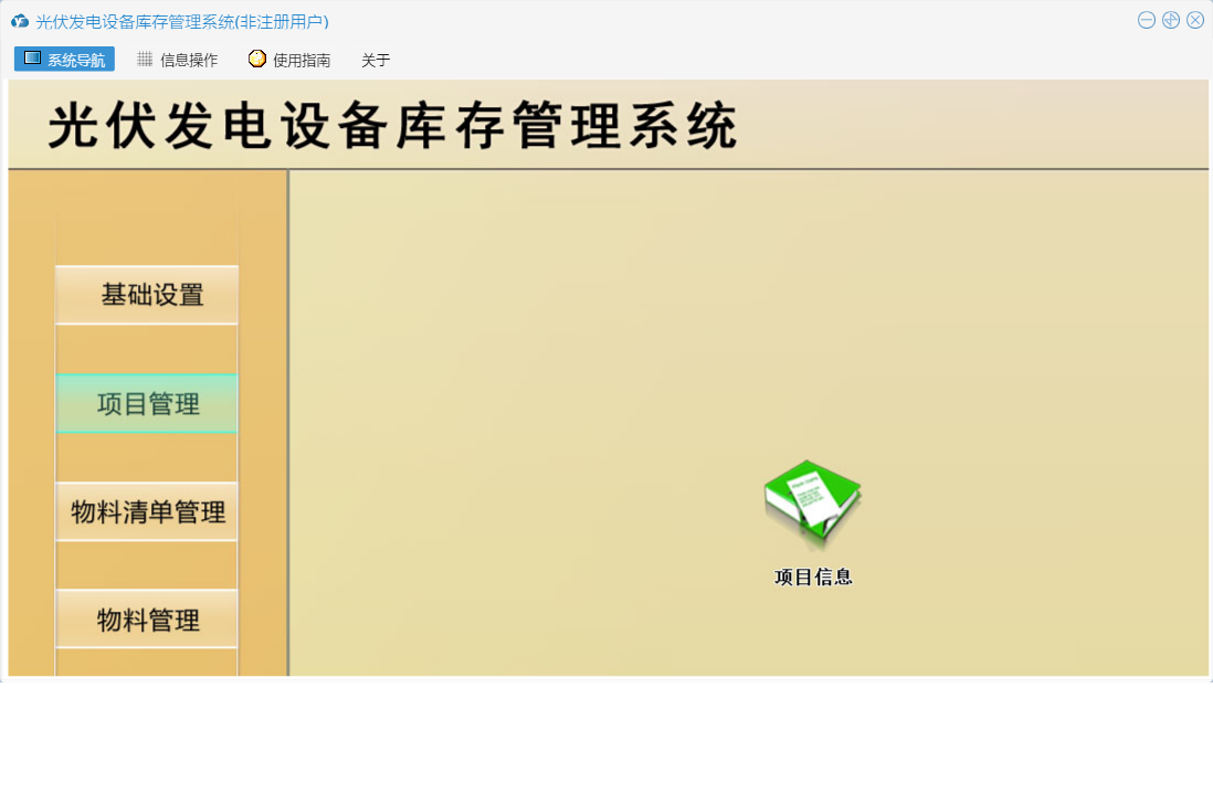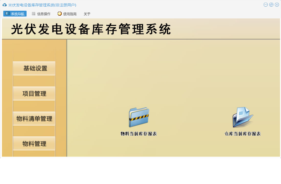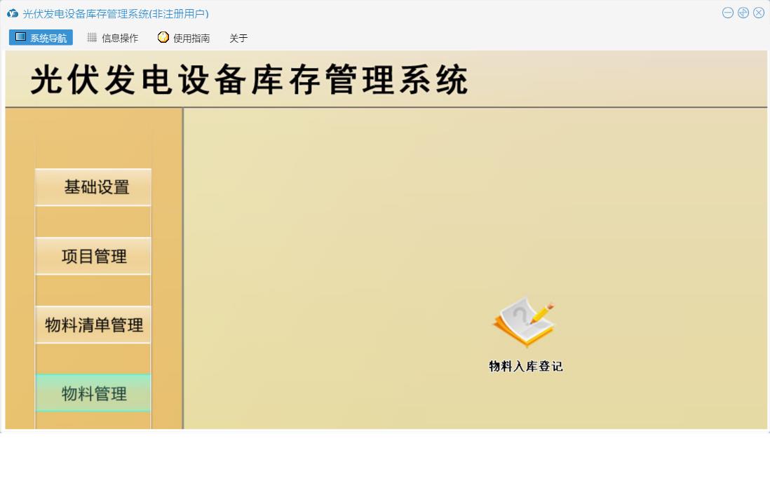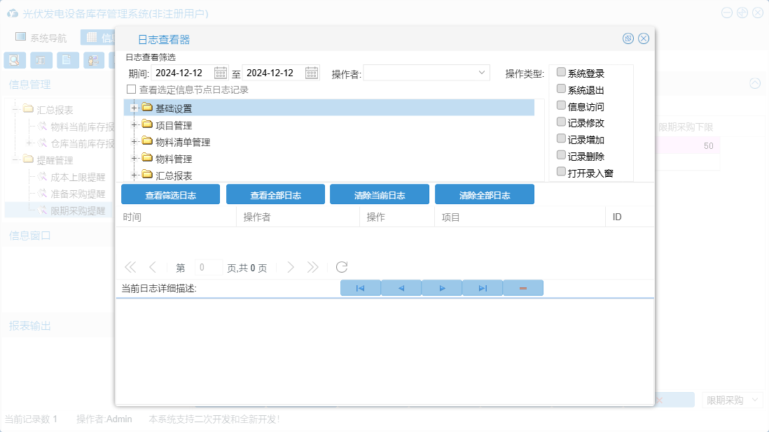光伏发电设备库存管理系统包含以下功能:仓库设置、基础设置、提醒管理、物流清单管理、物料信息设置、项目信息、成本查询、日志、物料清单审批出库、关于、人员信息设置、权限设置、物料入库登记、物料管理、项目管理、物料清单登记审批、汇总等