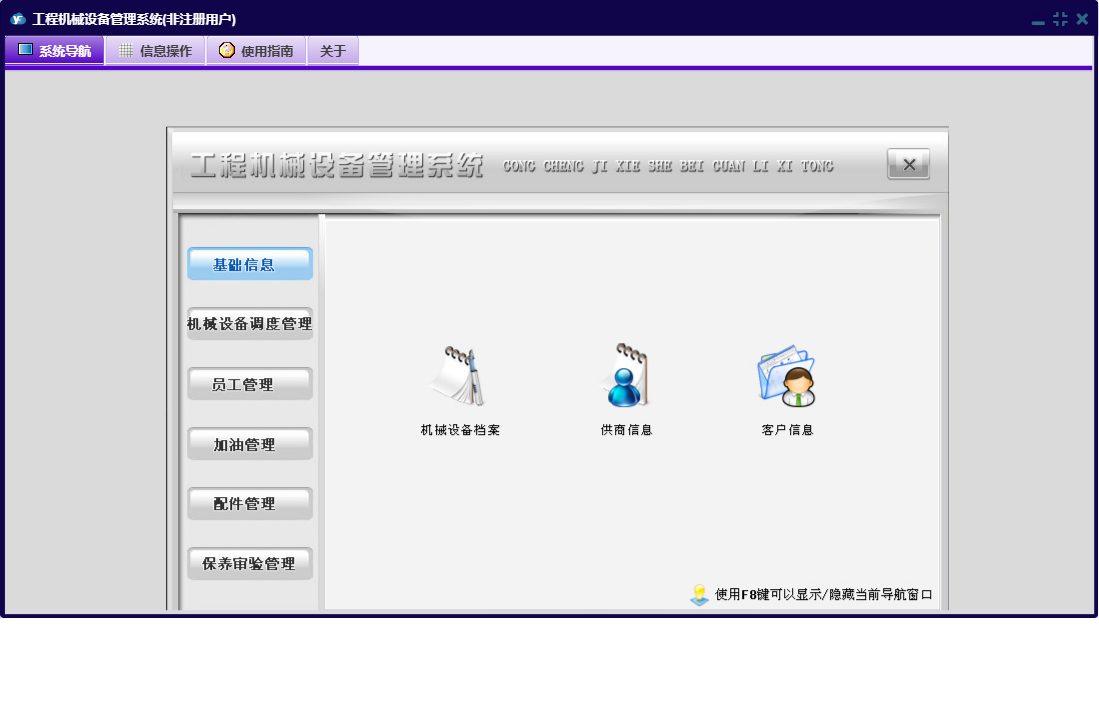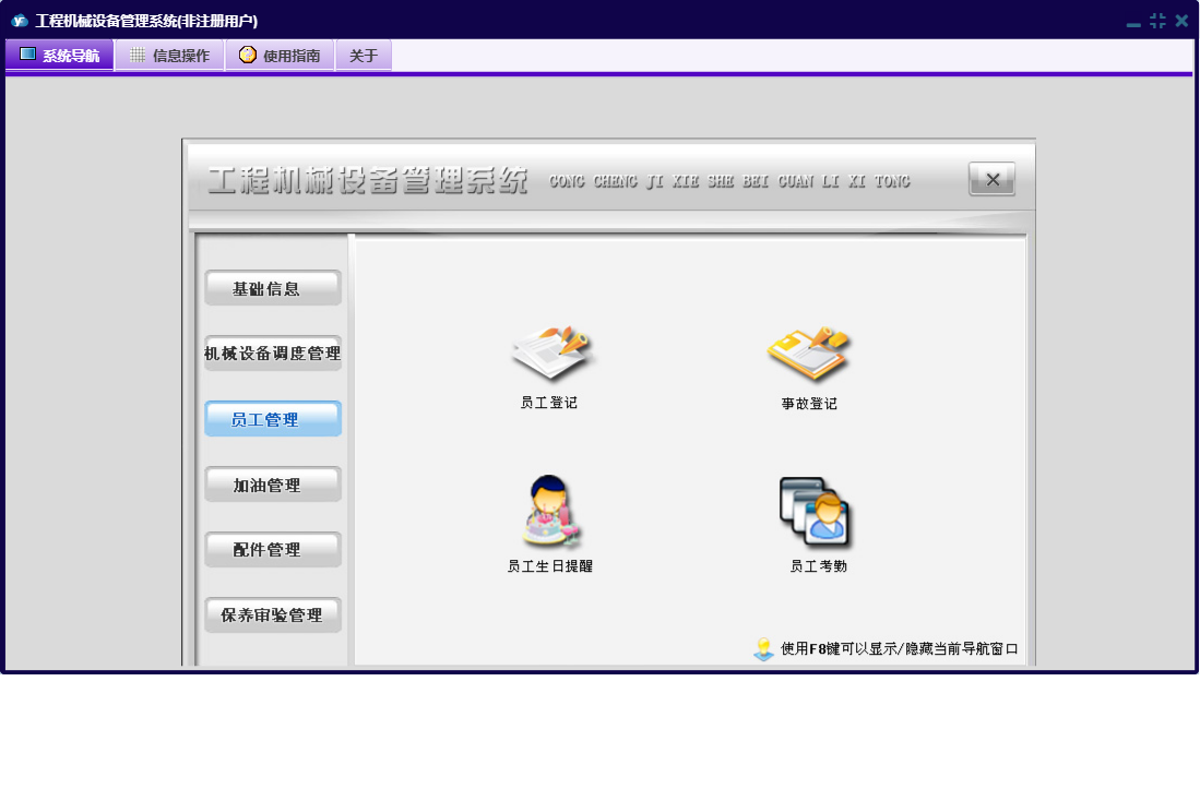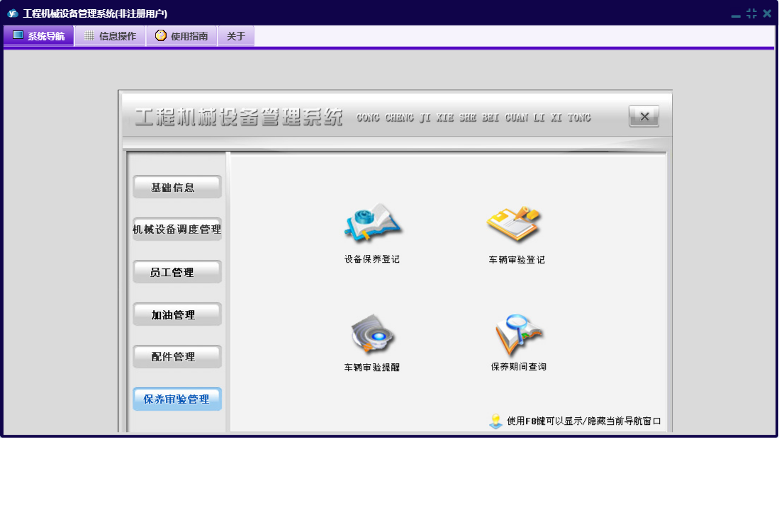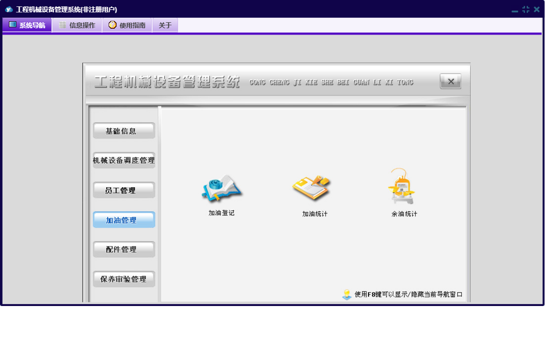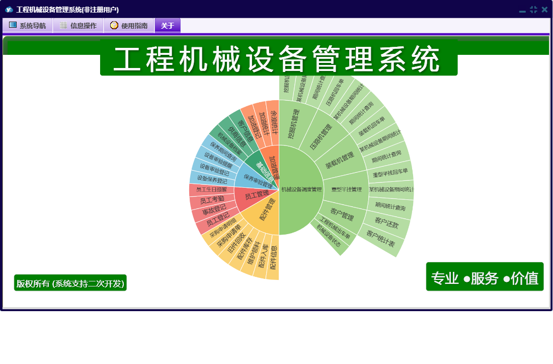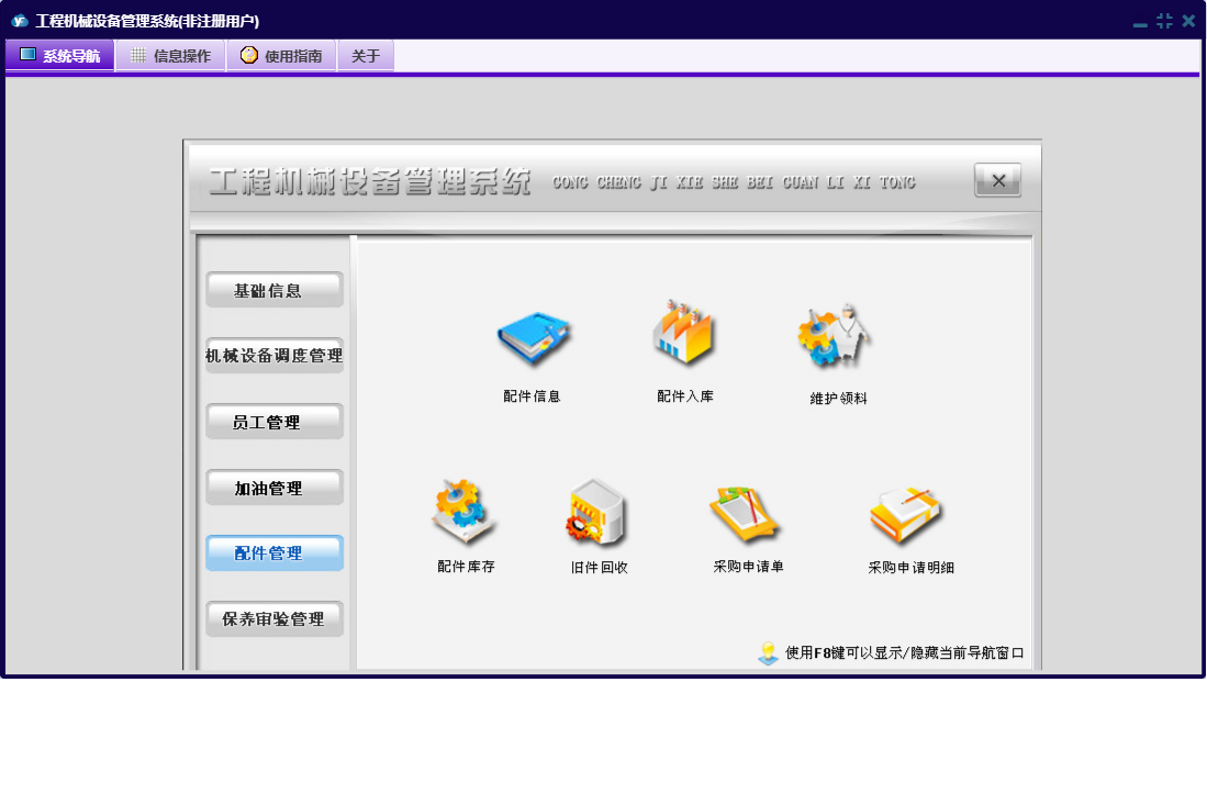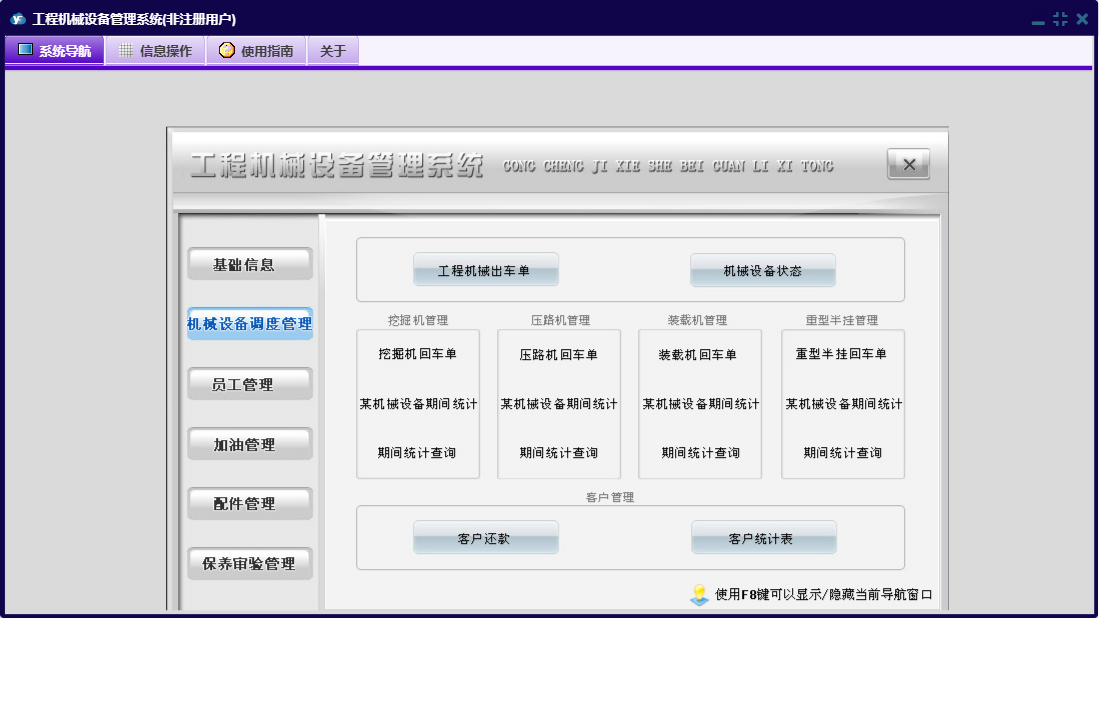 工程机械设备管理系统包含以下功能:旧件回收、挖掘机回车单、采购申请单、员工考勤、加油管理、配件入库、装载机回车单、加油登记、重型半挂回车单、事故登记、保养审验管理、权限设置、设备审验登记、机械设备档案、配件信息、机械设备调度管理、配件管理、压路机回车单、设备保养登记、工程机械出车单、关于、维护领料、客户信息、客户还款、员工登记、员工管理、基础信息、日志、供商信息等