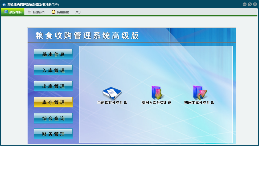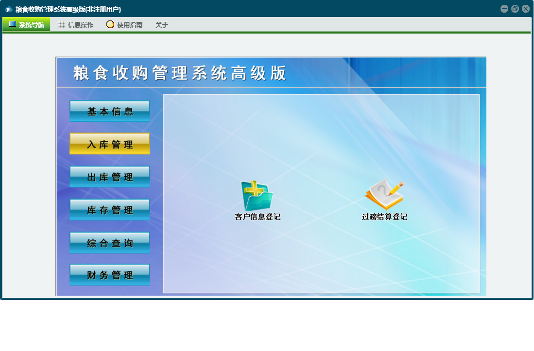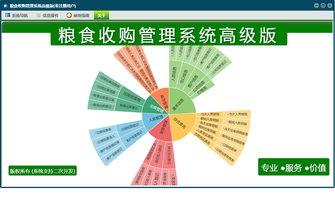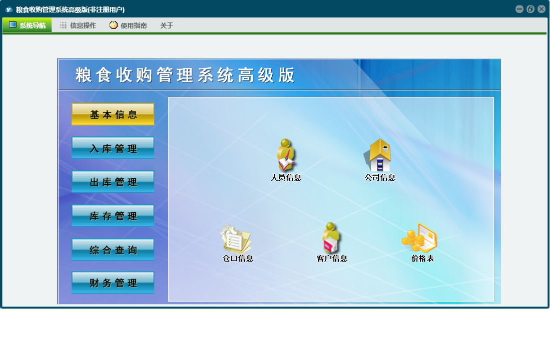 粮食收购管理系统高级版包含以下功能:综合查询、粮食出库登记、财务管理、公司信息、仓口信息、权限设置、出库结算单、出库管理、其它收入登记、库存管理、其它支出登记、关于、客户信息登记、基本信息、客户信息、入库管理、日志、过磅结算登记、人员信息等