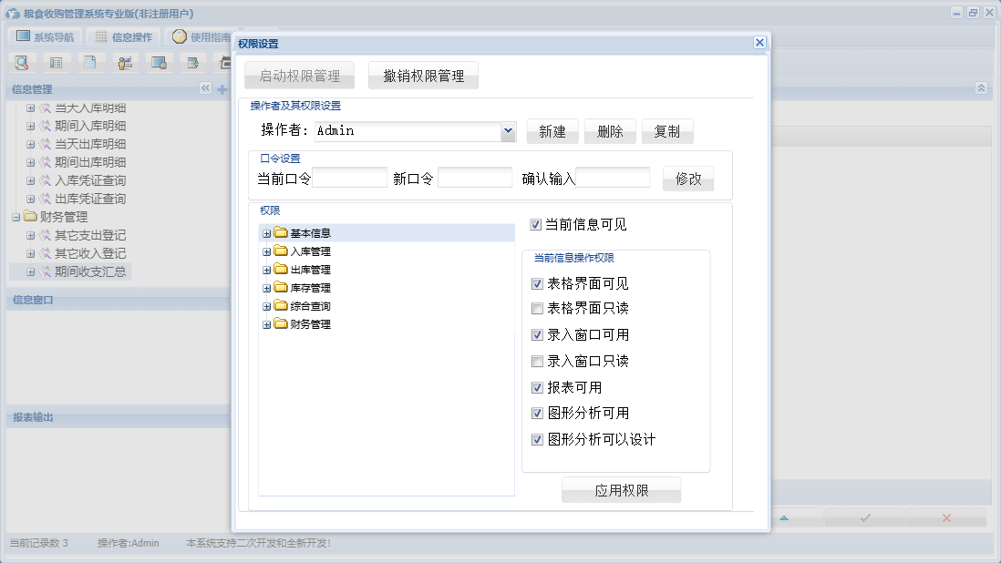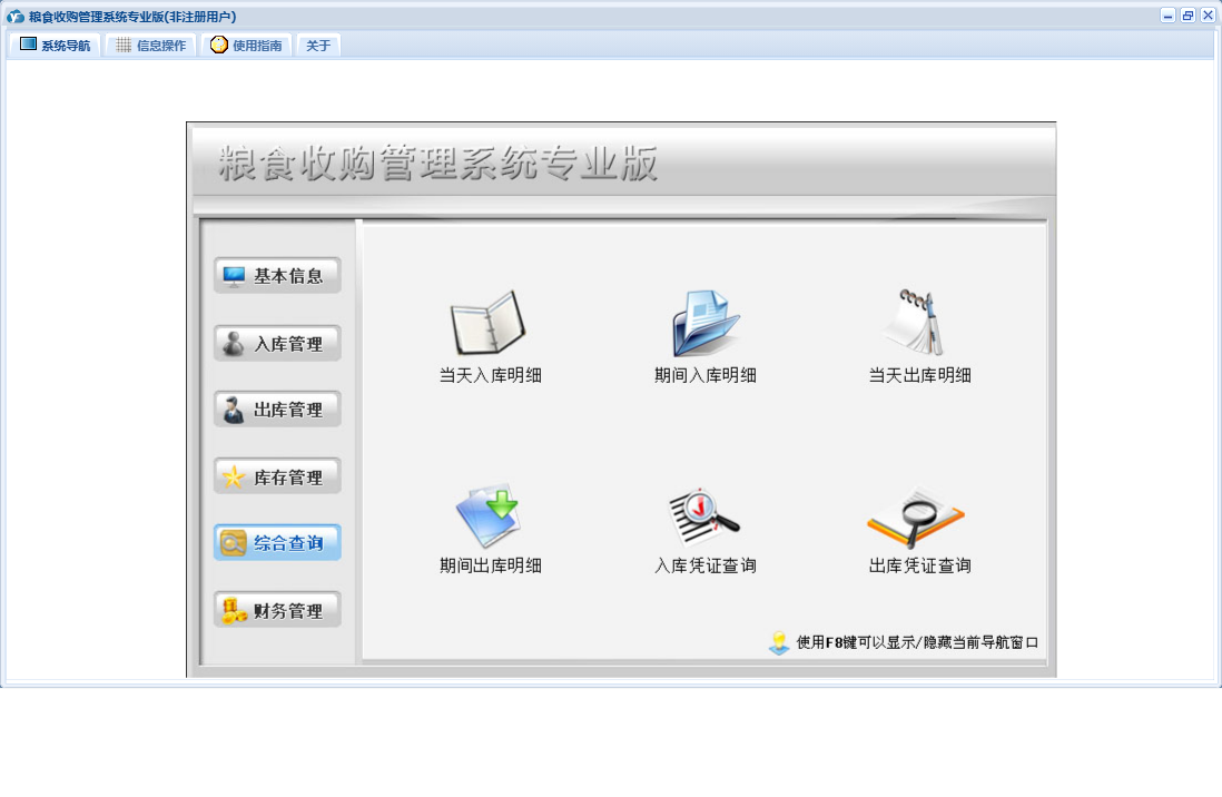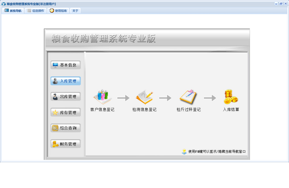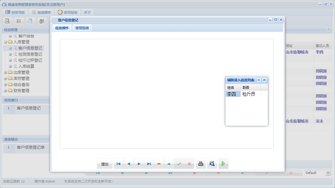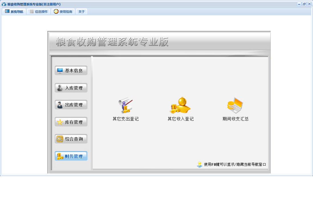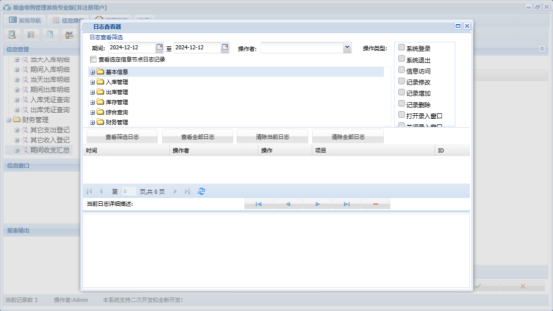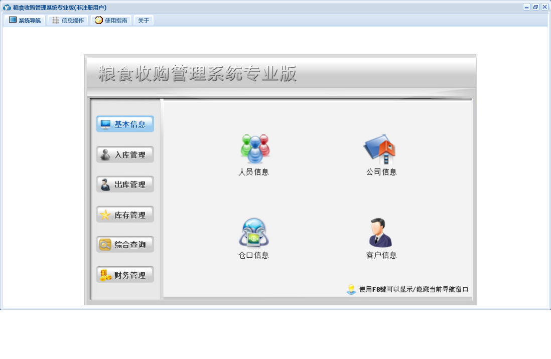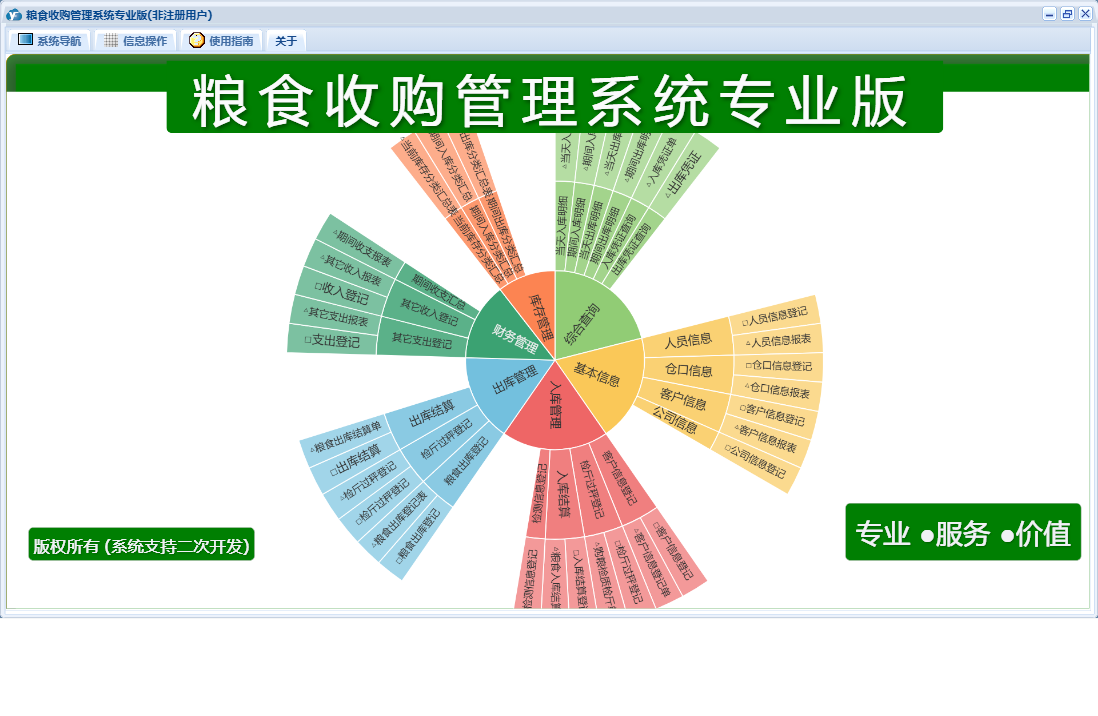 粮食收购管理系统专业版包含以下功能:检测信息登记、综合查询、粮食出库登记、财务管理、公司信息、仓口信息、权限设置、出库管理、其它收入登记、出库结算、库存管理、其它支出登记、关于、客户信息登记、基本信息、客户信息、入库结算、入库管理、日志、检斤过秤登记、人员信息等
