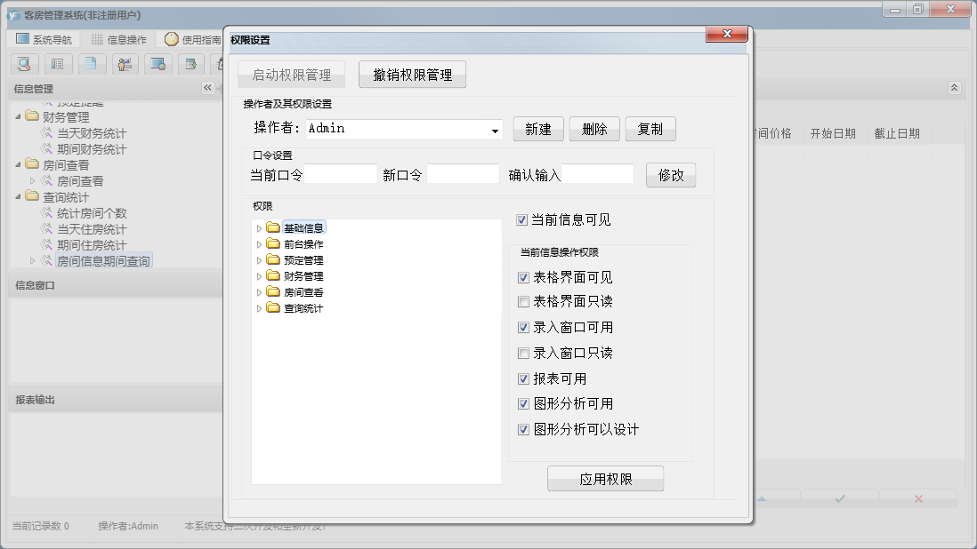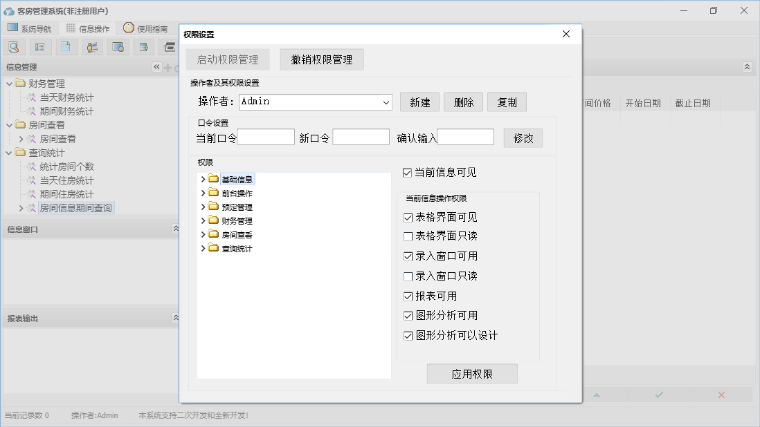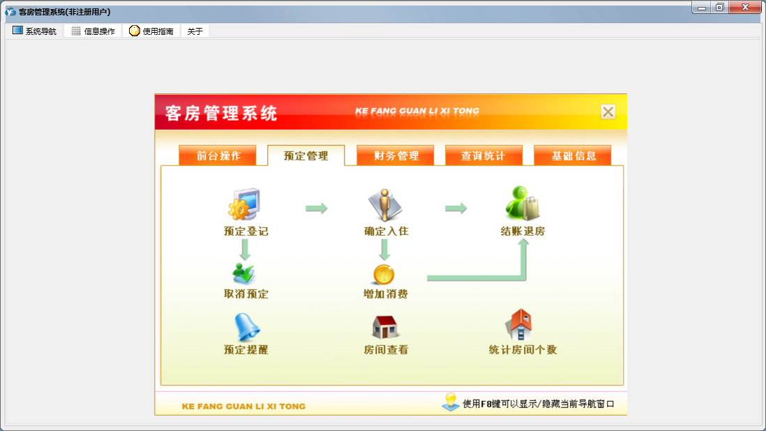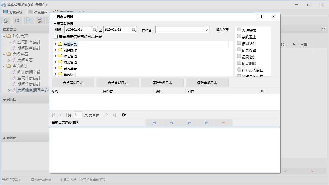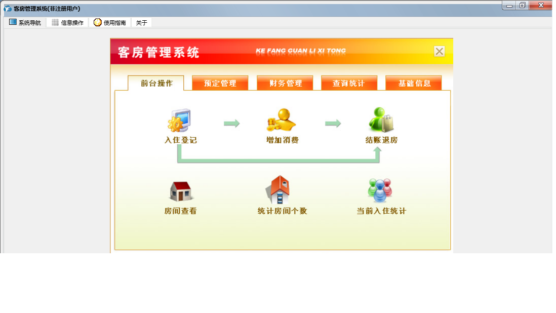 客房管理系统包含以下功能:结账退房、房间查看、确定入住、状态图示、日志窗口 (1)、客房信息登记、消费物品设置、财务管理、入住登记、打折设置、权限设置、统计查询、前台操作、权限设置窗口 (1)、预定管理、关于、增加消费、基础信息、解除预定、日志、预定登记等