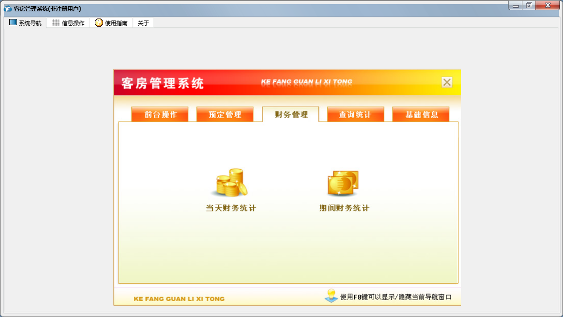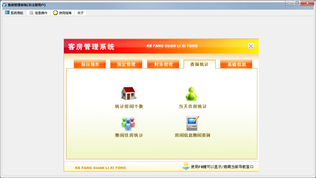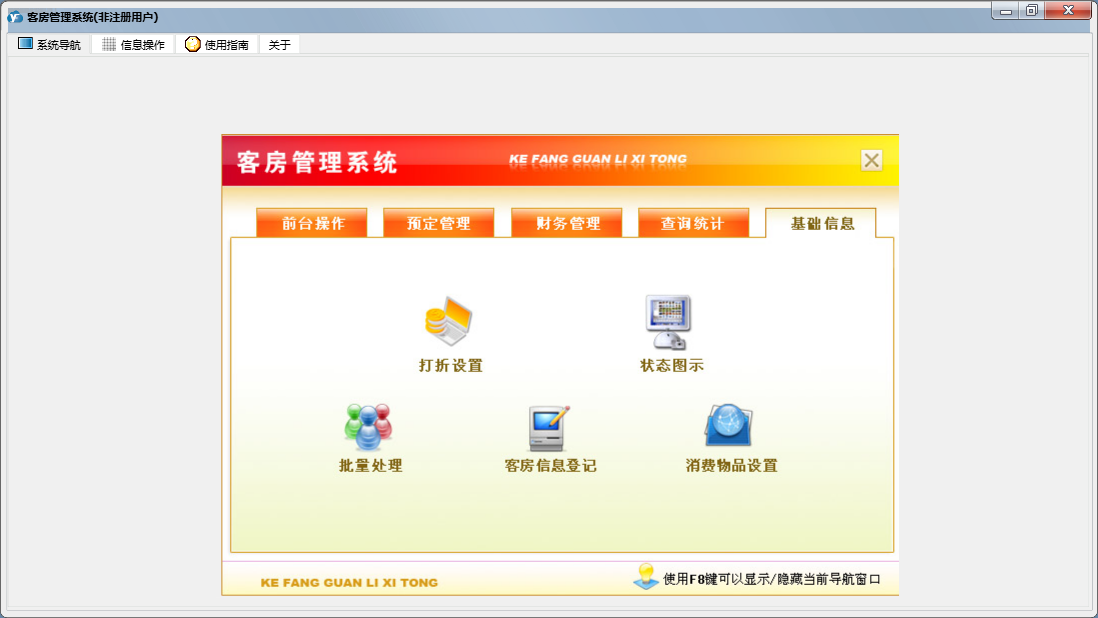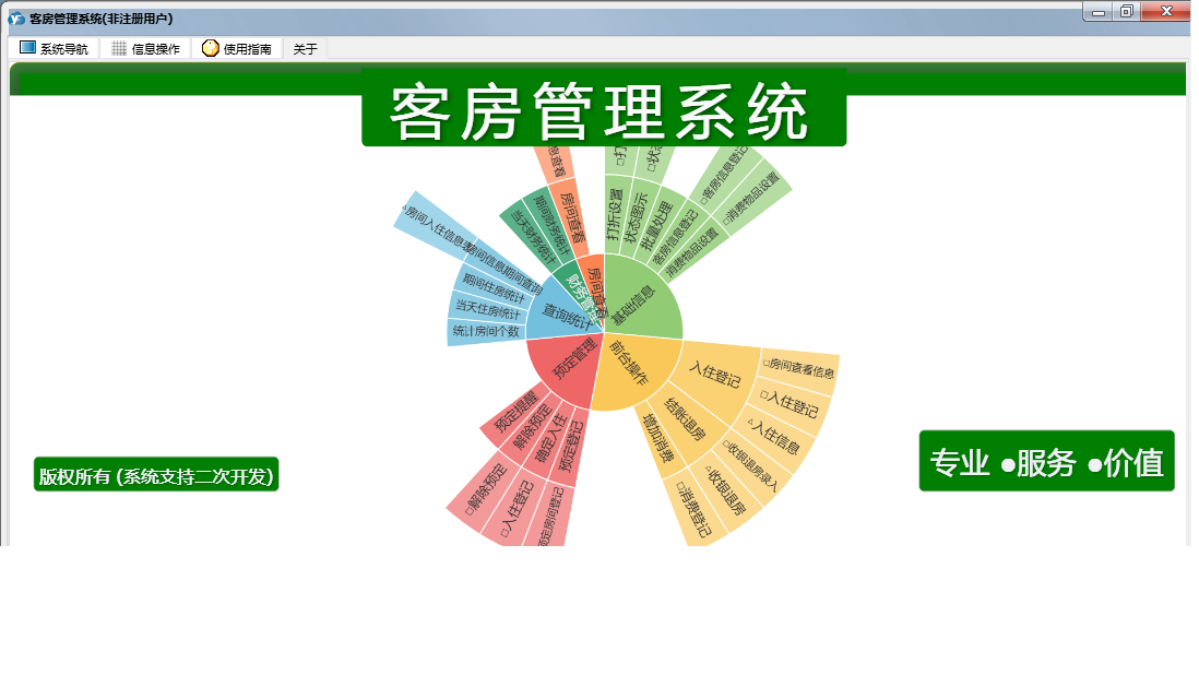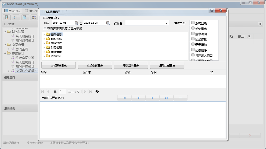 客房管理系统包含以下功能:结账退房、房间查看、确定入住、状态图示、日志窗口 (1)、客房信息登记、消费物品设置、财务管理、入住登记、打折设置、权限设置、统计查询、前台操作、权限设置窗口 (1)、预定管理、关于、增加消费、基础信息、解除预定、日志、预定登记等