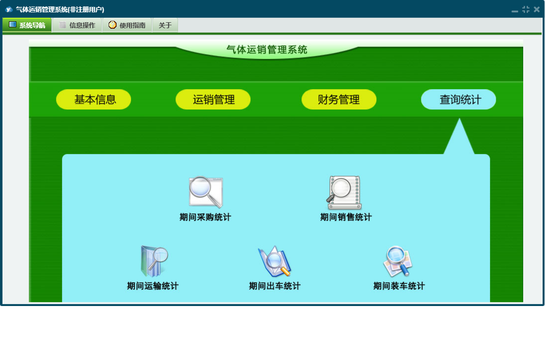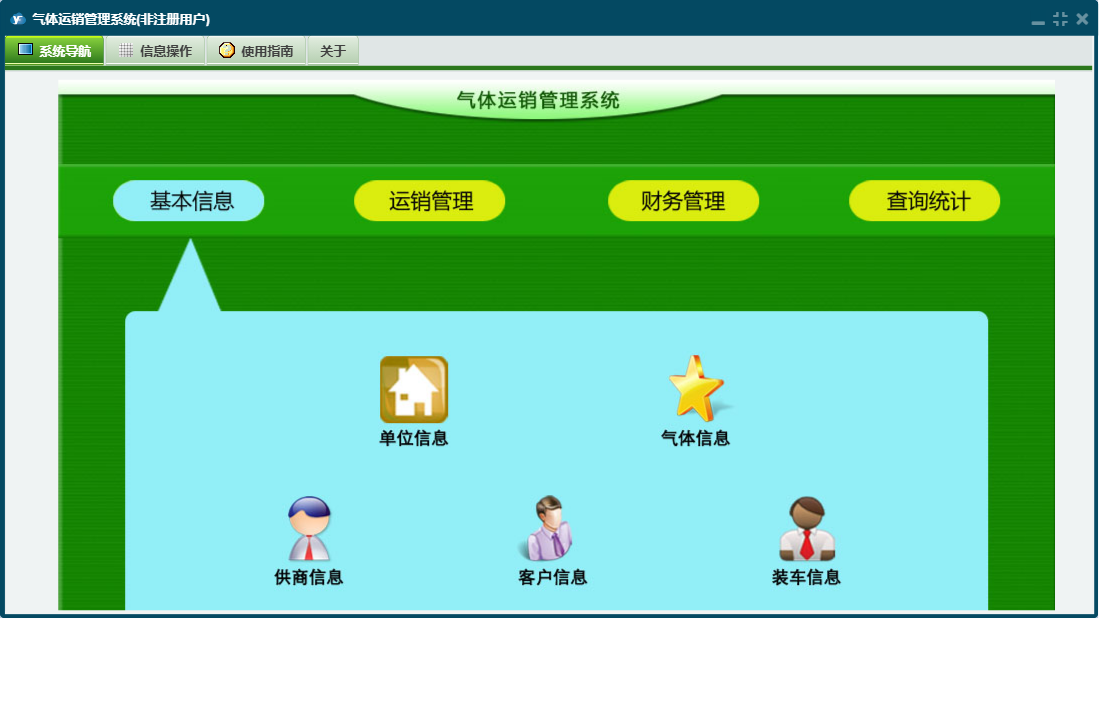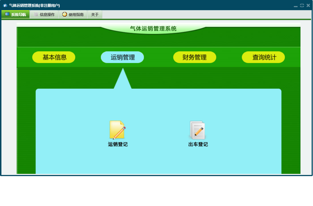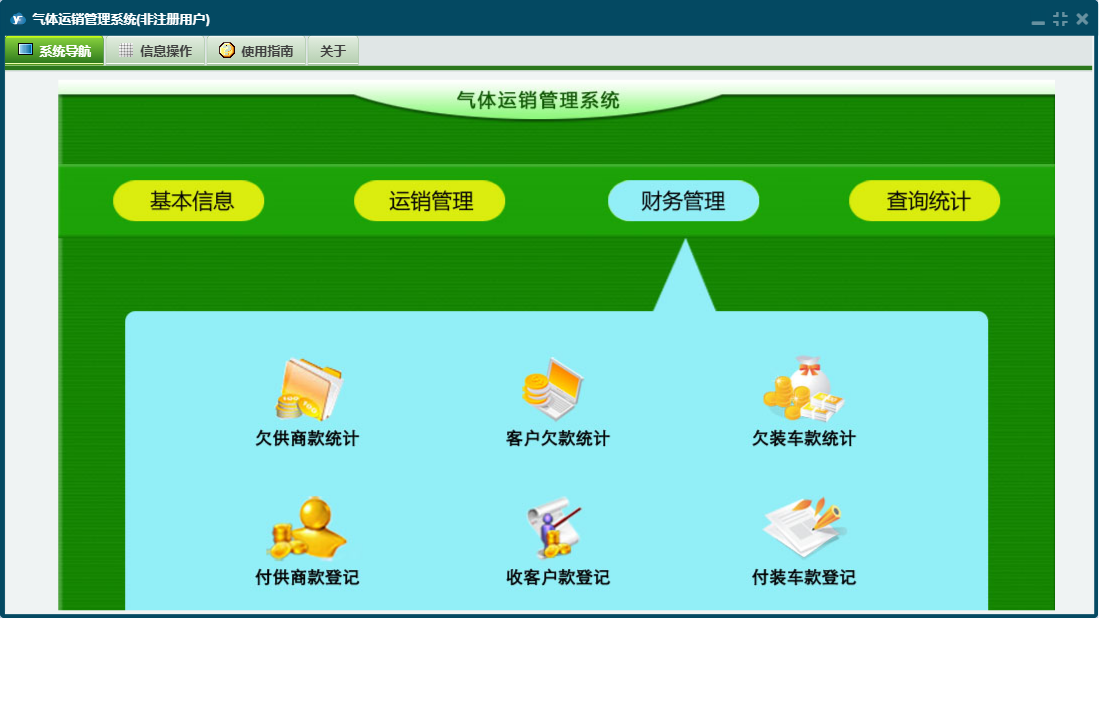 气体运销管理系统包含以下功能:付装车款登记、查询统计、供商信息、收客户款登记、运销管理、日志、付供商款登记、关于、基本信息、权限设置、客户信息、财务管理、运销登记、装车信息等