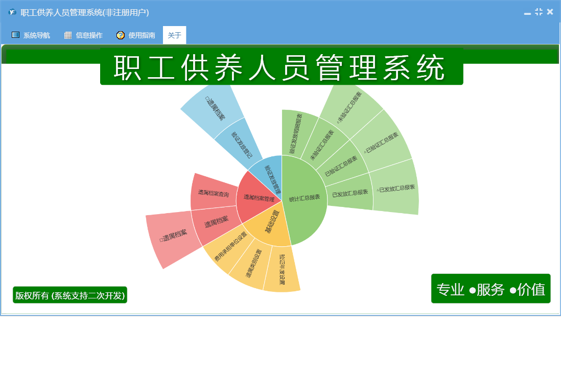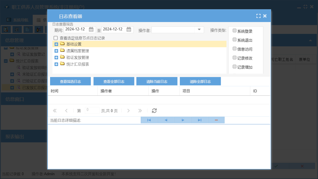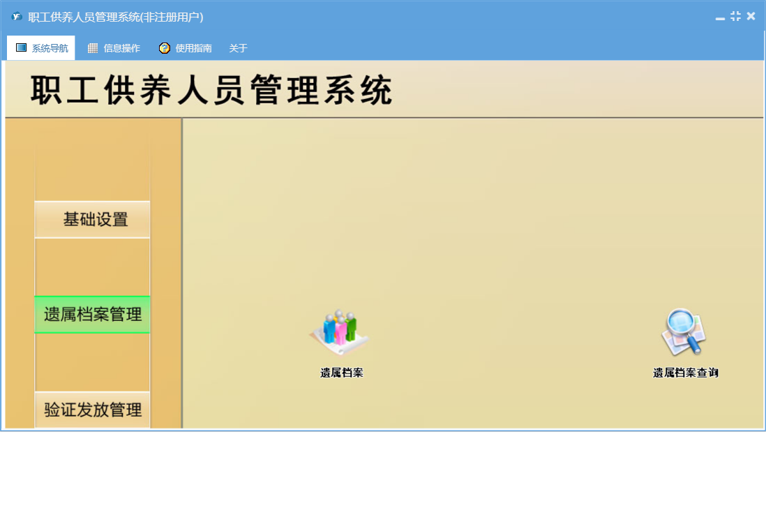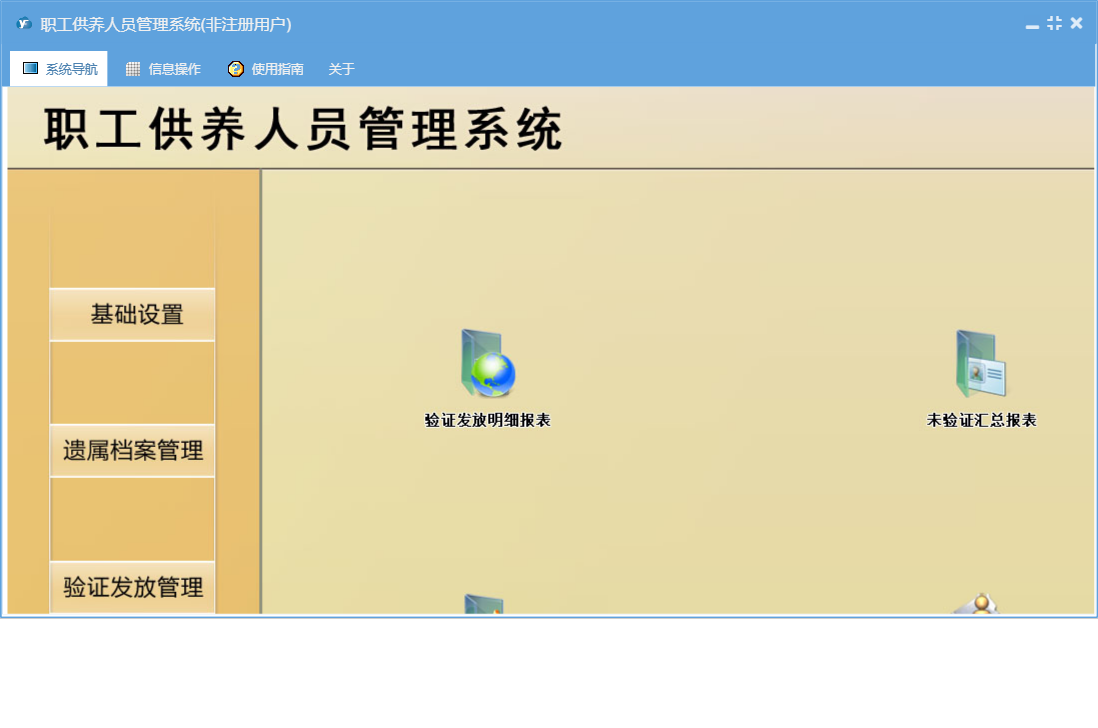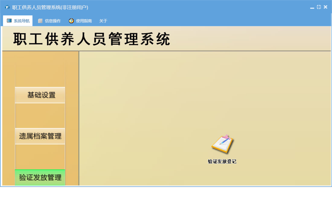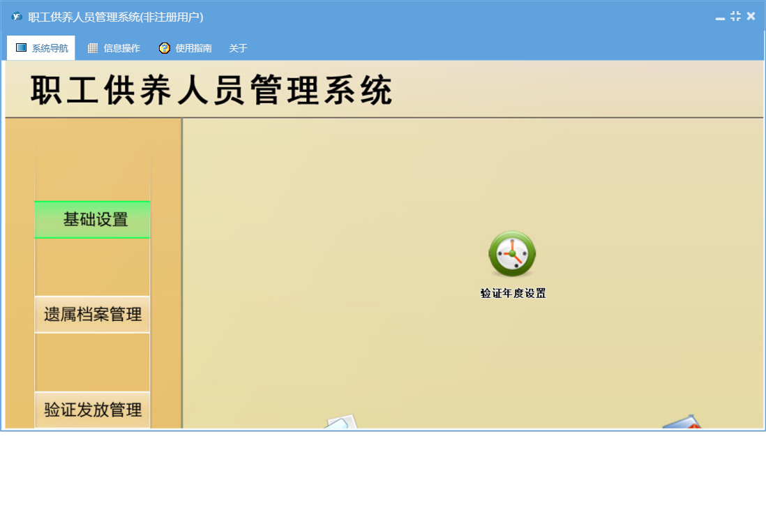 职工供养人员管理系统包含以下功能:基础设置、验证发放登记、遗属档案、日志、关于、权限设置、验证发放管理、统计汇总、遗属档案管理等