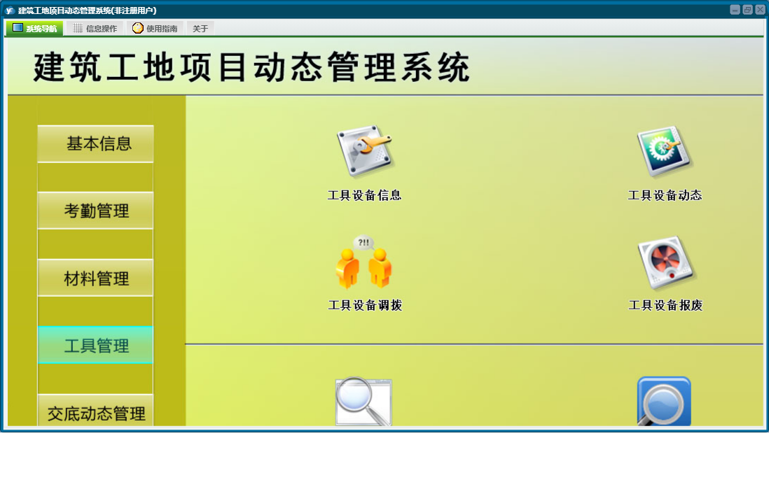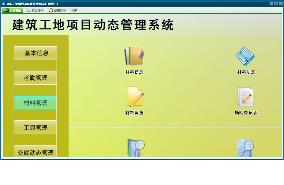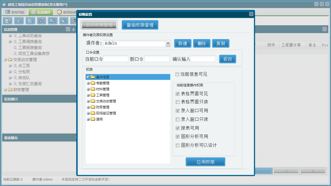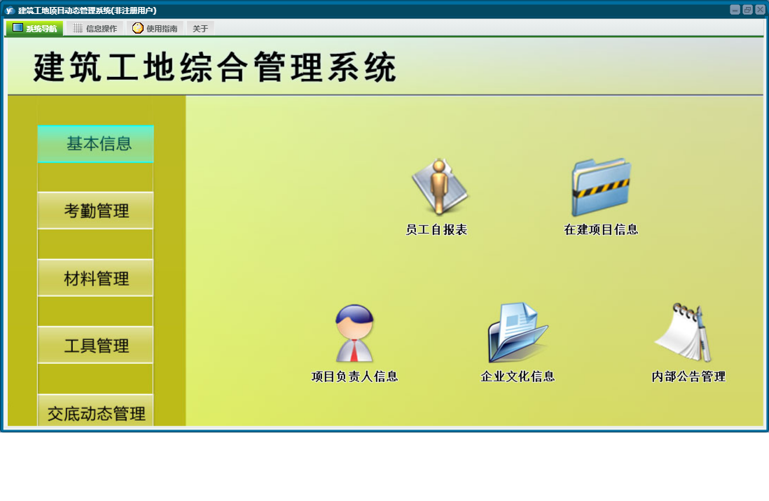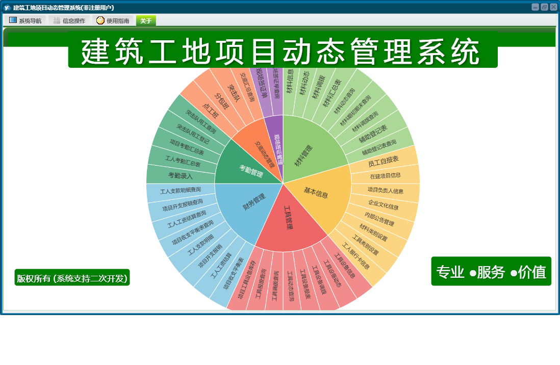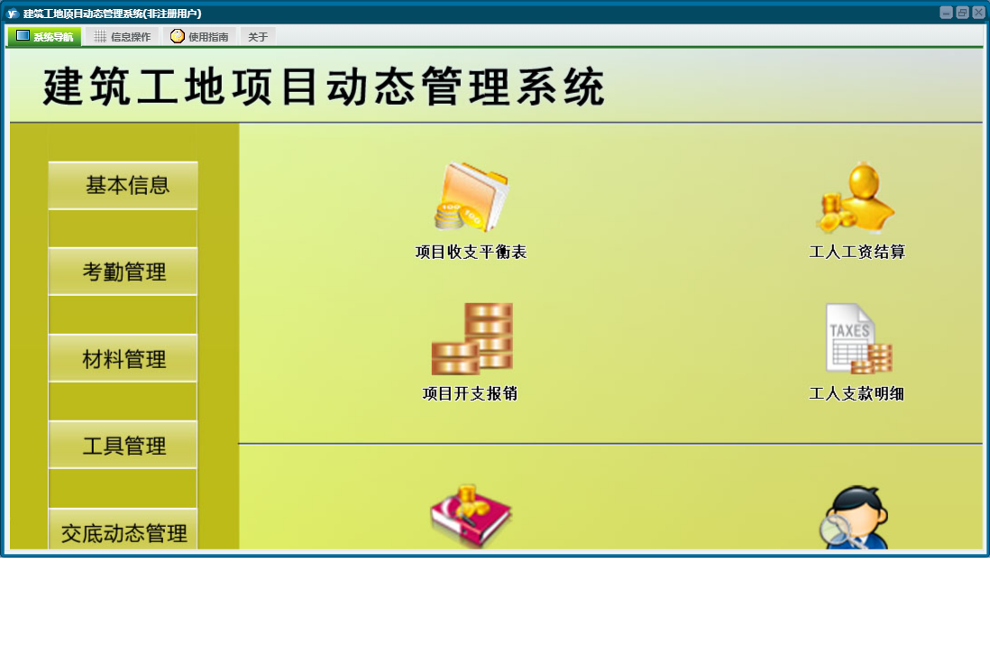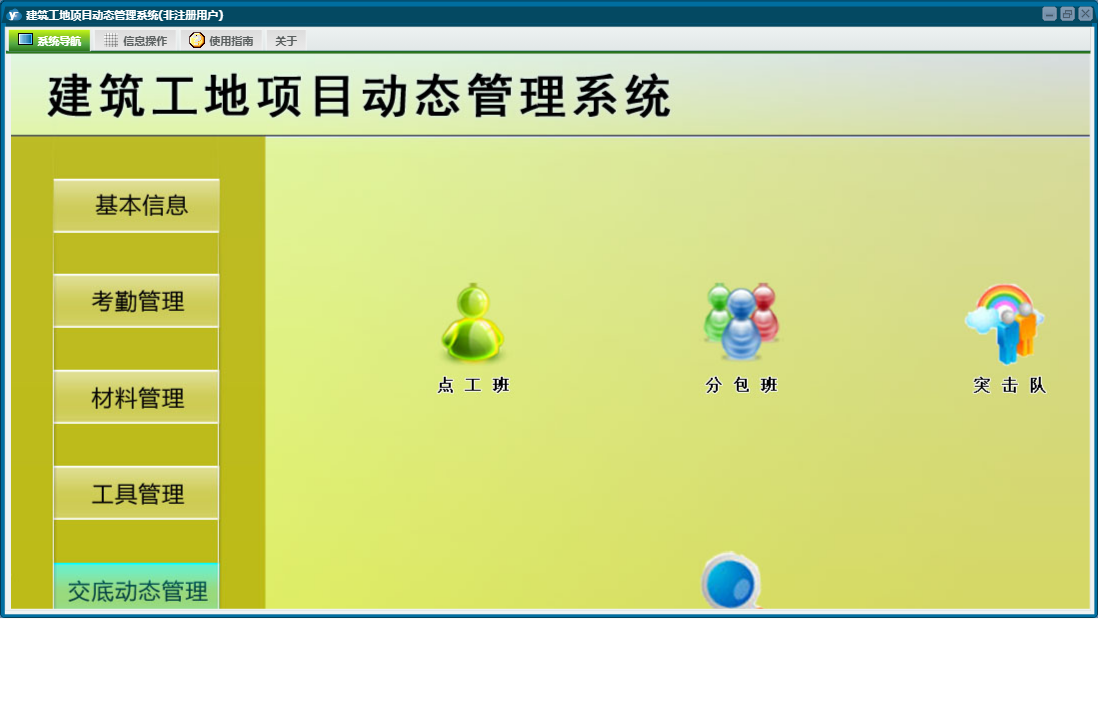 建筑工地项目动态管理系统包含以下功能:项目开支报销、现场签证管理、材料动态、考勤管理、项目负责人信息、财务管理、工具设备报废、工具设备调拨、交底动态管理、材料信息、点工班、权限设置、分包班、辅助登记表、工具设备动态、工具管理、现场签证单、员工自、材料调拨、在建项目信息、考勤录入、关于、企业文化信息、材料管理、突击队用工登记、基本信息、项目收支平衡表、工人工资结算、工人支款明细、日志、内部公告管理、突击队、工具设备信息等