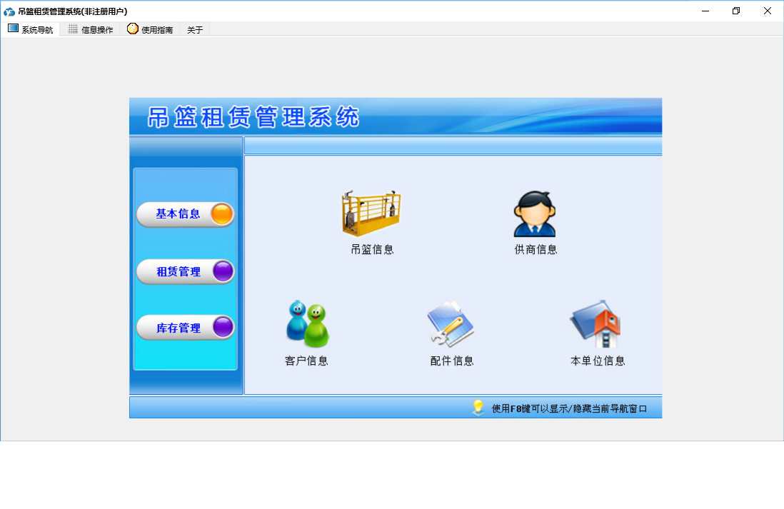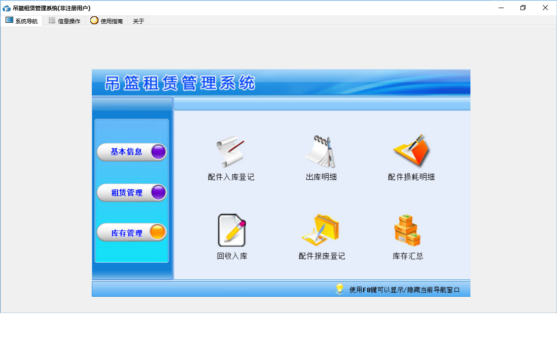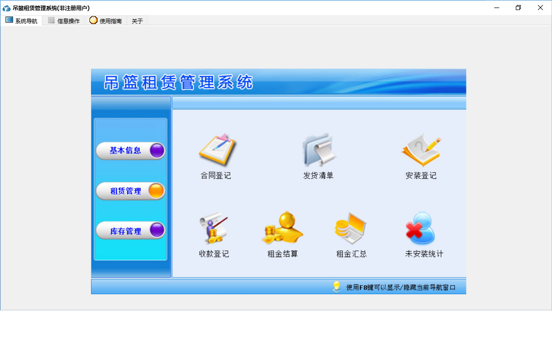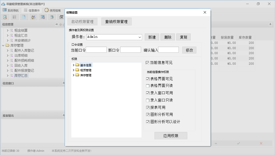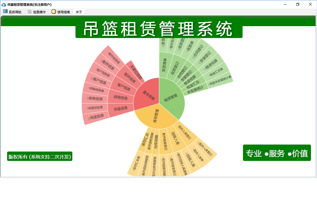 吊篮租赁管理系统包含以下功能:租金结算、配件入库登记、配件报废登记、安装登记、库存管理、日志、回收入库、关于、合同登记、租赁管理、基本信息、权限设置、客户信息、收款登记、发货清单、吊篮信息、配件信息、供商信息等