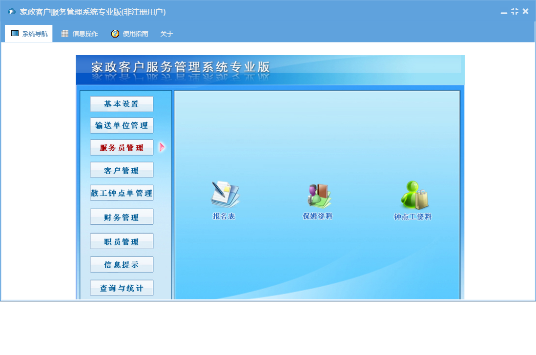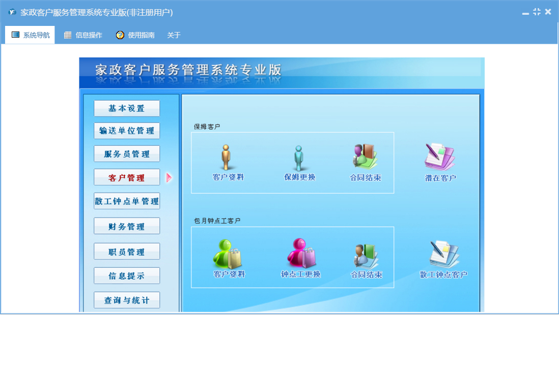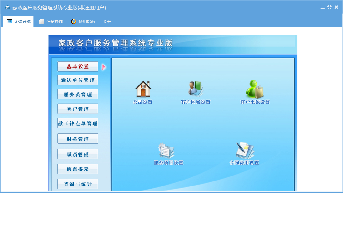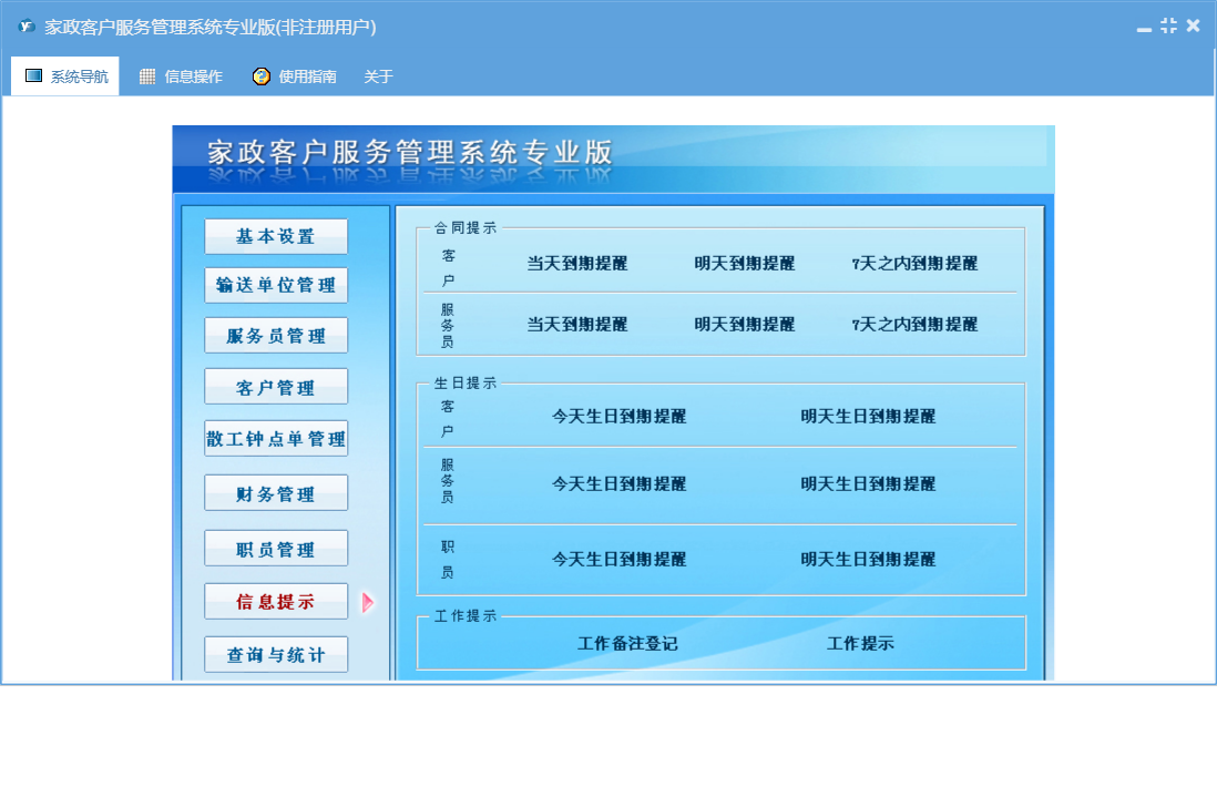家政客户服务管理系统专业版包含以下功能:基本设置、钟点工资料、潜在客户、收支管理、保姆更换、合同结束、客户来源设置、输送单位资料、工作提示、客户管理、权限设置、散工钟点客户、信息提示、保姆资料、工作备注登记、散工交单管理、服务项目设置、服务员管理、费用名称、职员信息、合同费用设置、关于、客户区域设置、职员管理、应付输送单位管理、客户资料、钟点工更换、散工钟点单、输送费支付管理、日志、散工交单确认、公司设置、报名表、输送单位、查询与统计等