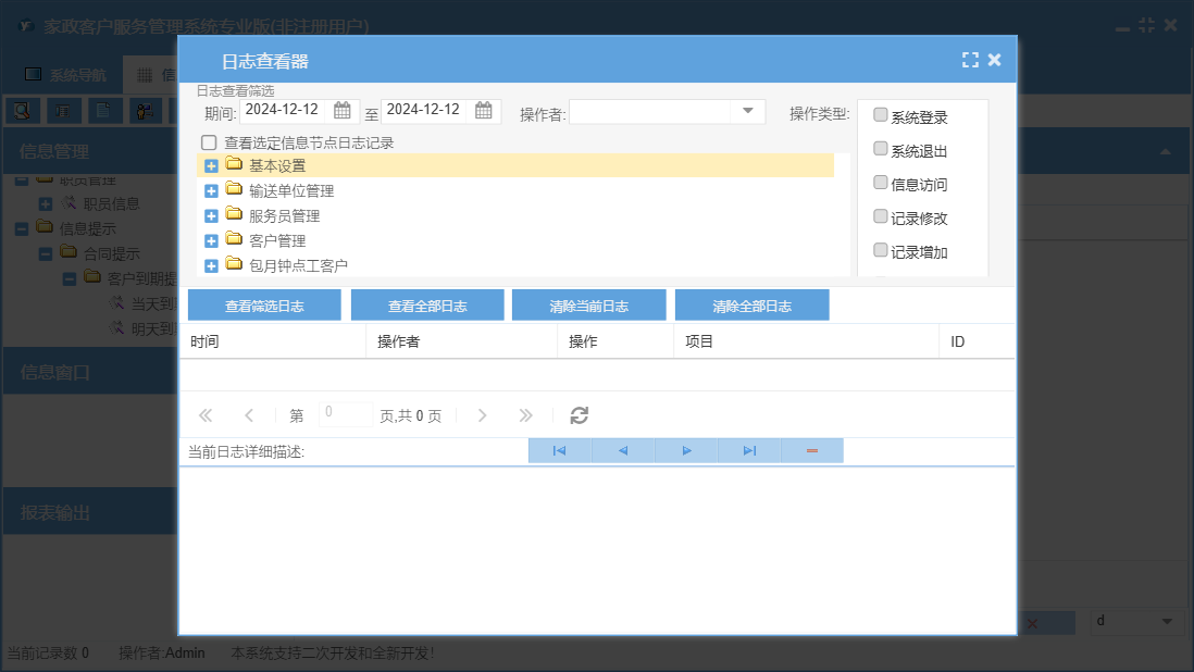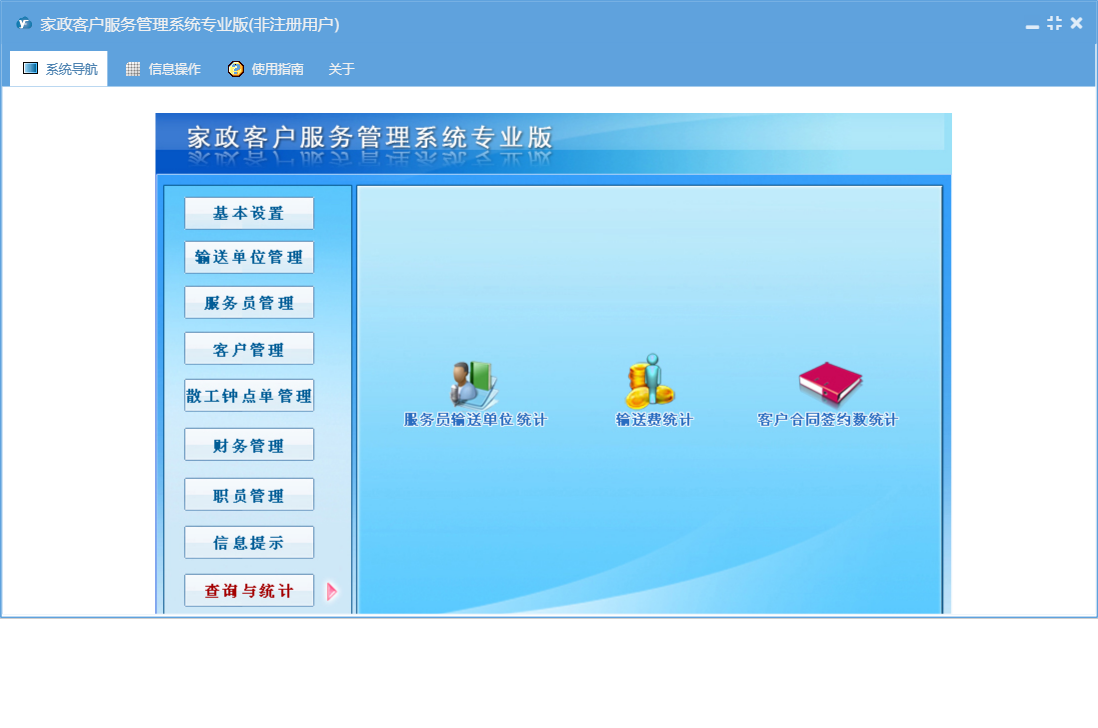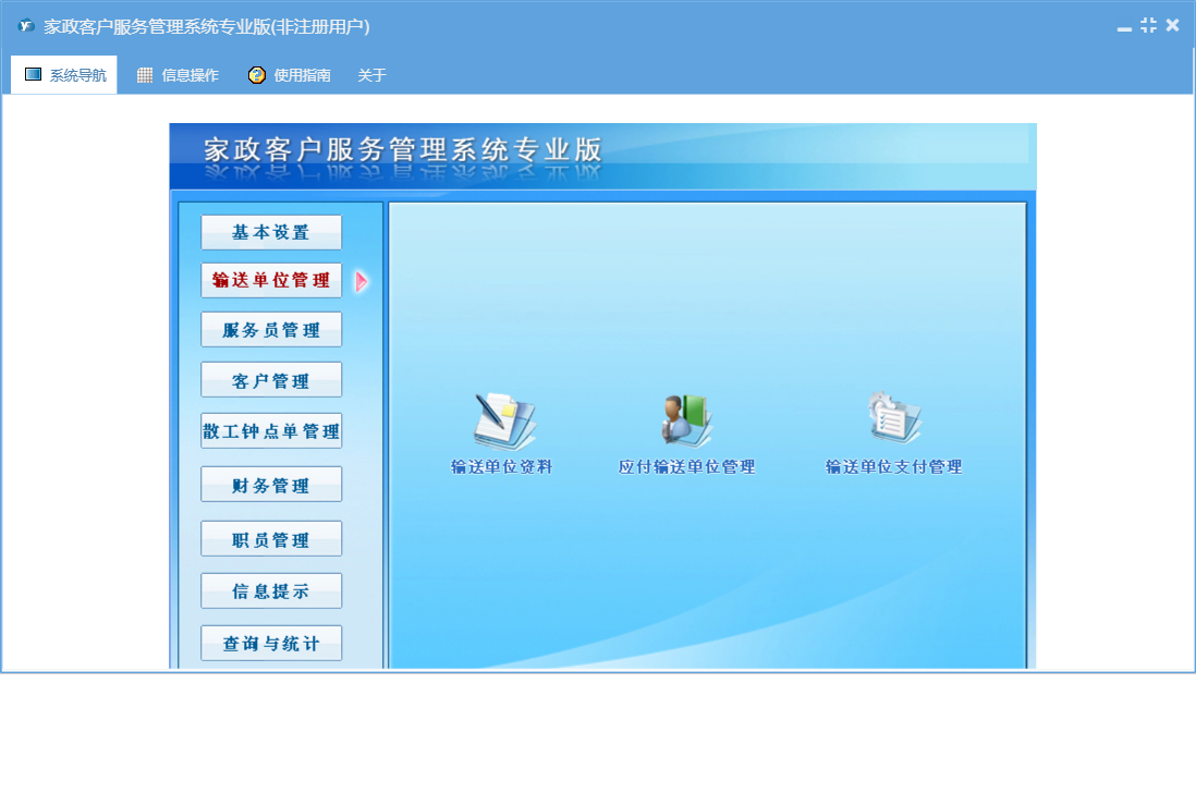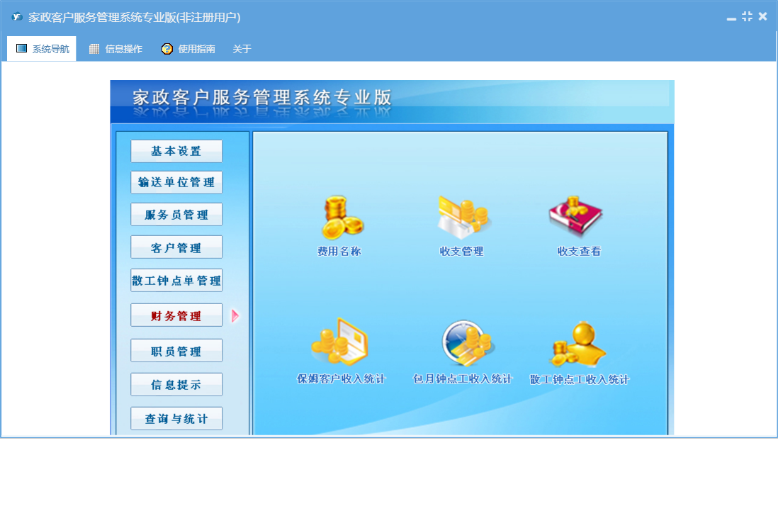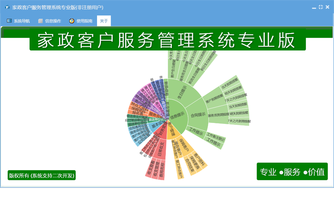家政客户服务管理系统专业版包含以下功能:基本设置、钟点工资料、潜在客户、收支管理、保姆更换、合同结束、客户来源设置、输送单位资料、工作提示、客户管理、权限设置、散工钟点客户、信息提示、保姆资料、工作备注登记、散工交单管理、服务项目设置、服务员管理、费用名称、职员信息、合同费用设置、关于、客户区域设置、职员管理、应付输送单位管理、客户资料、钟点工更换、散工钟点单、输送费支付管理、日志、散工交单确认、公司设置、报名表、输送单位、查询与统计等