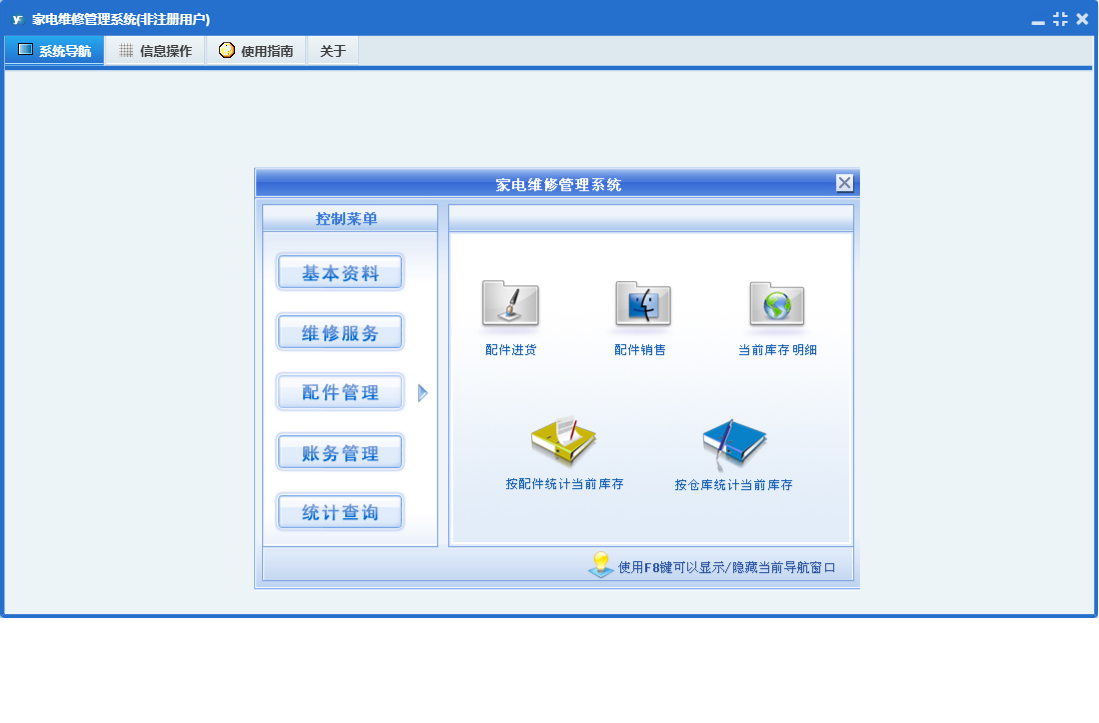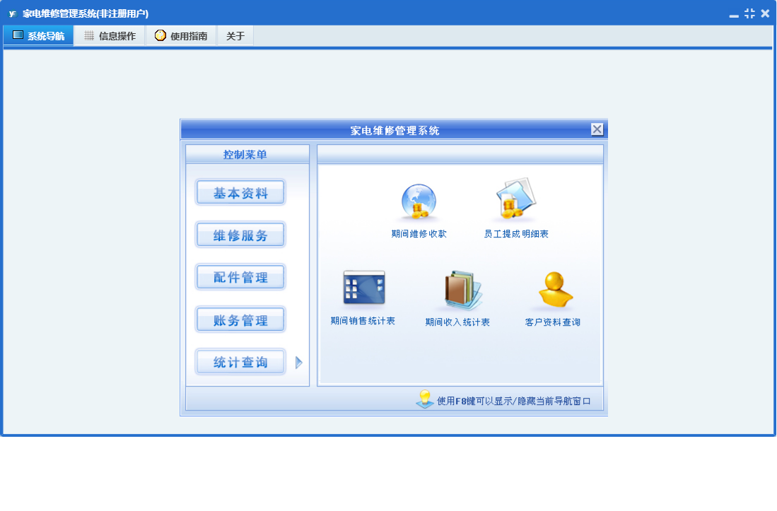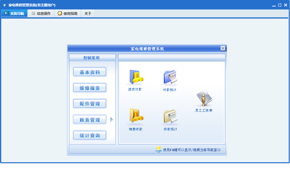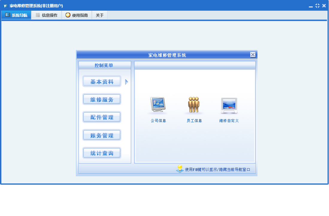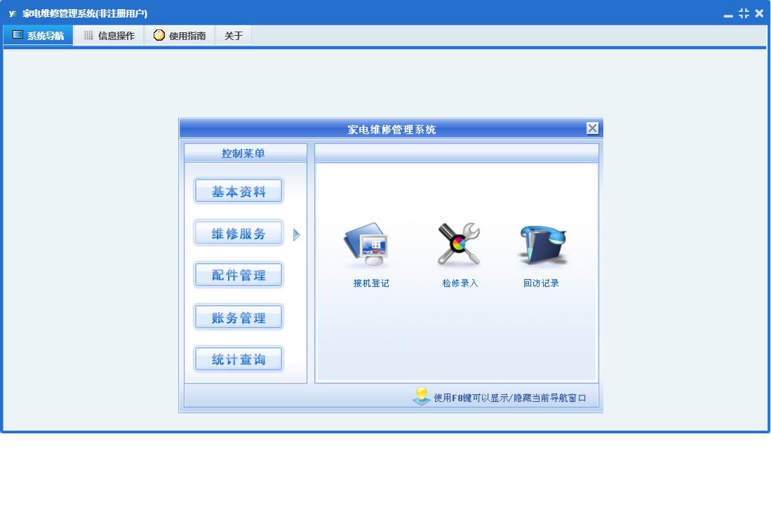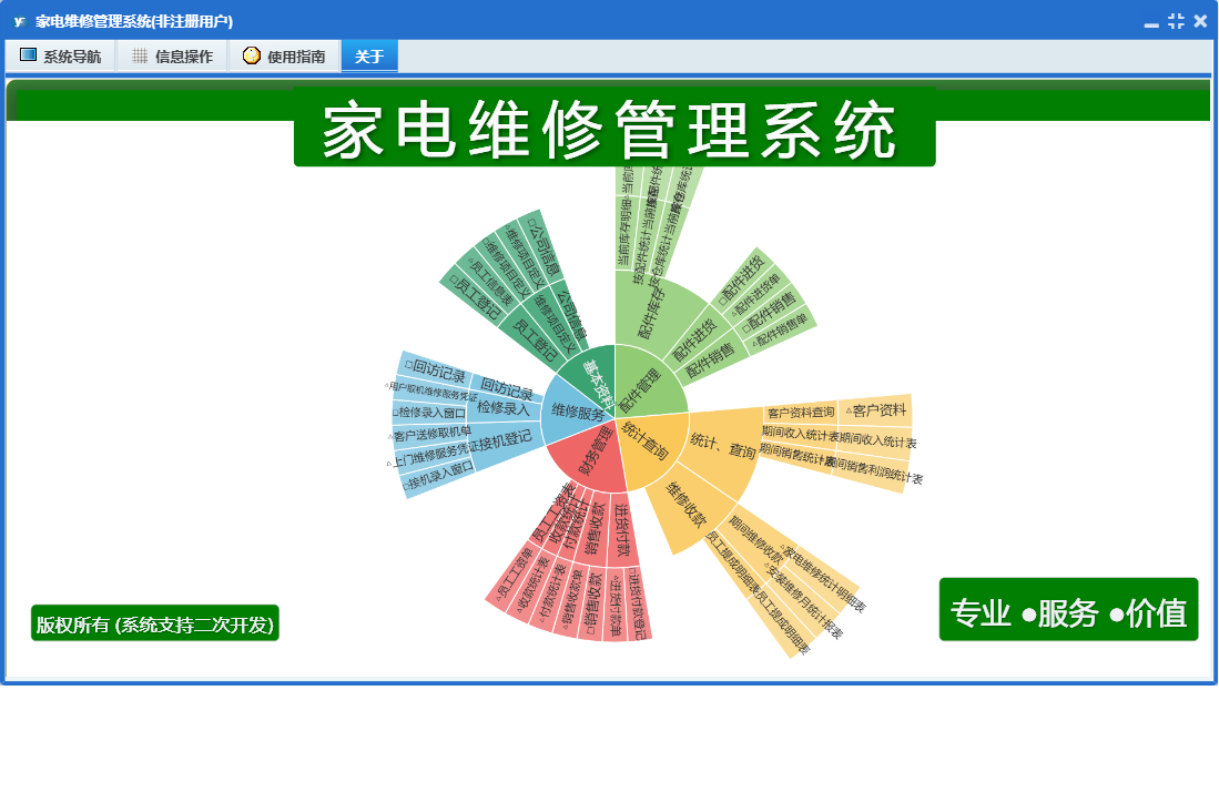 家电维修管理系统包含以下功能:接机登记、员工登记、基本资料、配件管理、配件进货、配件销售、进货付款、维修服务、公司信息、日志、销售收款、维修项目定义、关于、回访记录、权限设置、统计查询、检修录入、财务管理等