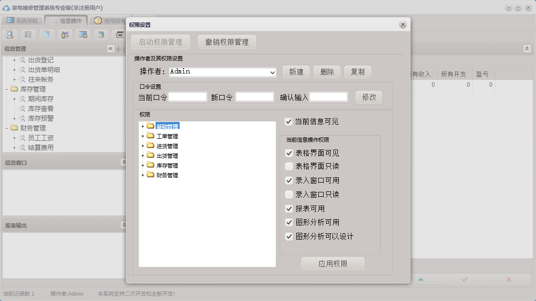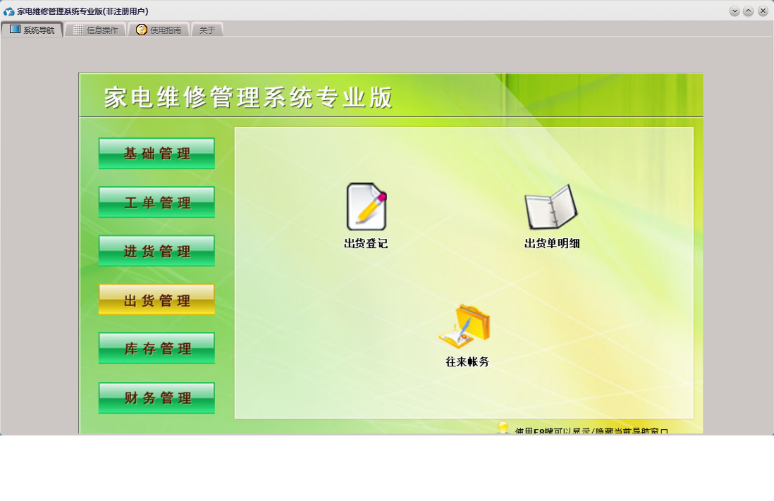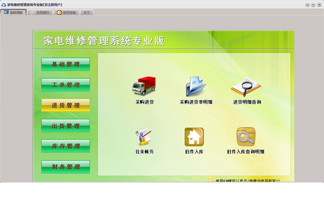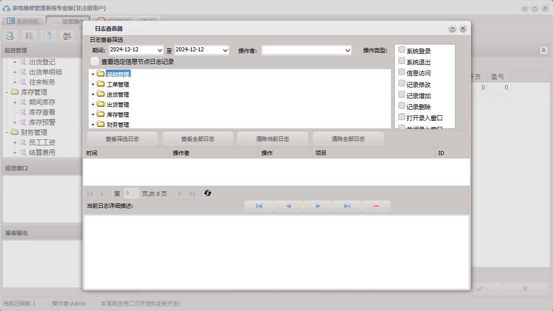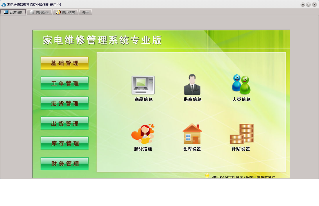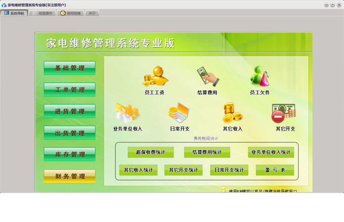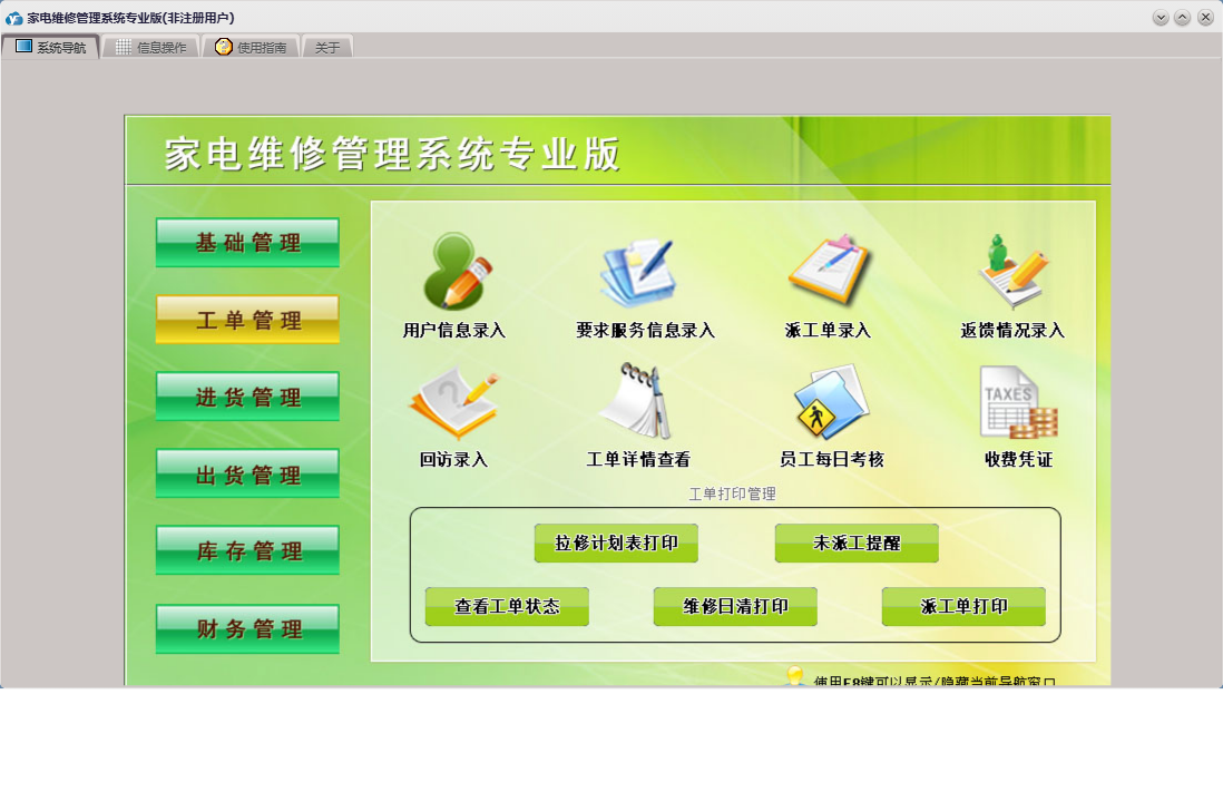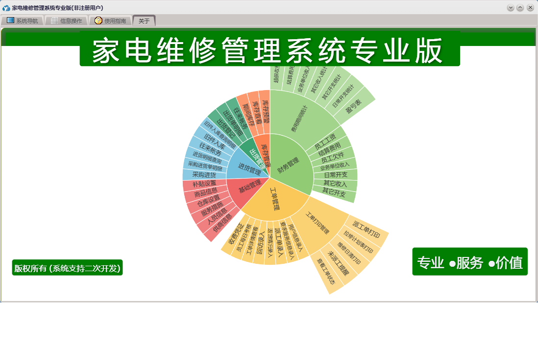家电维修管理系统专业版包含以下功能:日常开支、用户信息录入、其它开支、派工单录入、结算费用、财务管理、回访录入、仓库设置、补贴设置、服务措施、采购进货、商品信息、旧件入库、权限设置、员工工资、出货登记、库存管理、关于、要求服务信息录入、返馈情况录入、基础管理、其它收入、出货管理、进货管理、业务单位收入、日志、员工每日考核、工单管理、供商信息、人员信息等