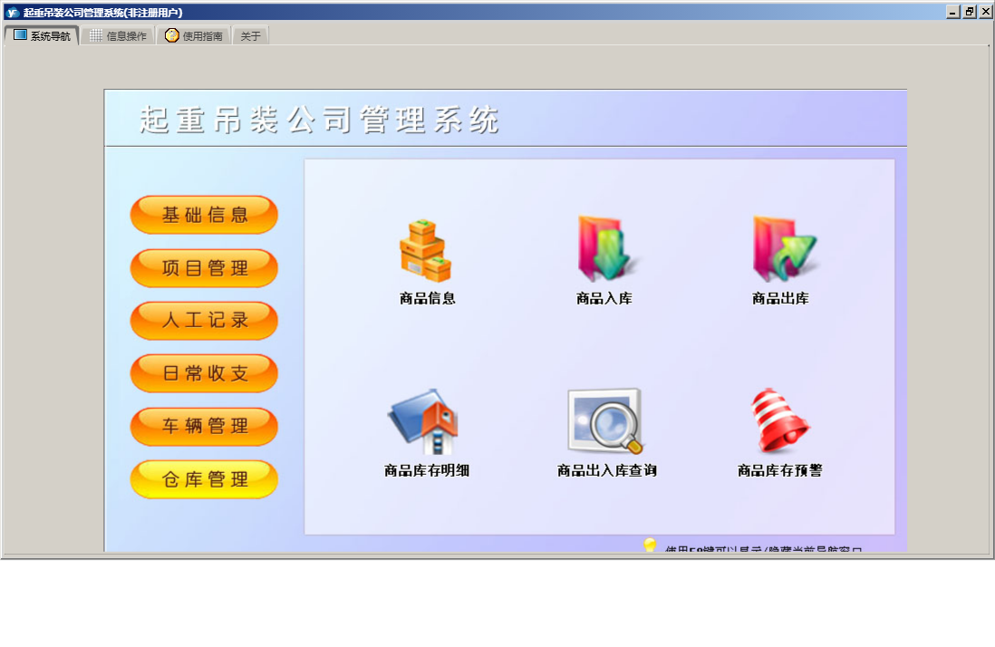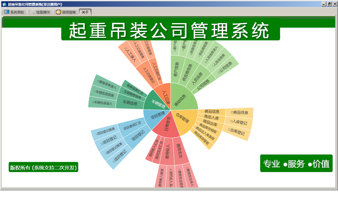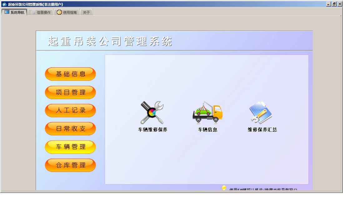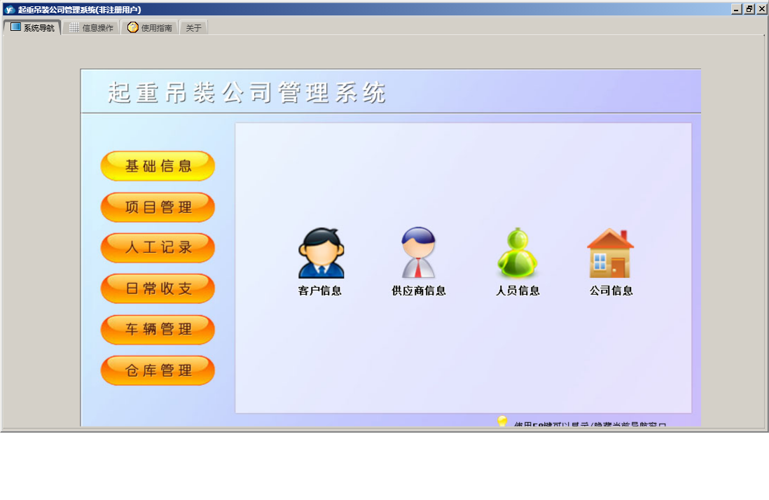 起重吊装公司管理系统包含以下功能:车辆管理、项目查询汇总、费用收入、商品信息、公司信息、权限设置、商品出库、商品入库、供应商信息、费用支出、日常收支、仓库管理、关于、客户信息、车辆信息、基础信息、项目登记、日志、人工记录登记、人工记录、车辆维修保养、项目管理、人员信息等