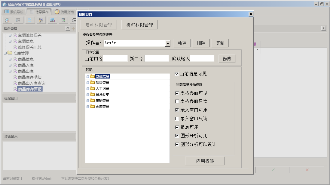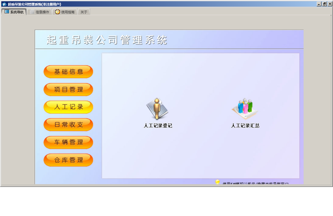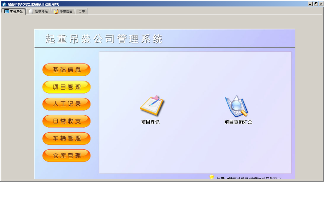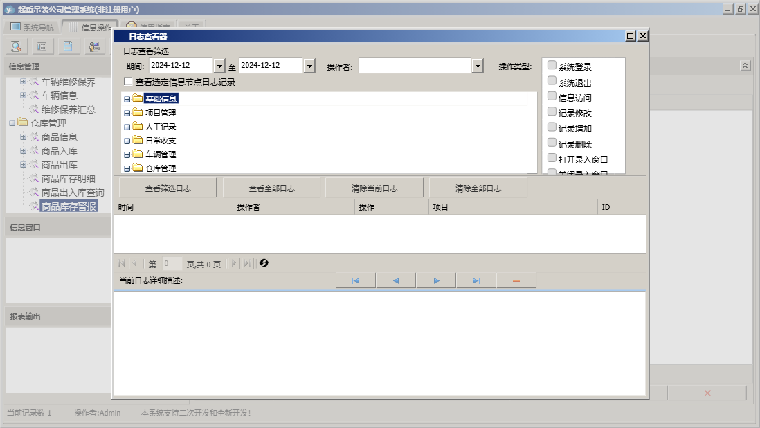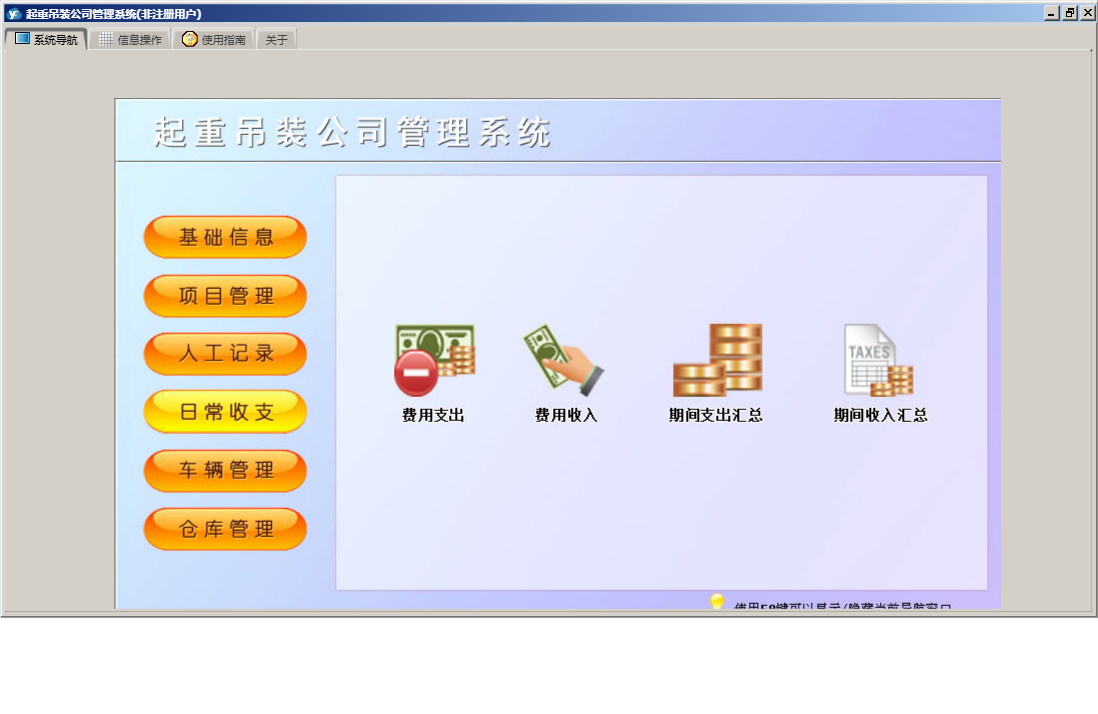 起重吊装公司管理系统包含以下功能:车辆管理、项目查询汇总、费用收入、商品信息、公司信息、权限设置、商品出库、商品入库、供应商信息、费用支出、日常收支、仓库管理、关于、客户信息、车辆信息、基础信息、项目登记、日志、人工记录登记、人工记录、车辆维修保养、项目管理、人员信息等