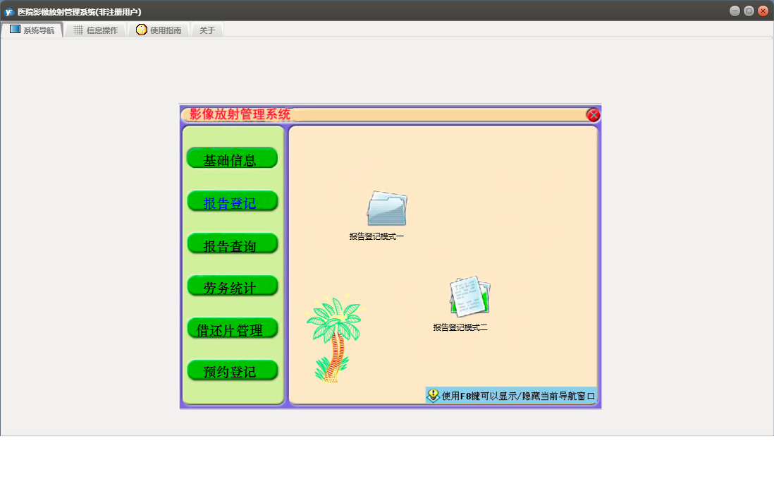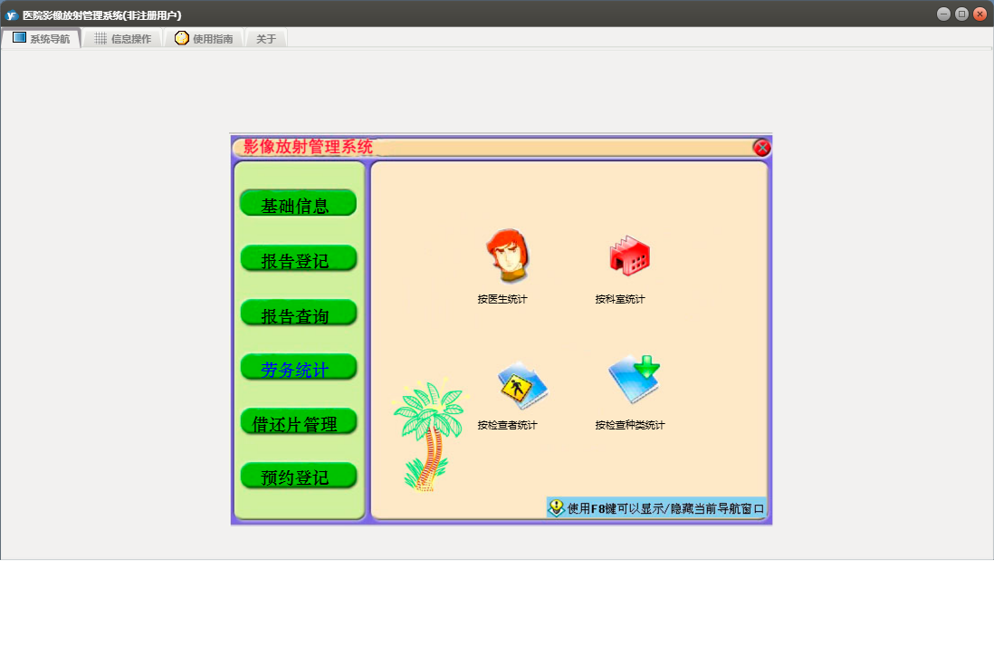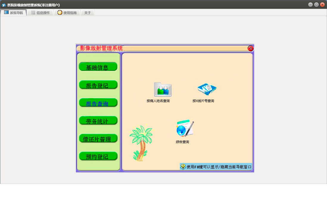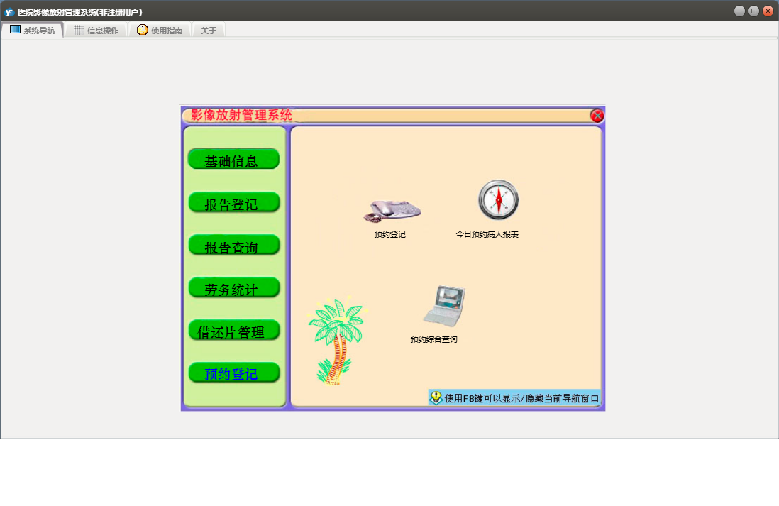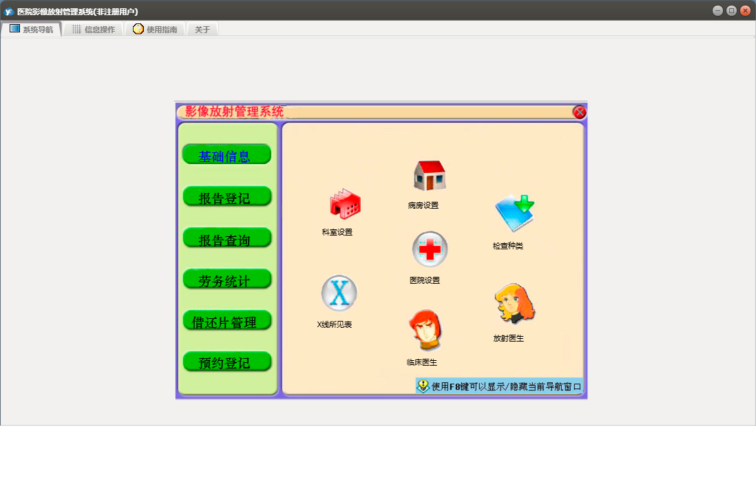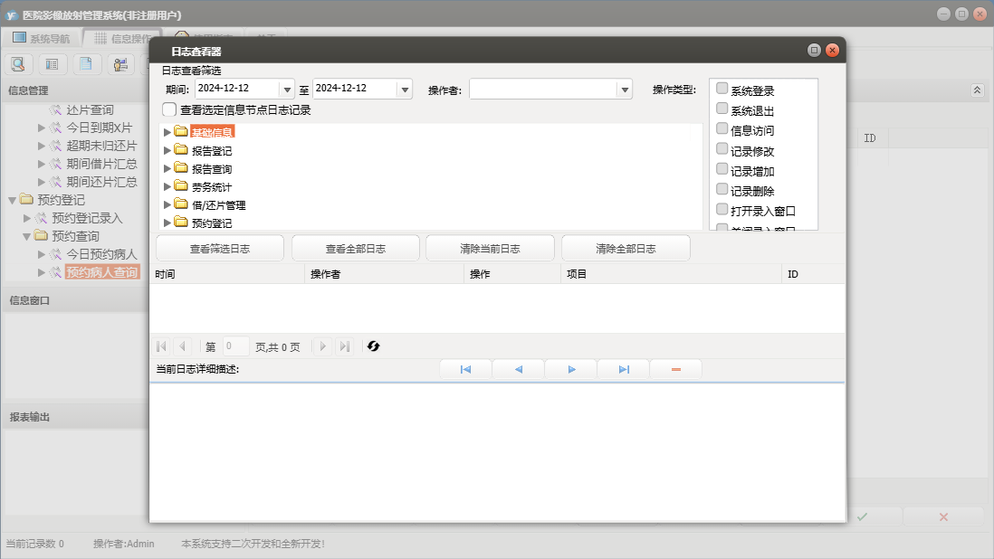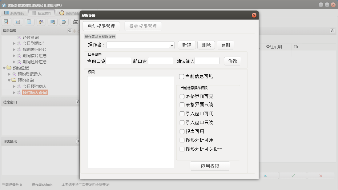 医院影像放射管理系统包含以下功能:预约登记录入、按病人姓名查询、综合查询、借、预约病人查询、劳务统计、权限设置、预约登记、报告登记模式一、报告登记模式二、报告查询、关于、放射医生、科室设置、医院名称、检查种类、基础信息、X线所见表、报告登记、按X线片号查询、日志、临床医生、病房设置等
