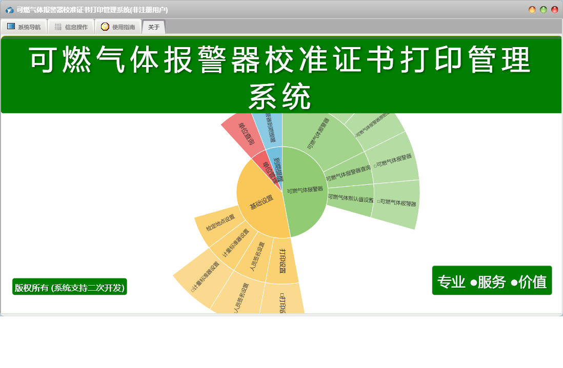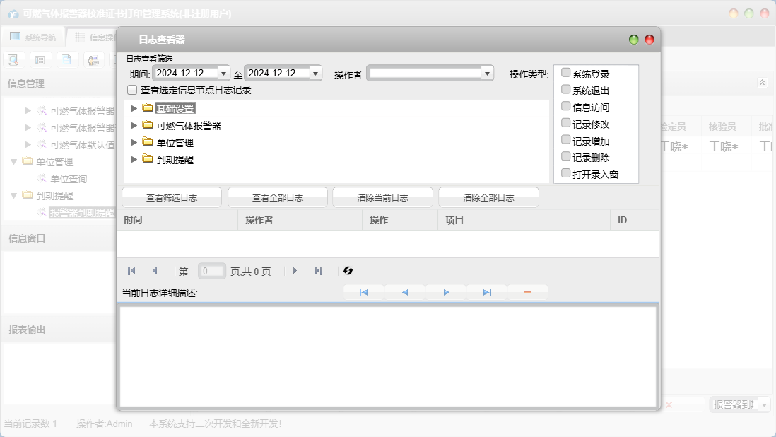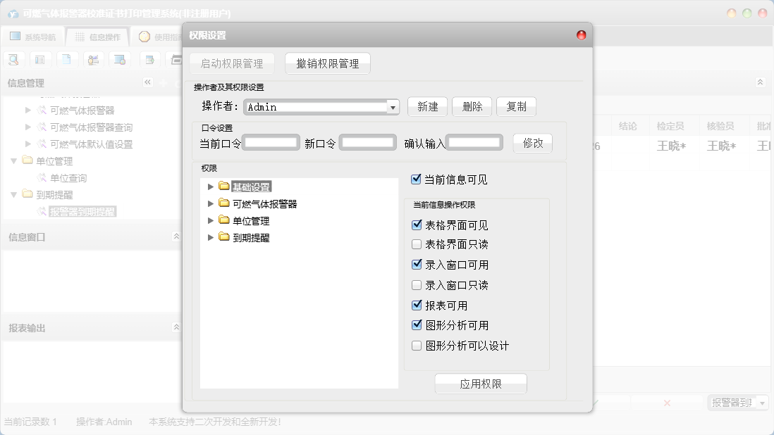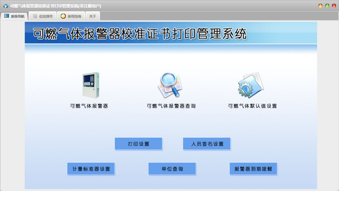 可燃气体报警器校准证书打印管理系统包含以下功能:人员签名设置、计量标准器设置、面板、打印设置、日志、关于、权限设置、可燃气体报警器查询、可燃气体报警器、可燃气体默认值设置等
