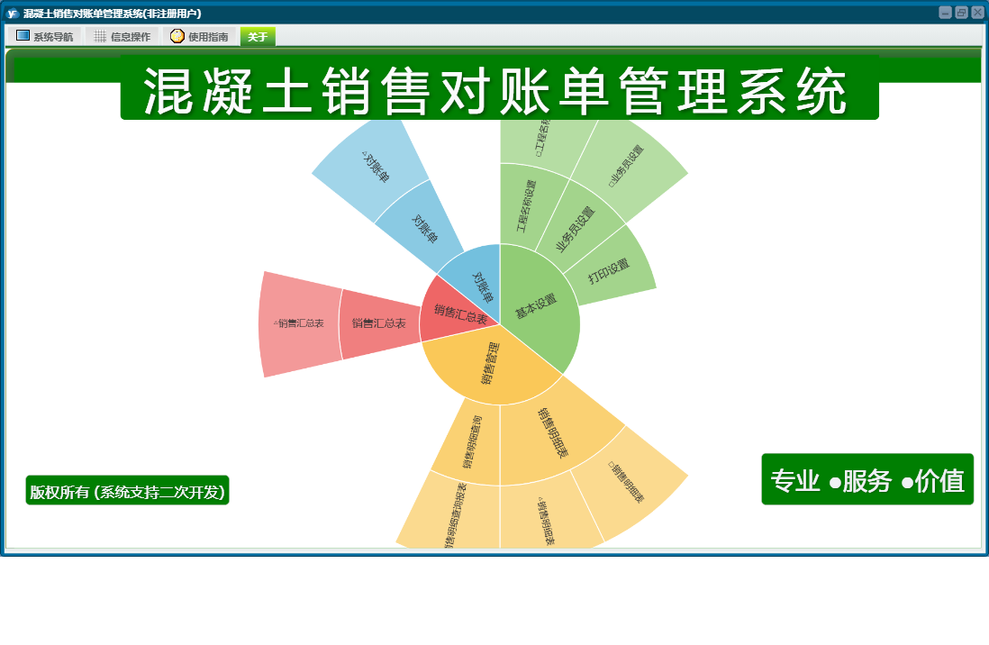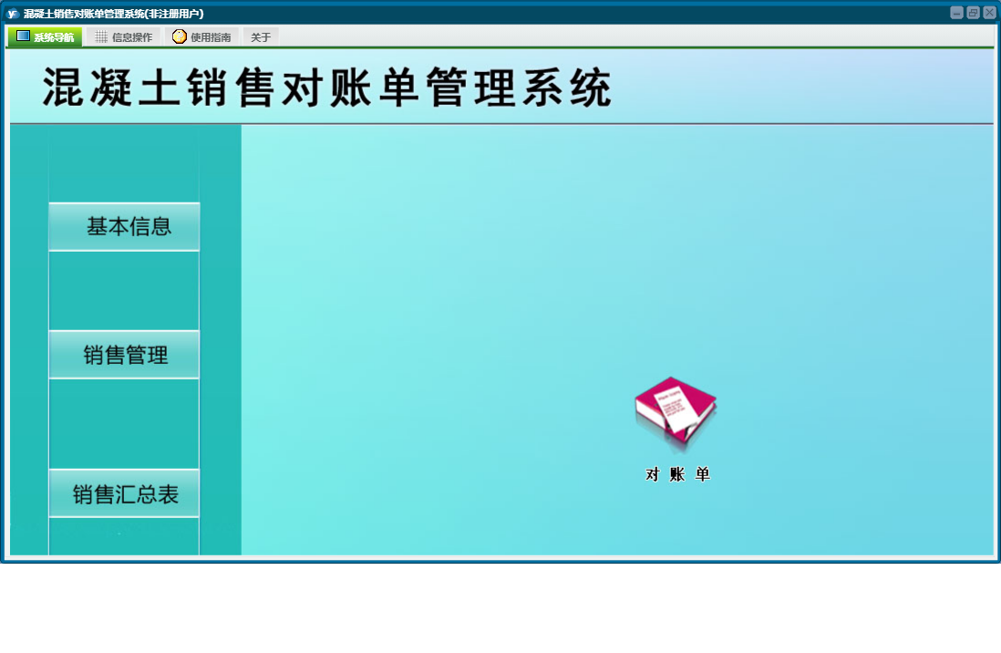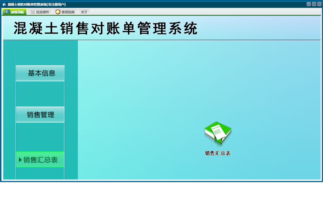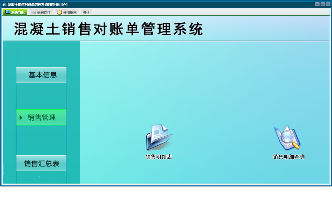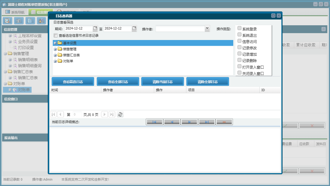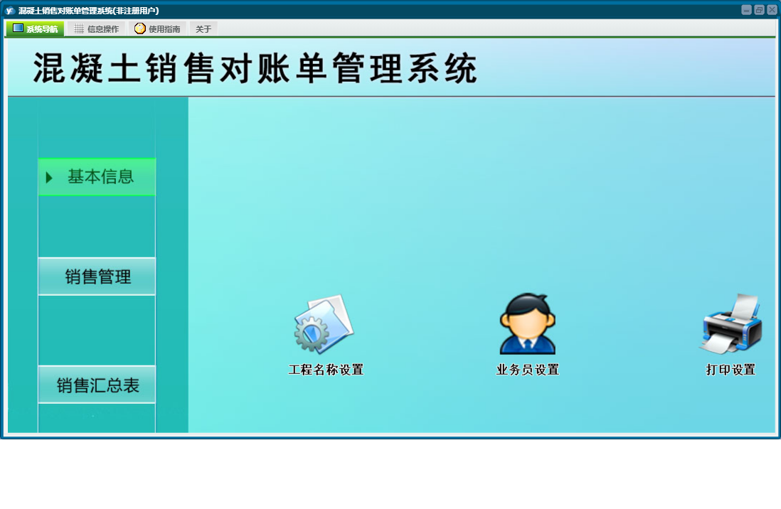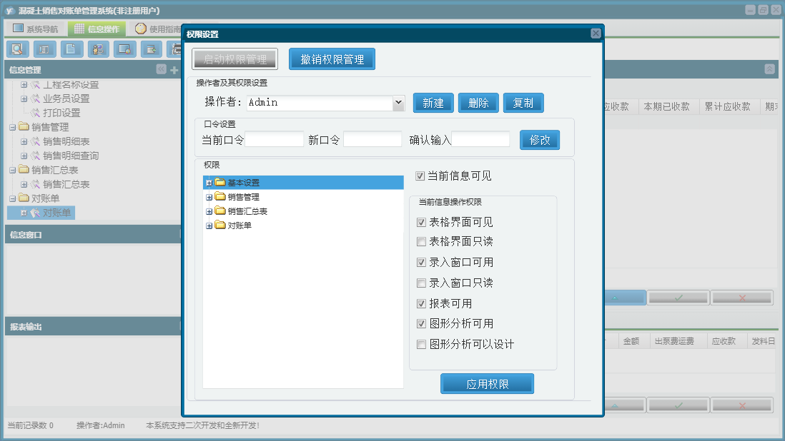 混凝土销售对账单管理系统包含以下功能:工程名称设置、销售管理、销售明细表、基本设置、对账单、业务员设置、日志、关于、权限设置、销售汇总表等
