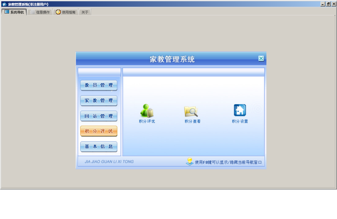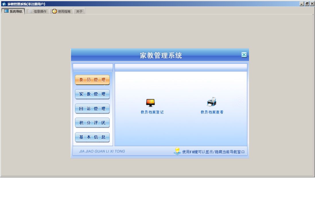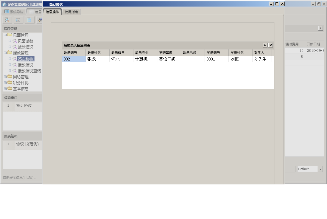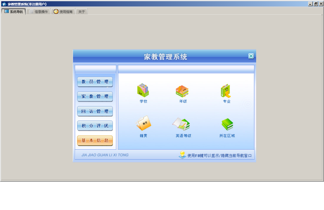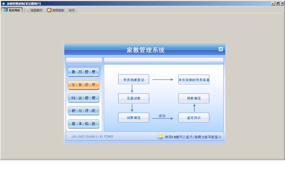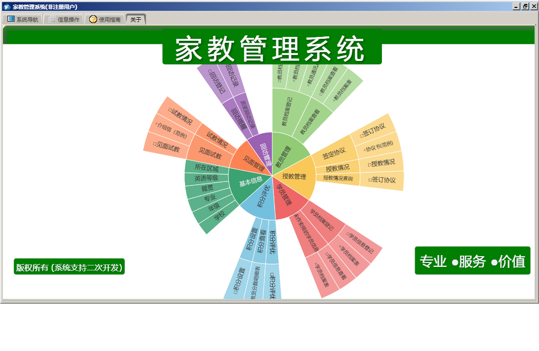 家教管理系统包含以下功能:教员管理、家教管理、权限设置、历史回访记录、积分设置、试教情况、教员档案查看、关于、基本信息、签定协议、回访提醒、积分评优、教员档案登记、未作安排的学员信息、见面试教、授教情况、学员档案登记、日志、授教情况查询、回访管理等
