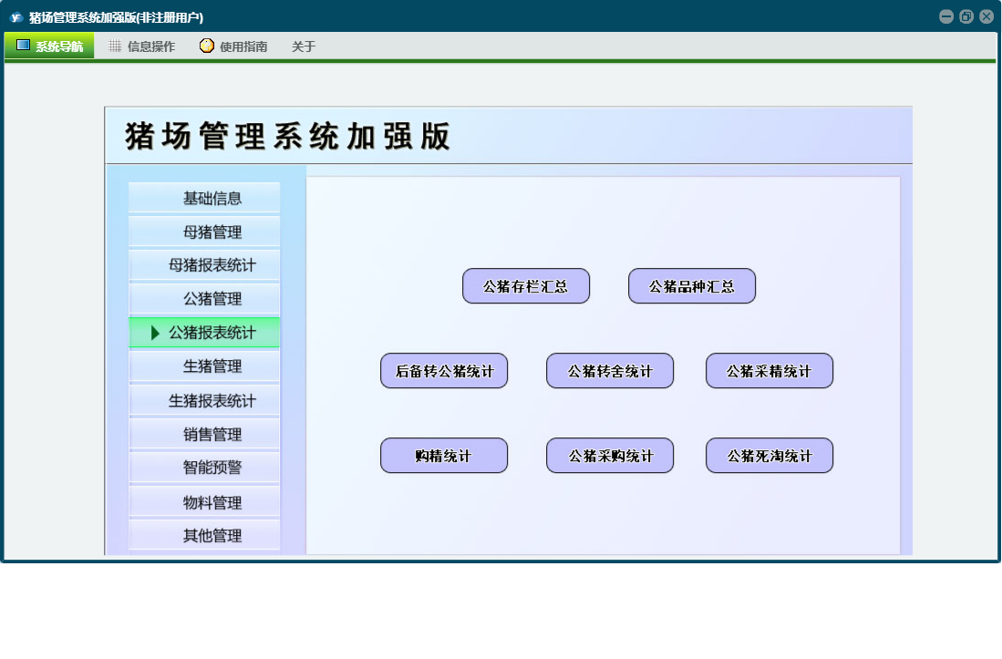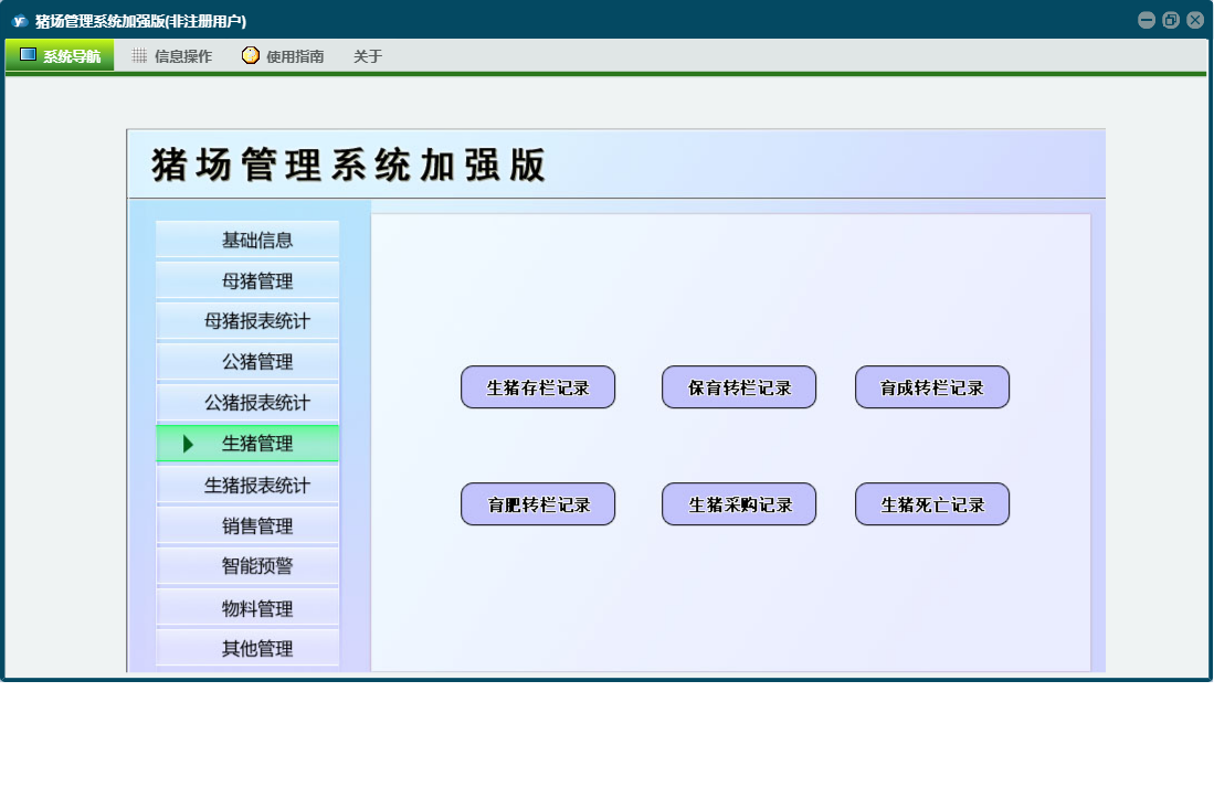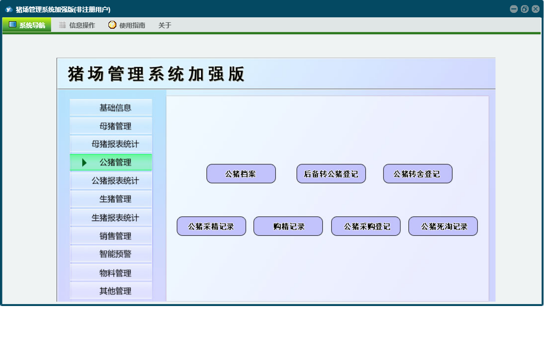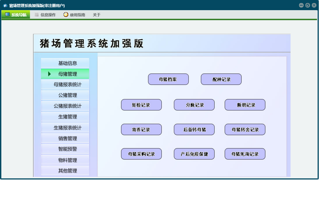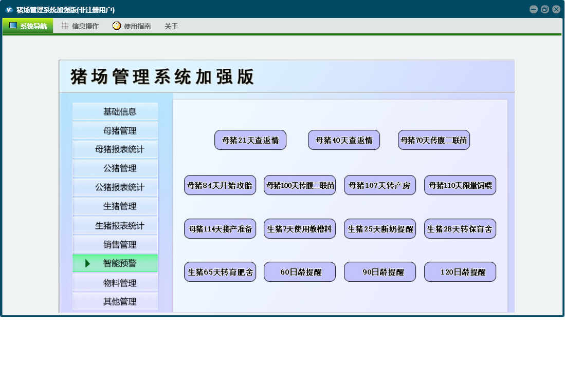 猪场管理系统加强版包含以下功能:公猪档案、销售管理、公猪报表统计、公猪转舍登记、母猪销售登记、保育转栏记录、生猪销售登记、物料信息、后备转母猪、物料入库、妊检记录、公猪管理、公猪销售登记、智能预警、生猪报表统计、产后免疫保健、母猪转舍记录、其它费用收款、出厂检疫登记、权限设置、寄养记录、公猪死淘记录、其它费用支出、配种记录、生猪死亡记录、分娩记录、公猪采精记录、育成转栏记录、生猪采购记录、母猪报表统计、无害化处理记录、物料管理、关于、其他管理、购精记录、客户信息、栋舍信息、母猪采购记录、物料出库、母猪管理、生猪管理、基础信息、公猪采购登记、育肥转栏记录、工人工资、日志、后备转公猪登记、母猪死淘记录、母猪档案、断奶记录、生猪存栏记录、供商信息、人员信息等