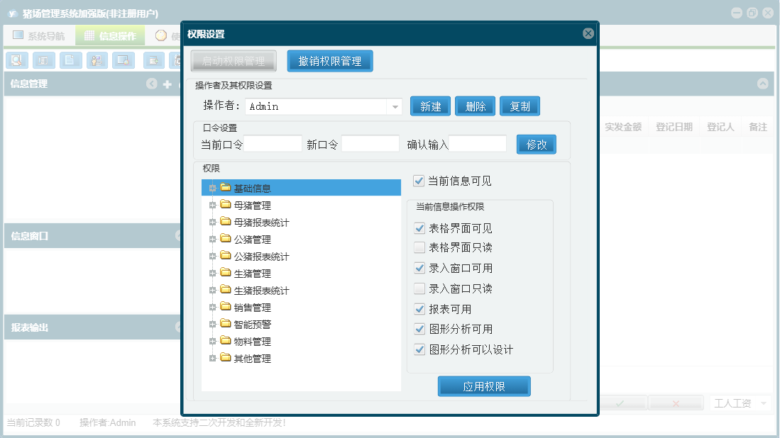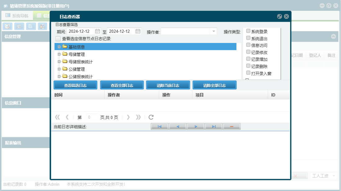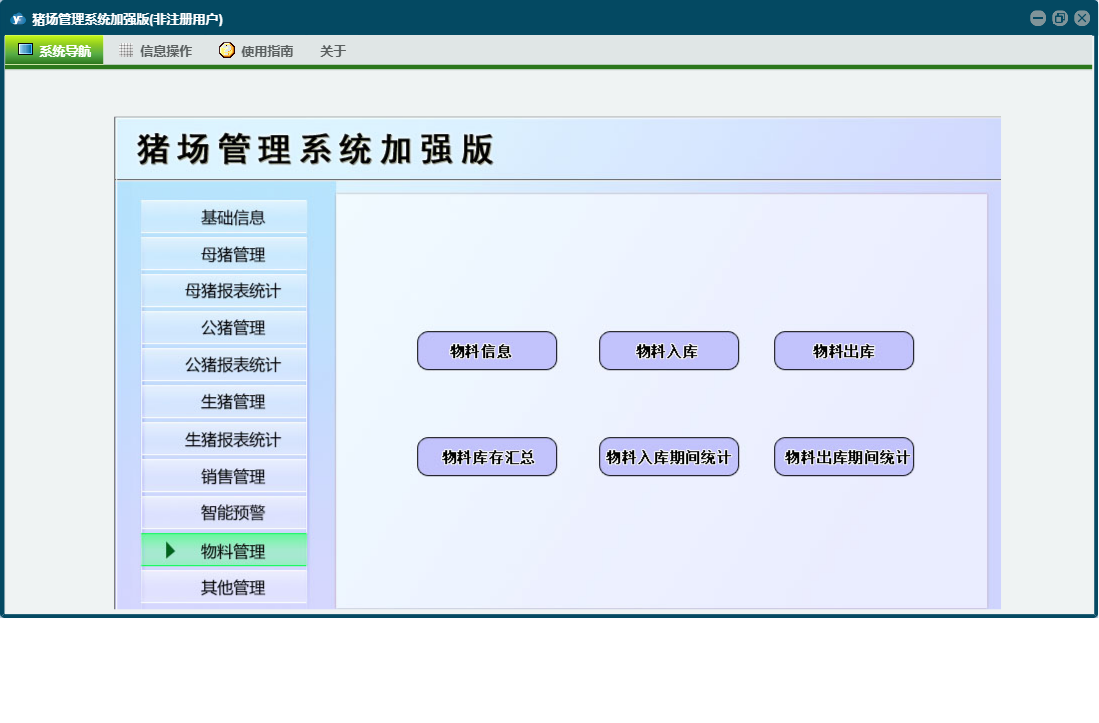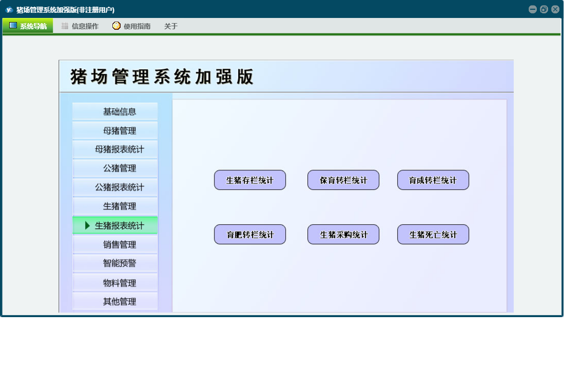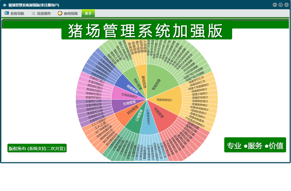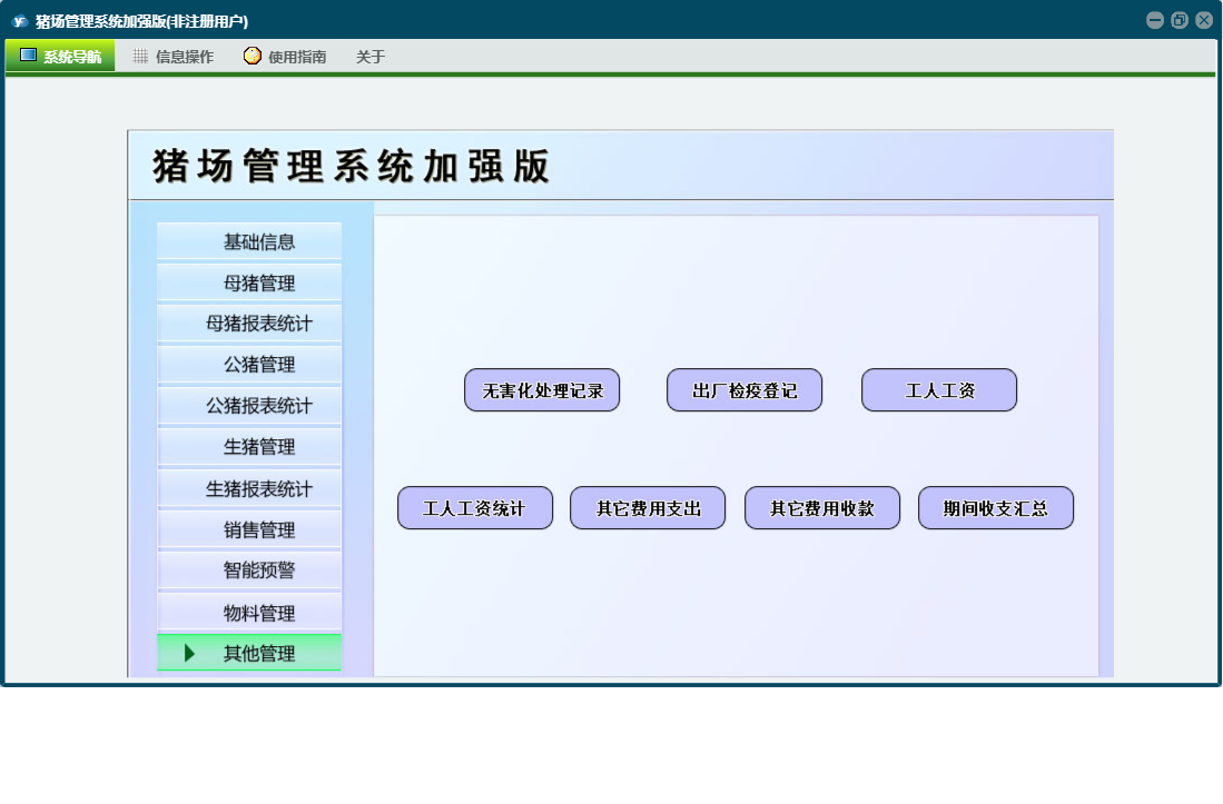 猪场管理系统加强版包含以下功能:公猪档案、销售管理、公猪报表统计、公猪转舍登记、母猪销售登记、保育转栏记录、生猪销售登记、物料信息、后备转母猪、物料入库、妊检记录、公猪管理、公猪销售登记、智能预警、生猪报表统计、产后免疫保健、母猪转舍记录、其它费用收款、出厂检疫登记、权限设置、寄养记录、公猪死淘记录、其它费用支出、配种记录、生猪死亡记录、分娩记录、公猪采精记录、育成转栏记录、生猪采购记录、母猪报表统计、无害化处理记录、物料管理、关于、其他管理、购精记录、客户信息、栋舍信息、母猪采购记录、物料出库、母猪管理、生猪管理、基础信息、公猪采购登记、育肥转栏记录、工人工资、日志、后备转公猪登记、母猪死淘记录、母猪档案、断奶记录、生猪存栏记录、供商信息、人员信息等