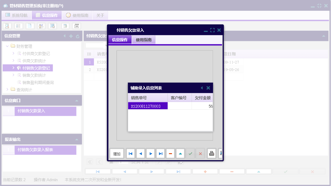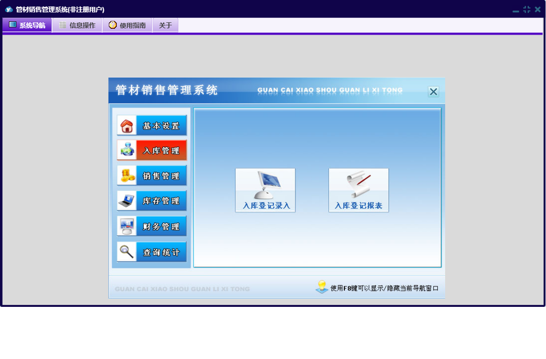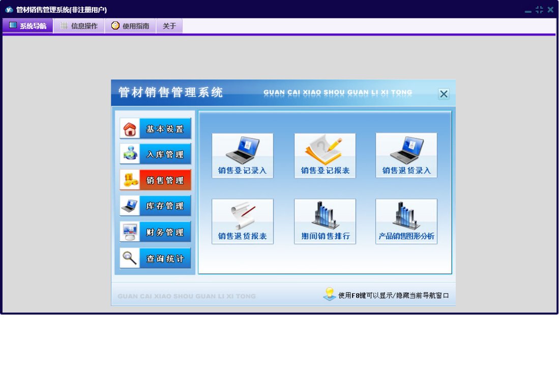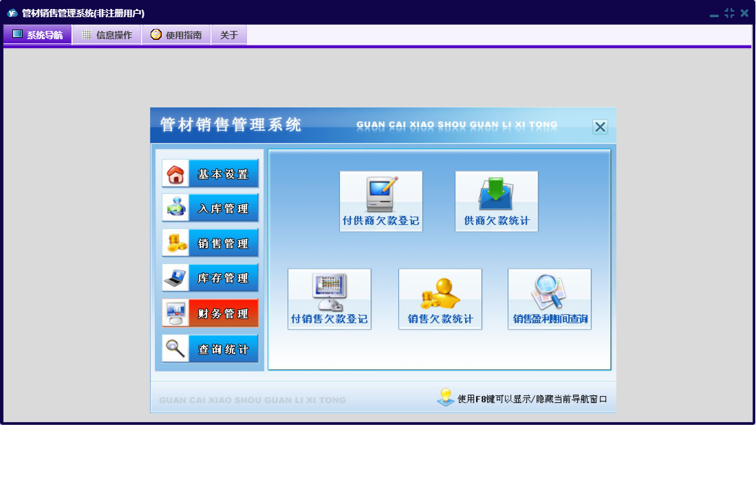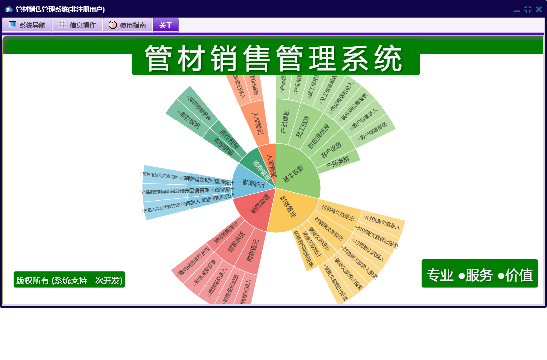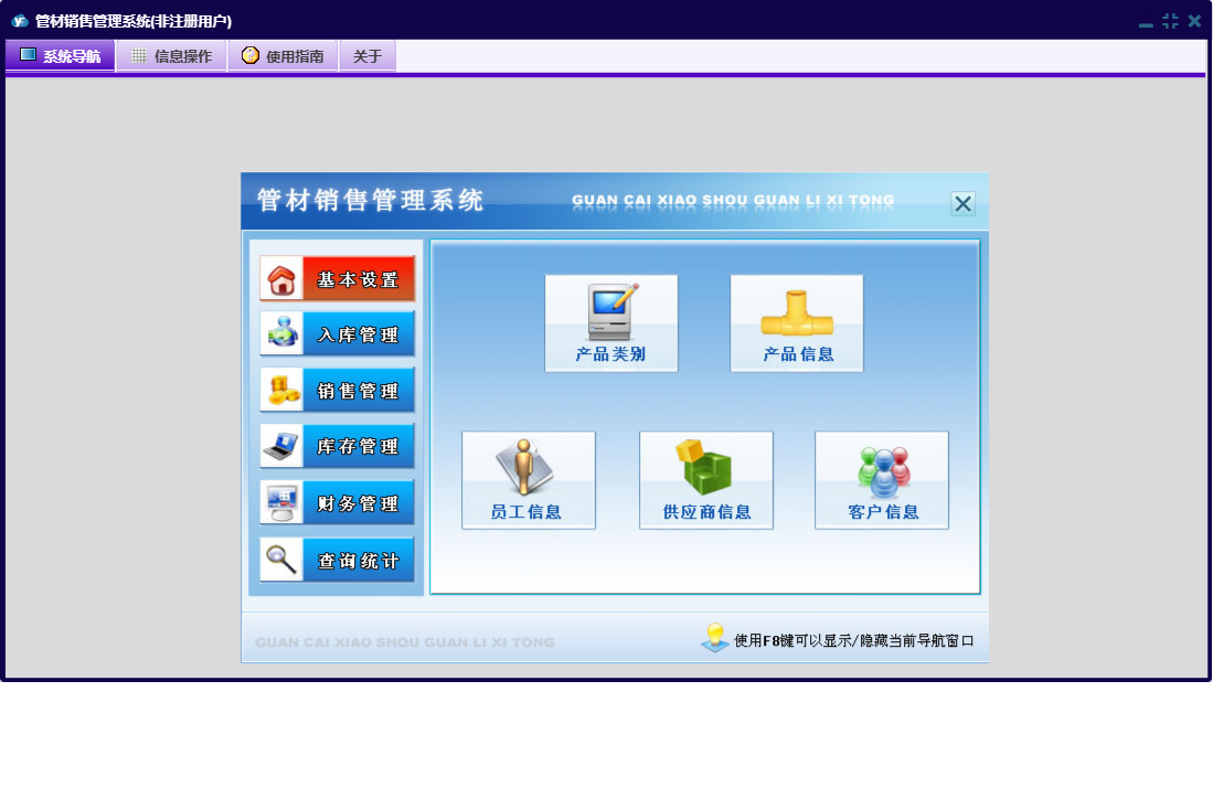 管材销售管理系统包含以下功能:供应商信息、付供商欠款登记、入库管理、销售管理、查询统计、基本设置、入库登记、员工信息、销售退货、日志、库存管理、关于、产品信息、销售登记、权限设置、客户信息、财务管理、付销售欠款登记等