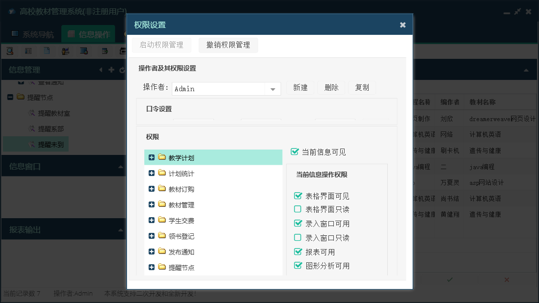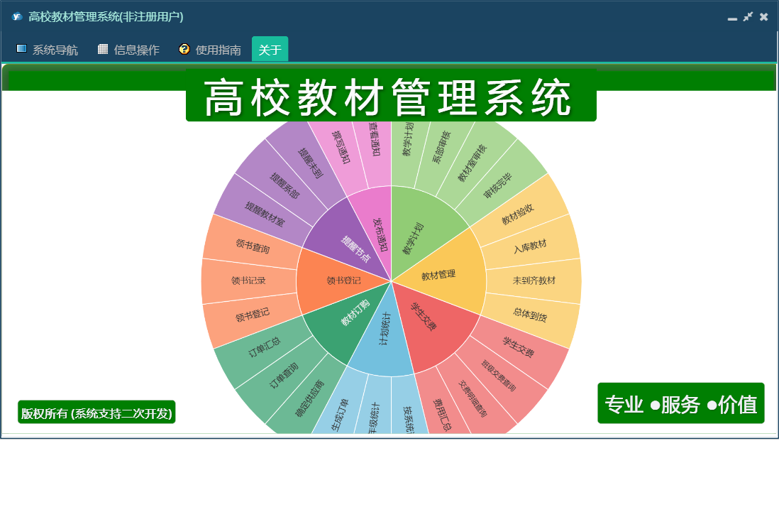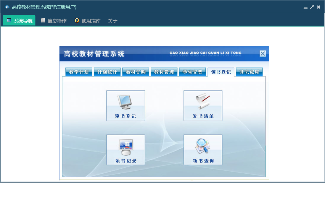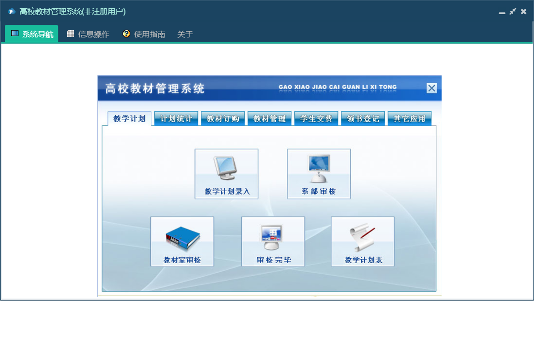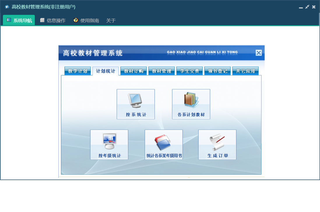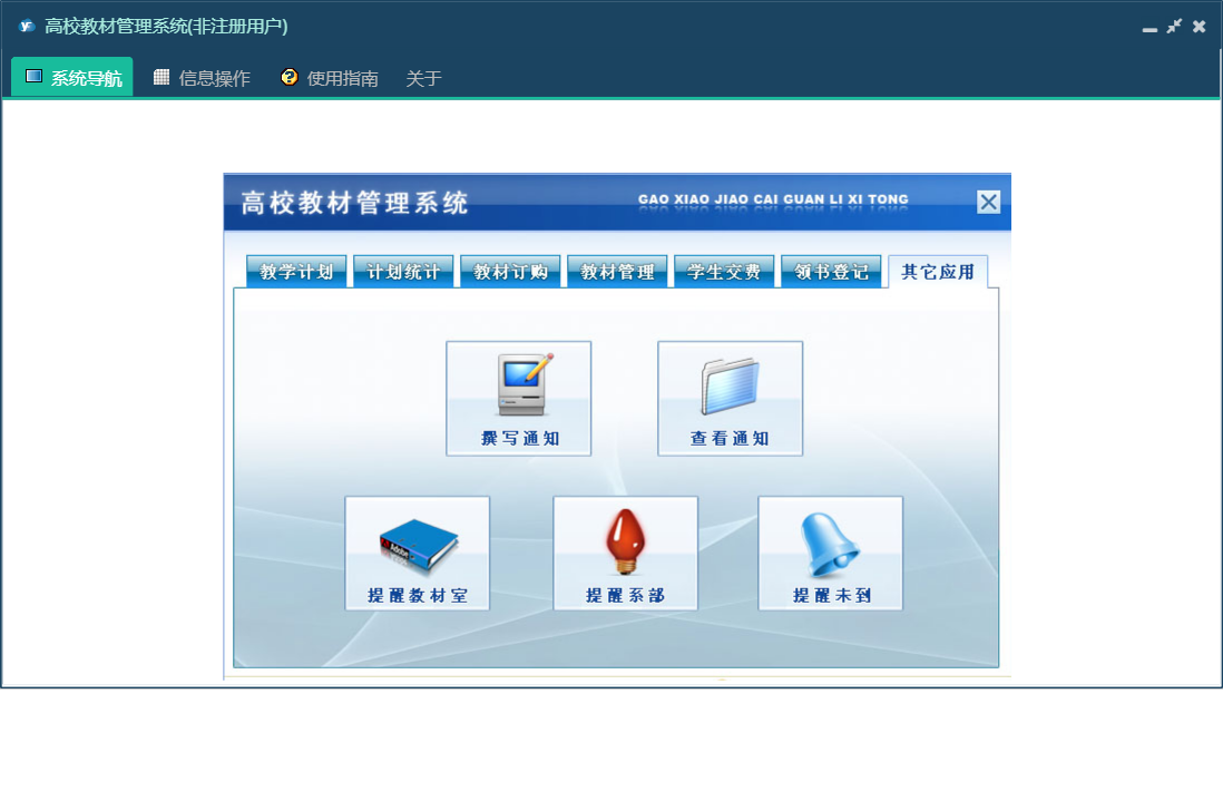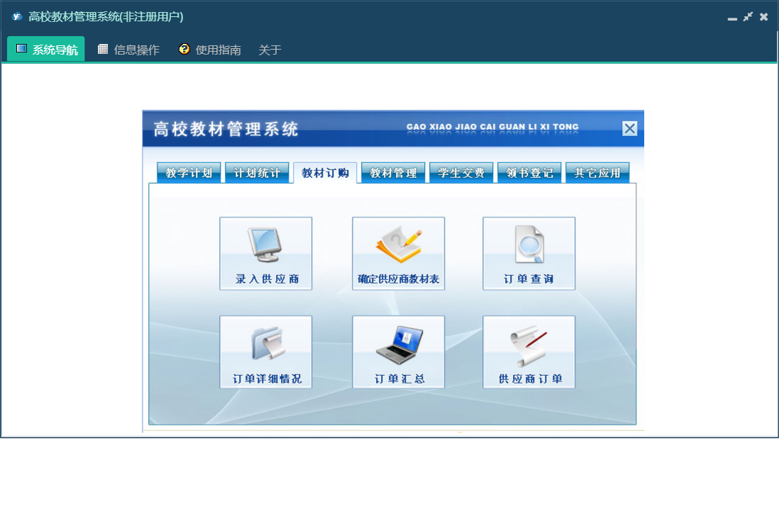 高校教材管理系统包含以下功能:订单汇总、订单查询、生成订单、教材室审核、撰写通知、领书登记、教学计划、权限设置、教材验收、教材管理、未到齐教材、总体到货、教材订购、关于、其它应用、计划统计、学生交费、确定供应商、交费明细查询、班级交费查询、日志、入库教材、查看通知、系部审核等