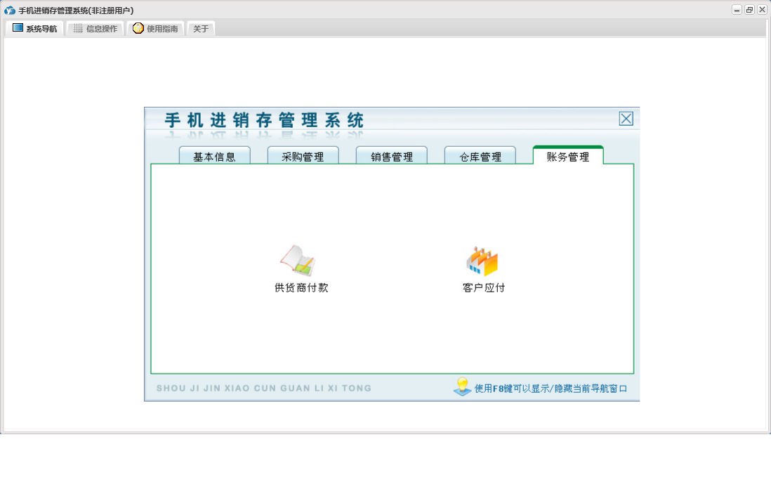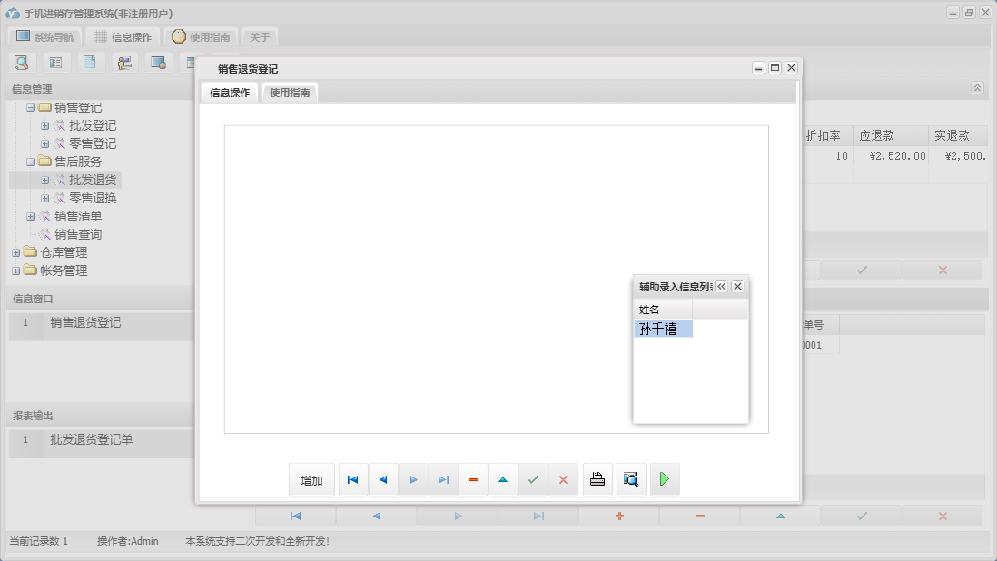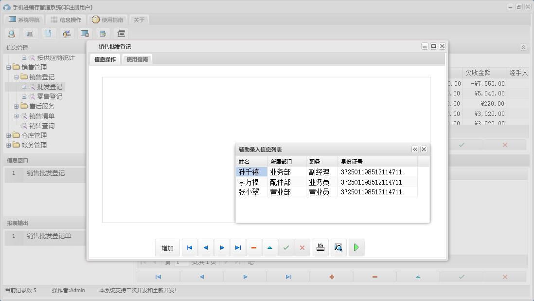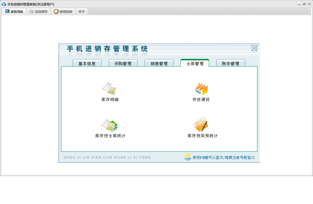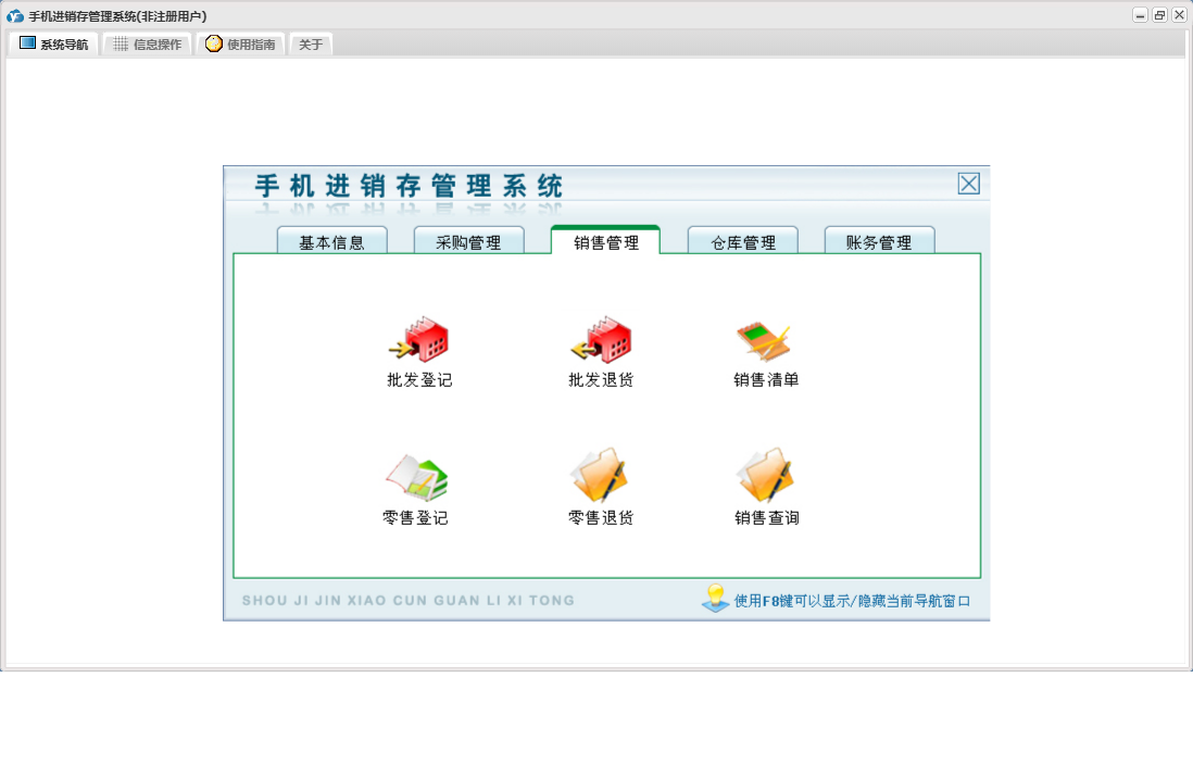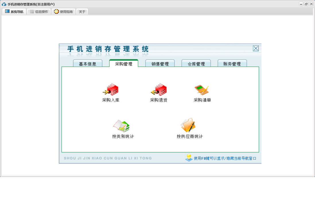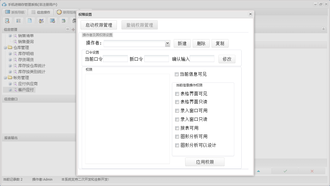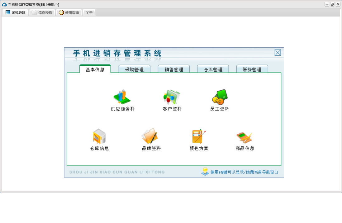 手机进销存管理系统包含以下功能:零售退换、供应商资料、销售管理、员工资料、批发退货、商品信息、存货调货、权限设置、仓库信息、批发登记、零售登记、采购退货、仓库管理、关于、基本信息、客户资料、账务管理、品牌资料、日志、采购管理、采购入库、颜色方案等
