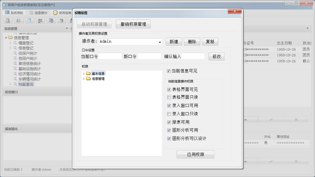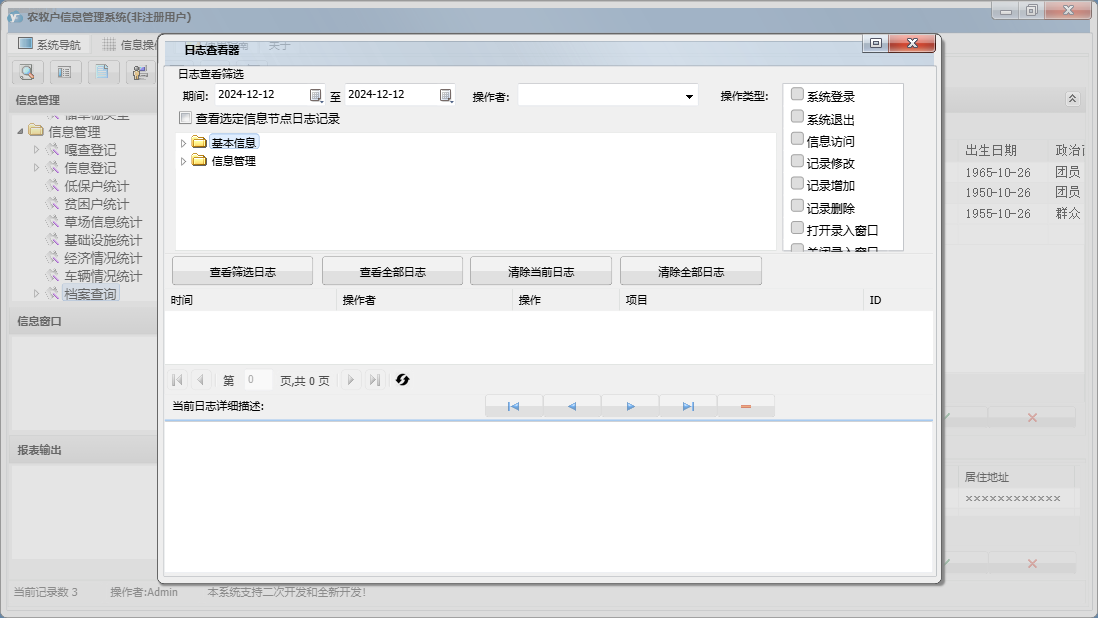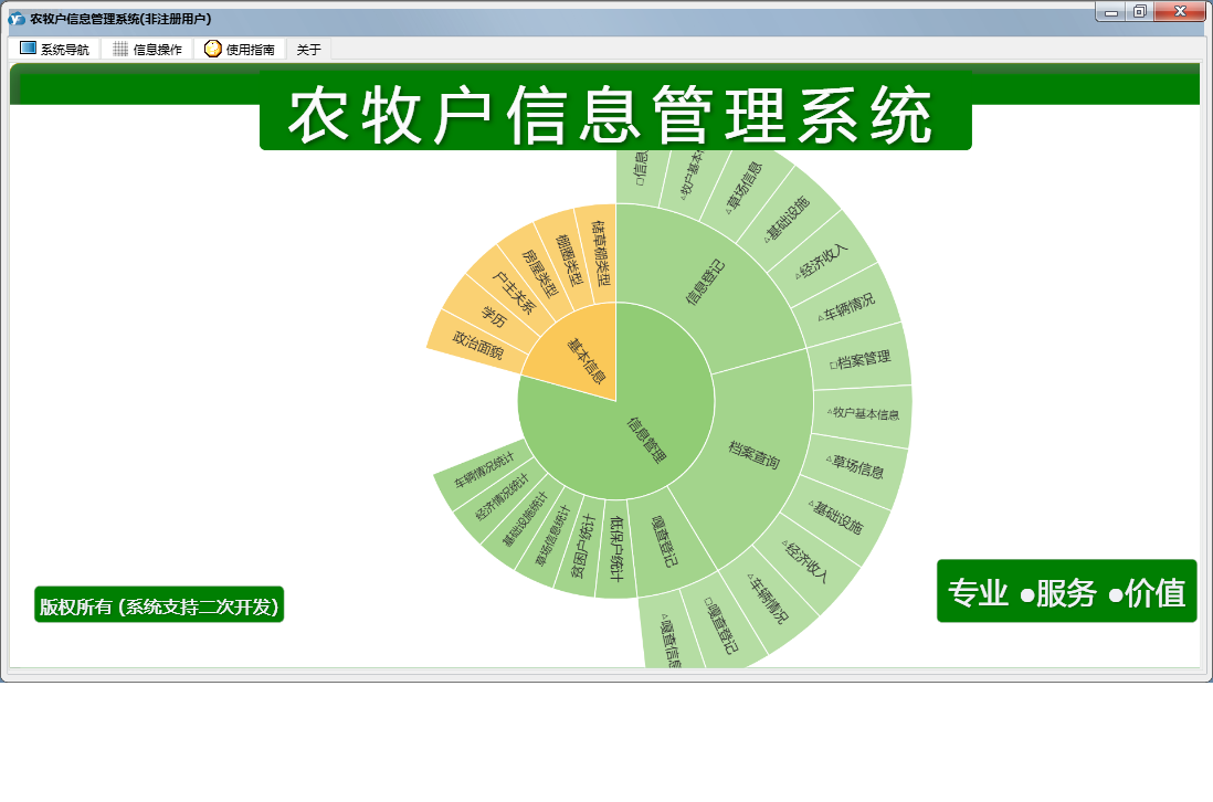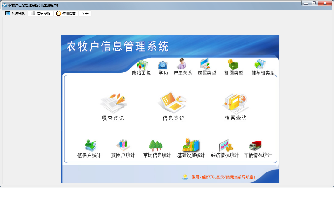 农牧户信息管理系统包含以下功能:信息登记、面板、档案查询、日志、关于、权限设置、嘎查登记等