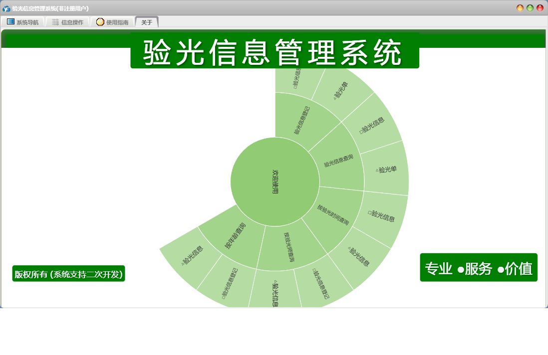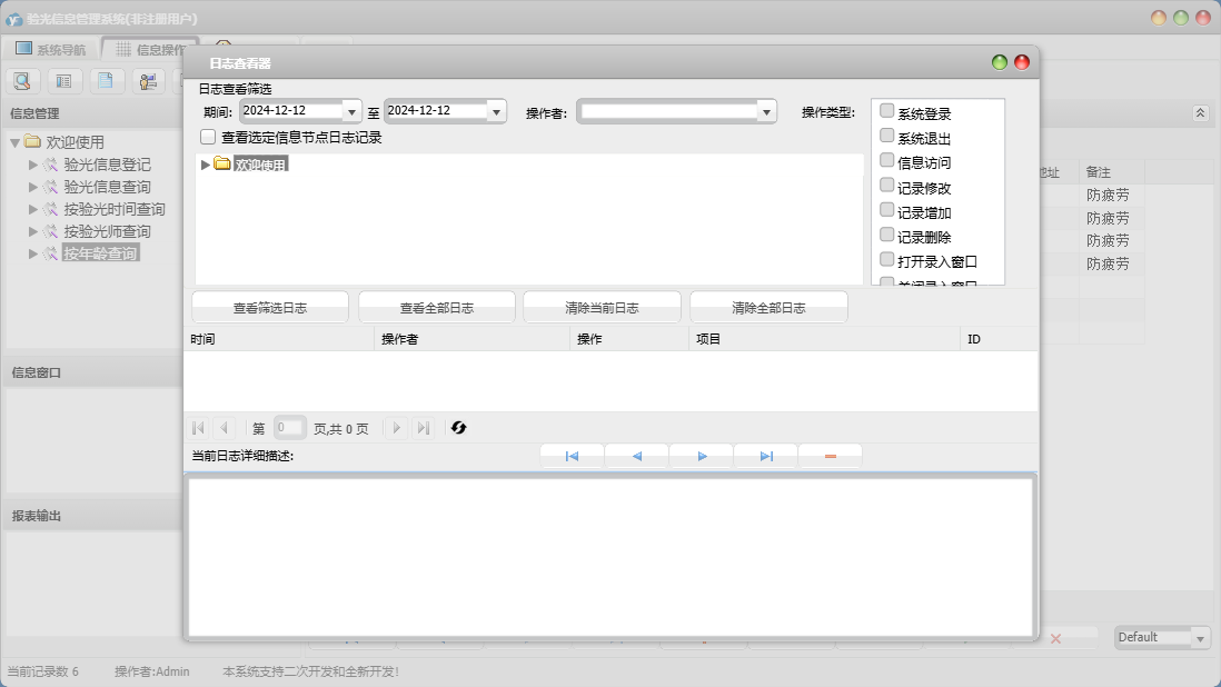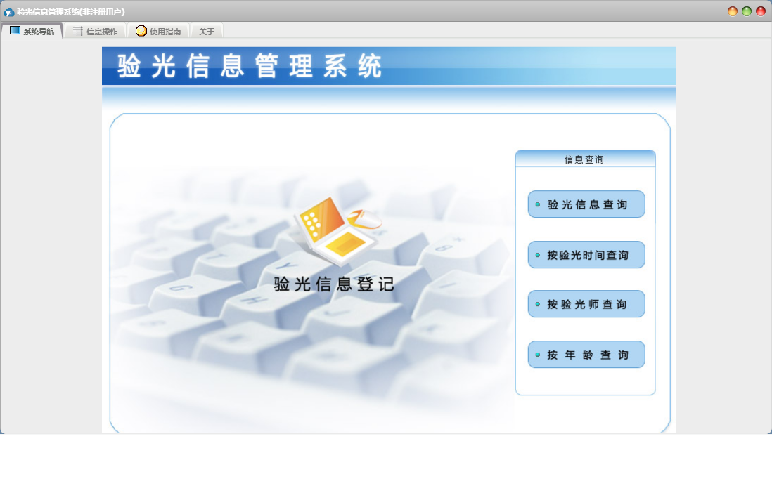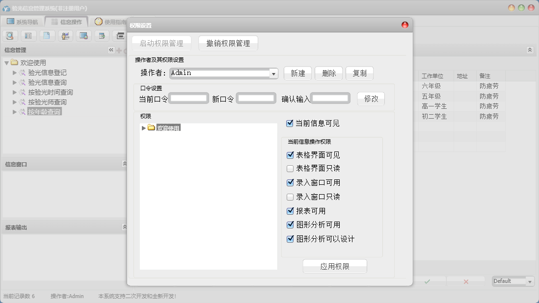 验光信息管理系统包含以下功能:面板、按年龄查询、日志、关于、权限设置、验光信息查询、验光信息登记等