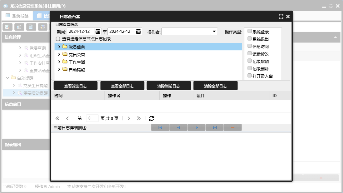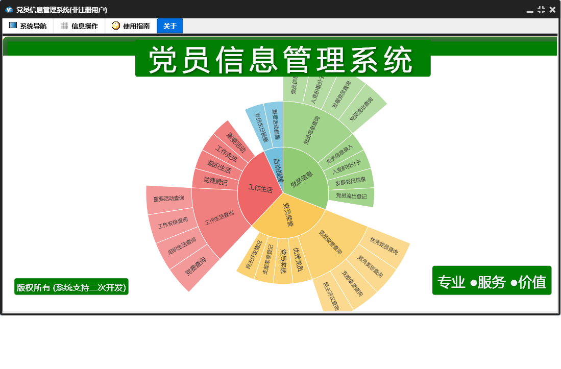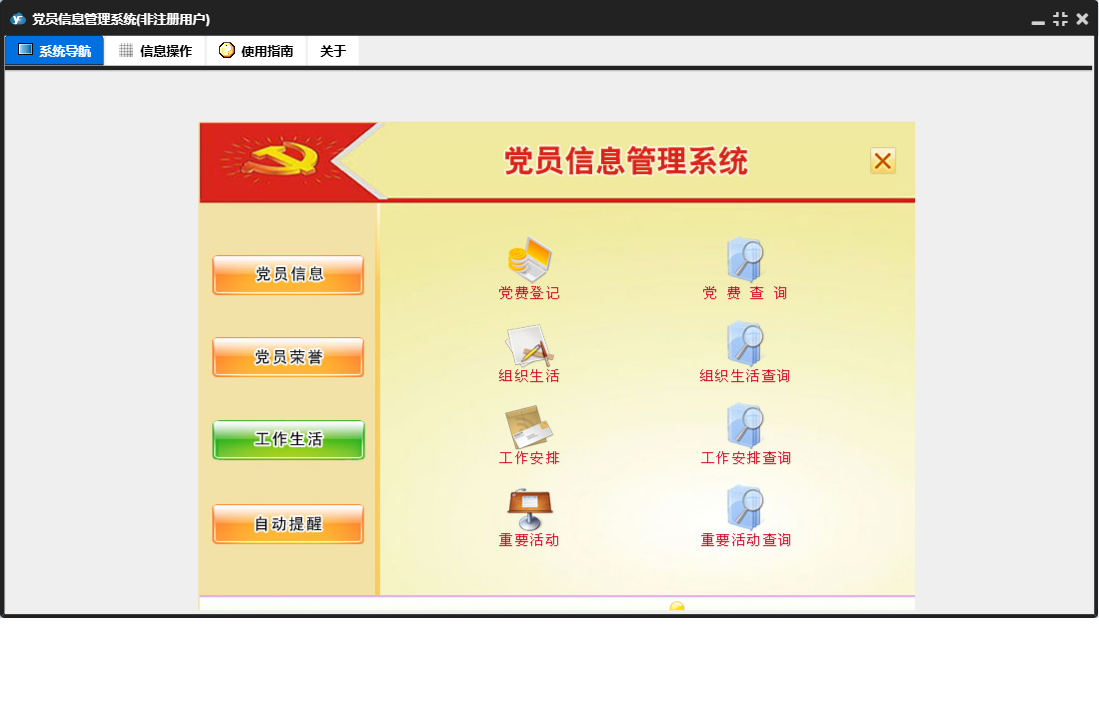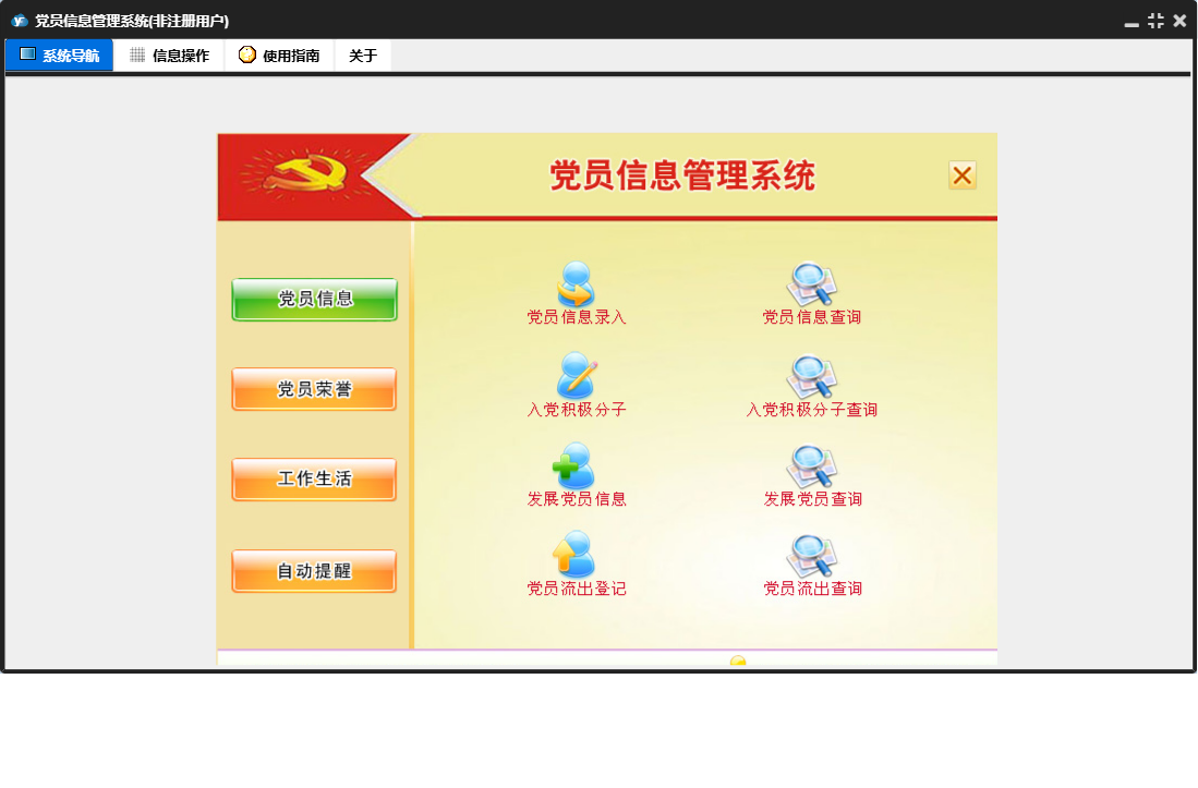 党员信息管理系统包含以下功能:发展党员信息、自动提醒、党员信息录入、重要活动、党员信息、民主评议情况、权限设置、党员奖惩、支部荣誉登记、党员流出登记、组织生活、党费登记、关于、工作安排、重要活动提醒、入党积极分子、优秀党员、日志、党员荣誉、党员生日提醒、工作生活等