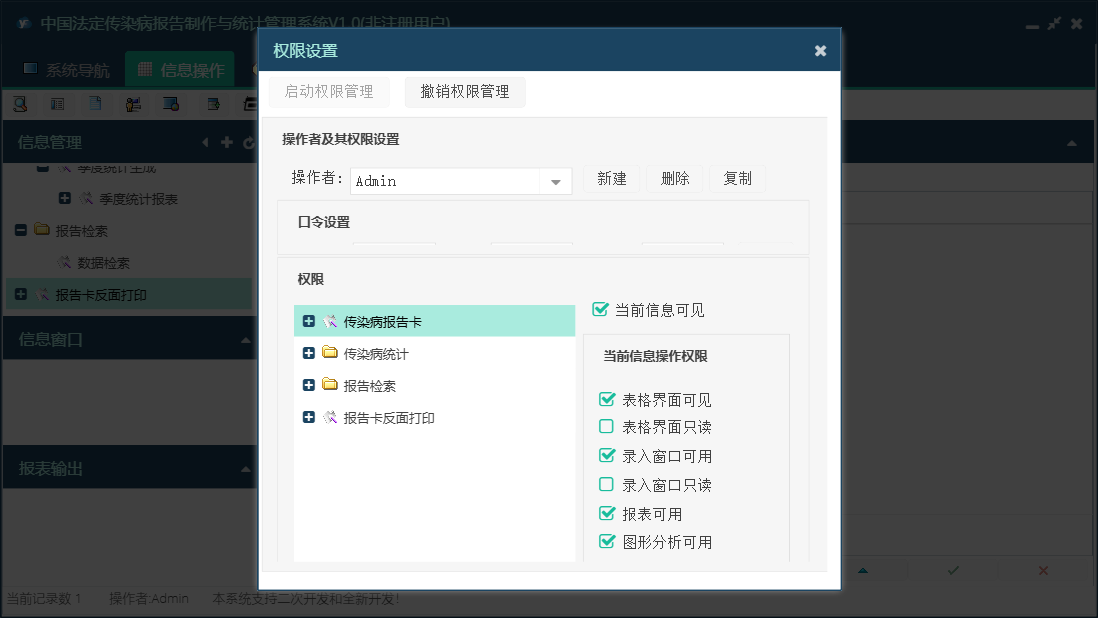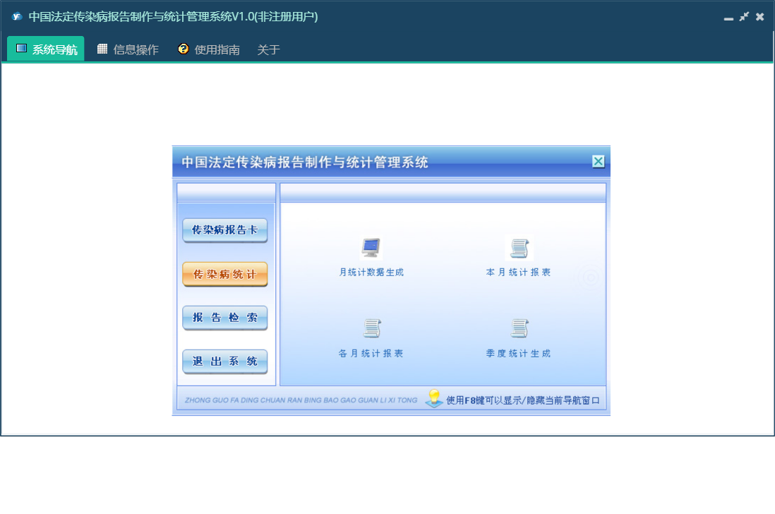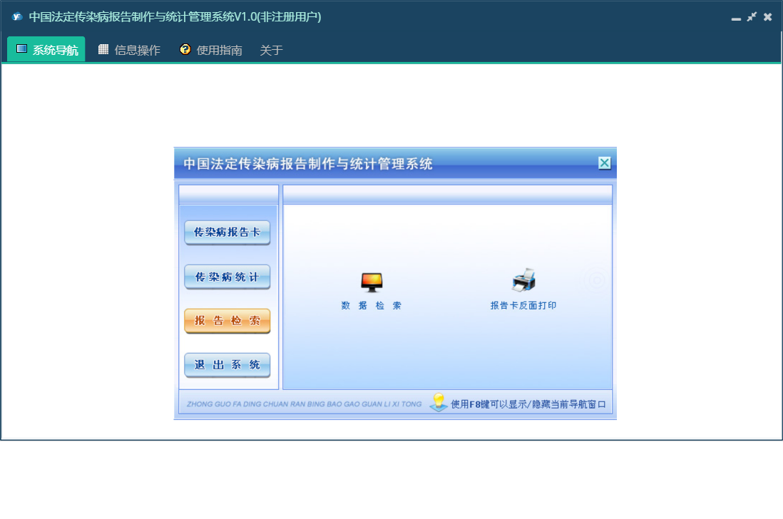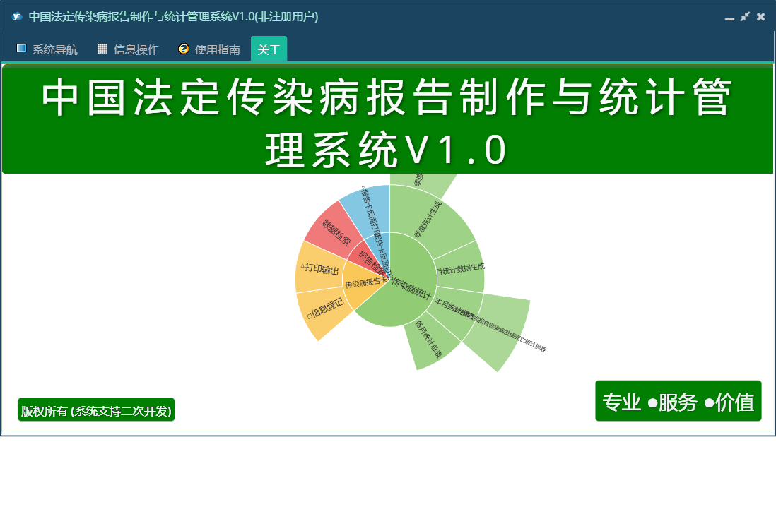 中国法定传染病报告制作与统计管理系统V1.0包含以下功能:传染病统计、报告检索、日志、关于、权限设置等