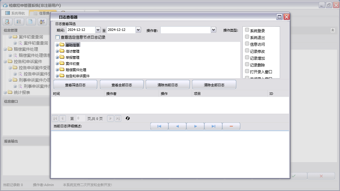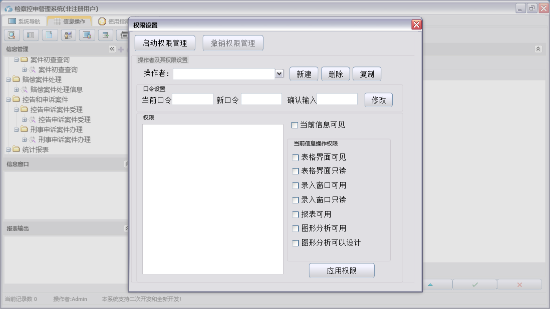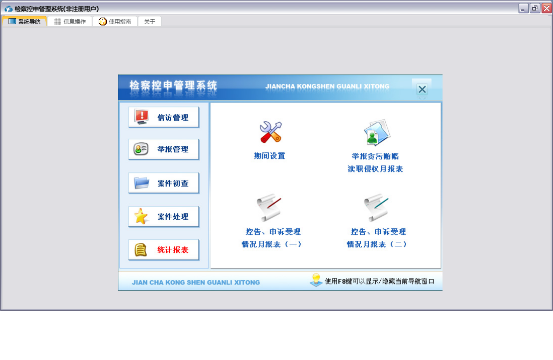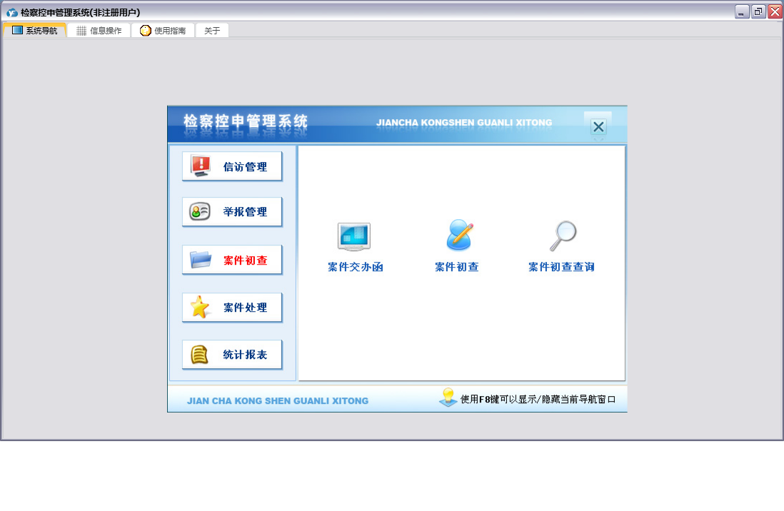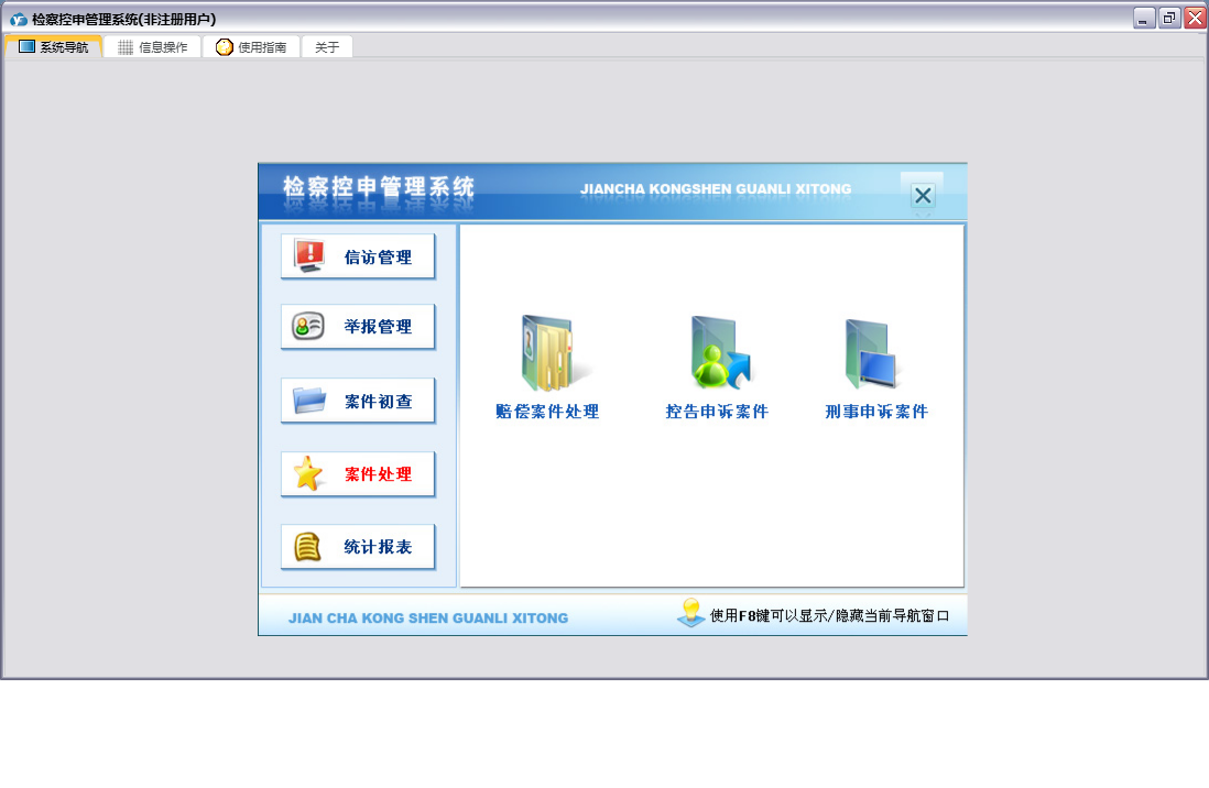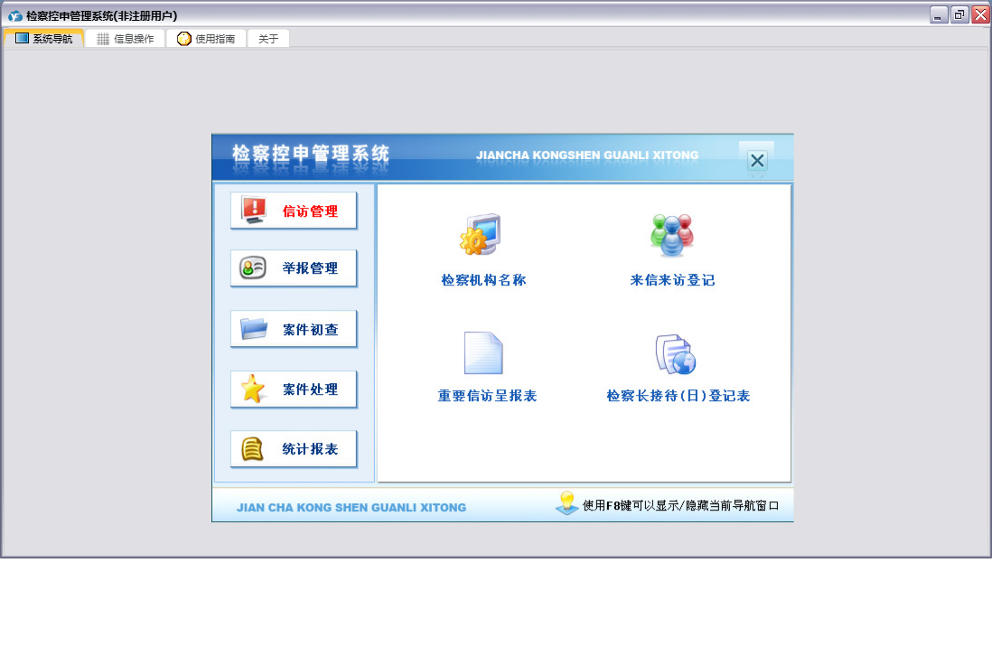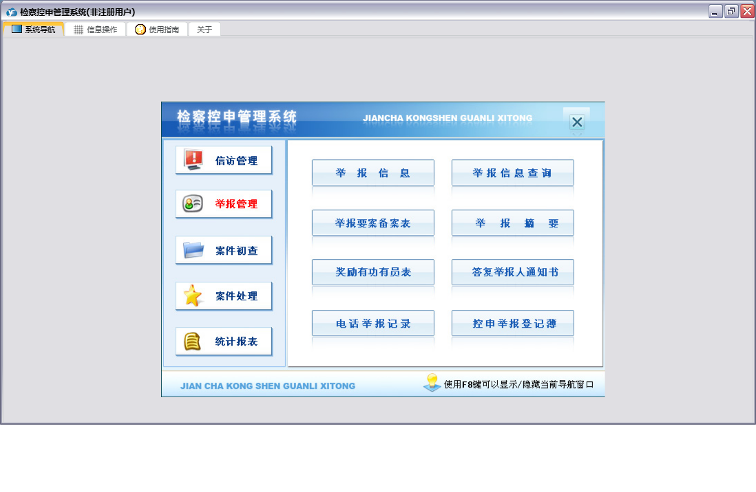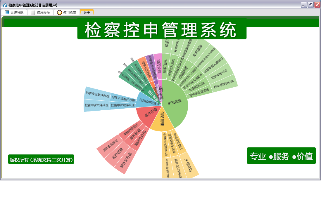 检察控申管理系统包含以下功能:重要信访呈、答复举报人通知书、举报管理、控告申诉案件受理、案件交办函、来信来访、奖励举报有功人员呈、案件处理、刑事申诉案件办理、统计、权限设置、赔偿案件处理信息、案件初查、关于、举报信息、信访管理、控申举报登记簿、举报摘要、日志、电话举报记录、举报要案线索备案表、检察长接待(日)登记表等