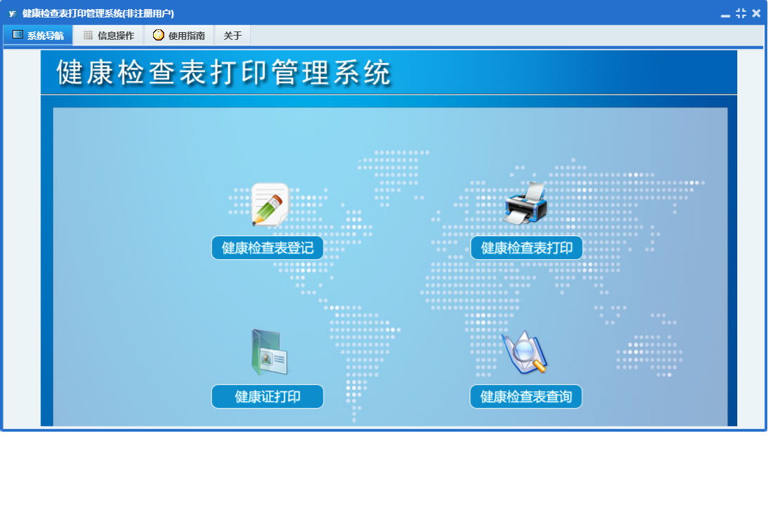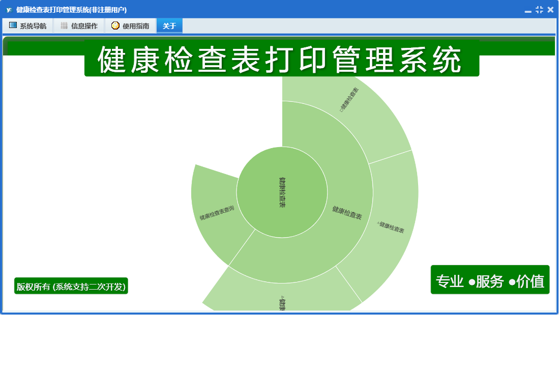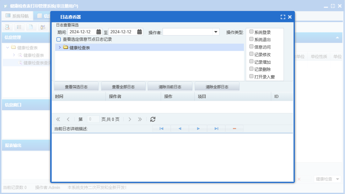 健康检查表打印管理系统包含以下功能:0、健康检查表、日志、关于、权限设置等