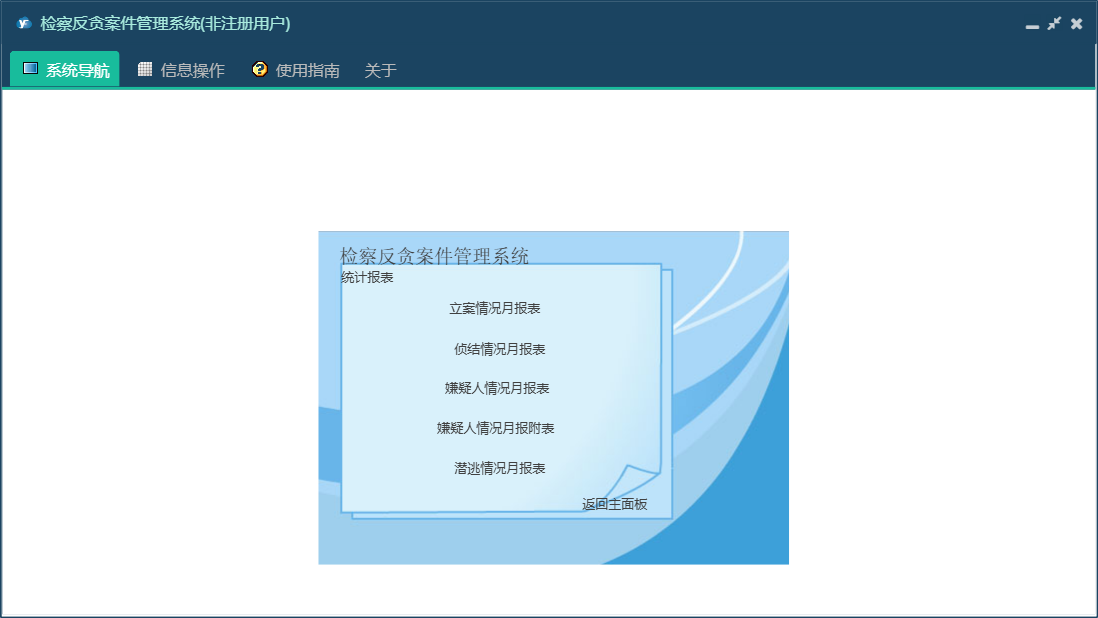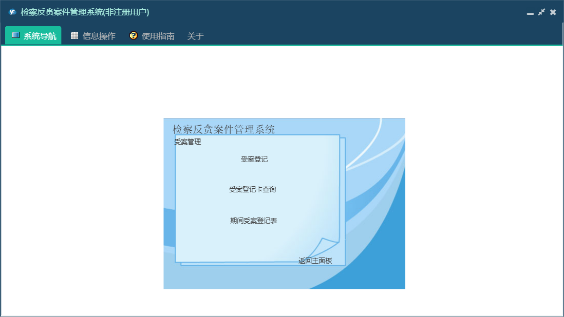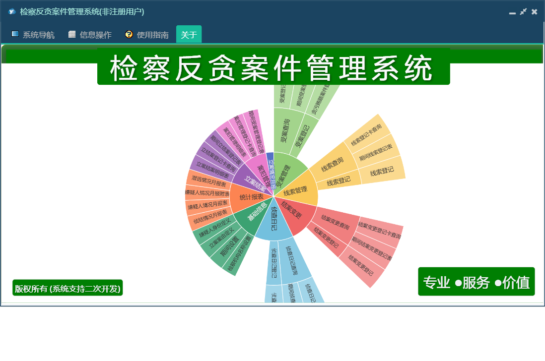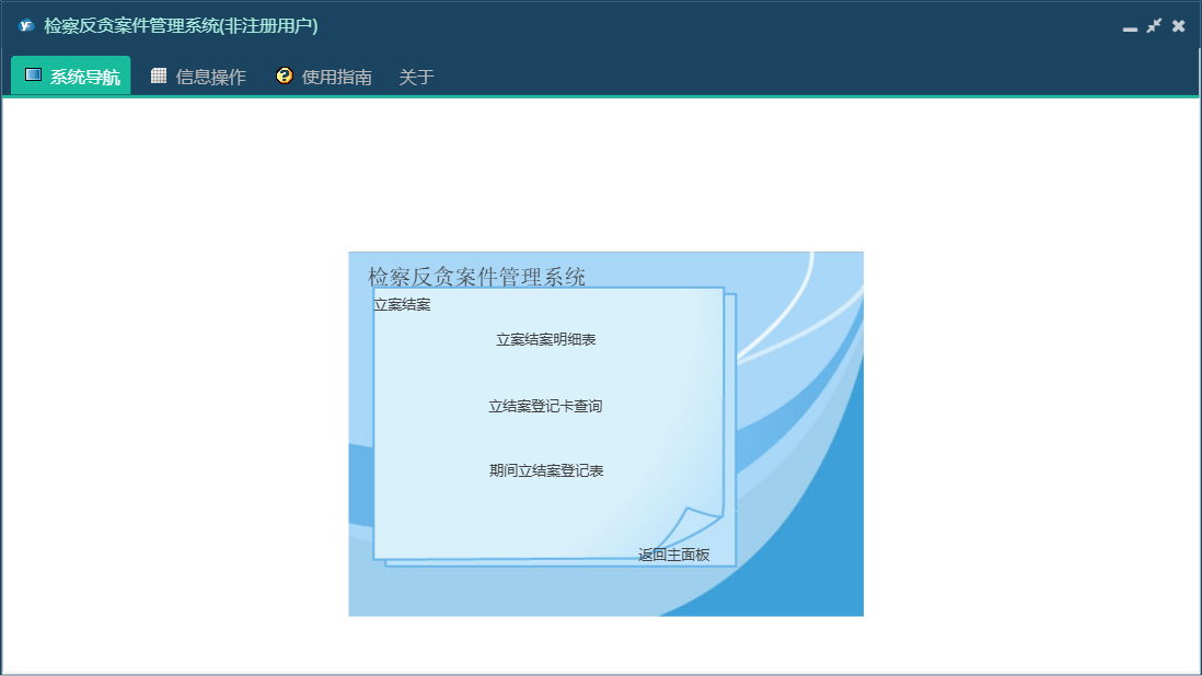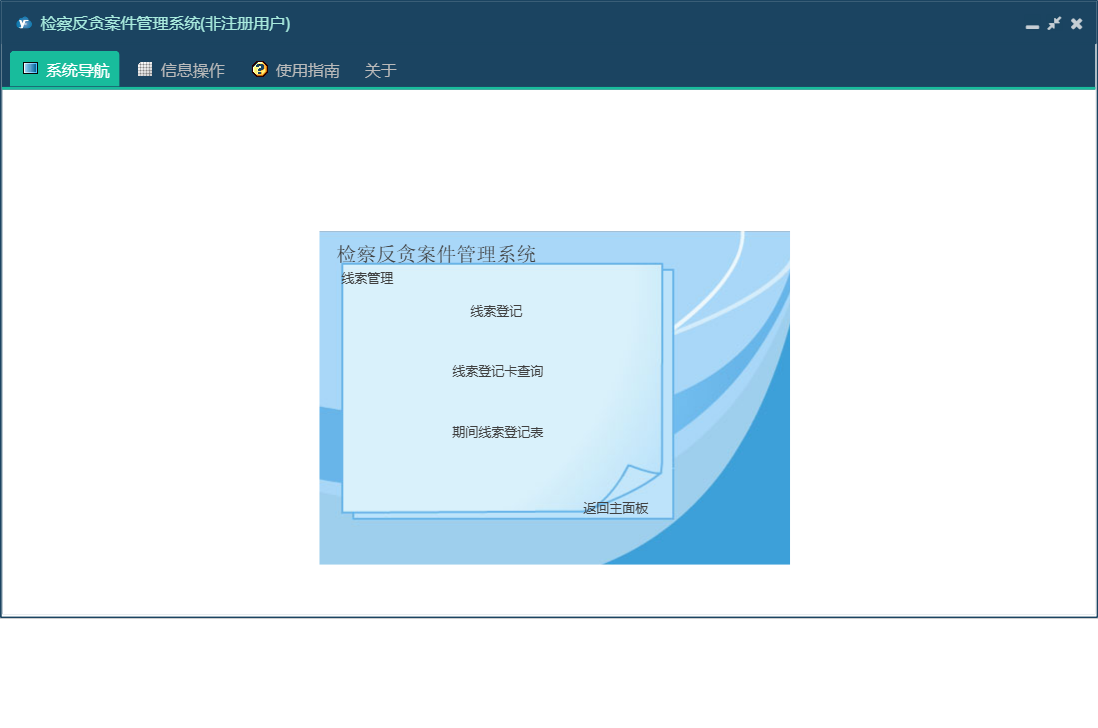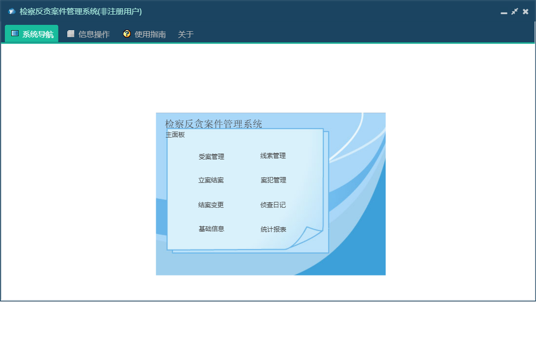 检察反贪案件管理系统包含以下功能:基础信息、线索管理、立案结案、侦查日记、关于、统计、受案管理、贪污贿赂案件登记、案犯管理、结案变更、主面板等