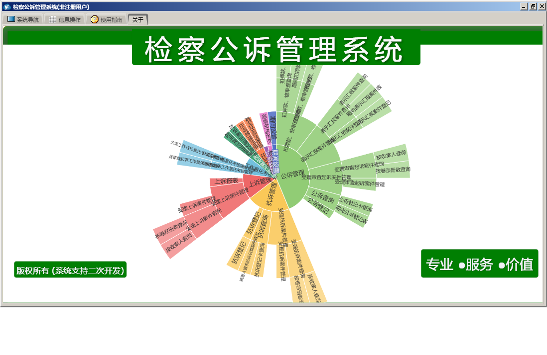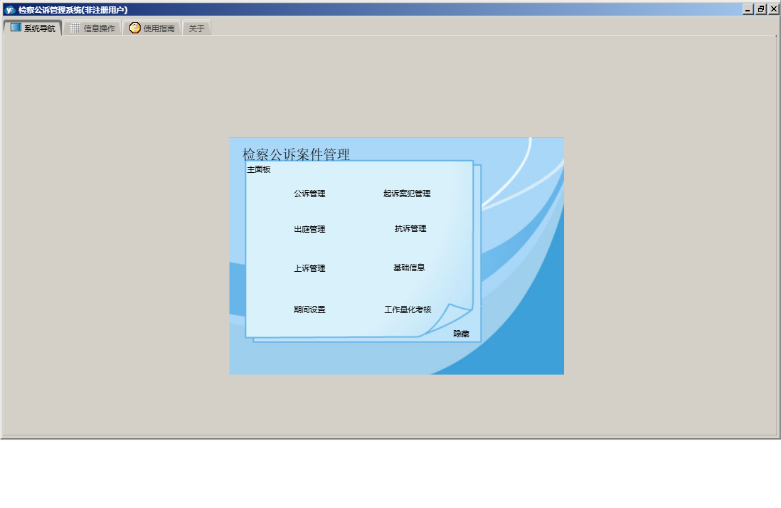 检察公诉管理系统包含以下功能:公诉管理、基础信息、出庭管理、受理抗诉案件管理、期间设置、工作量化考核、扣押款、物审查管理、受理上诉案件管理、受理审查起诉案件管理、上诉管理、请示汇报案件管理、关于、起诉案犯管理、抗诉管理、主面板等