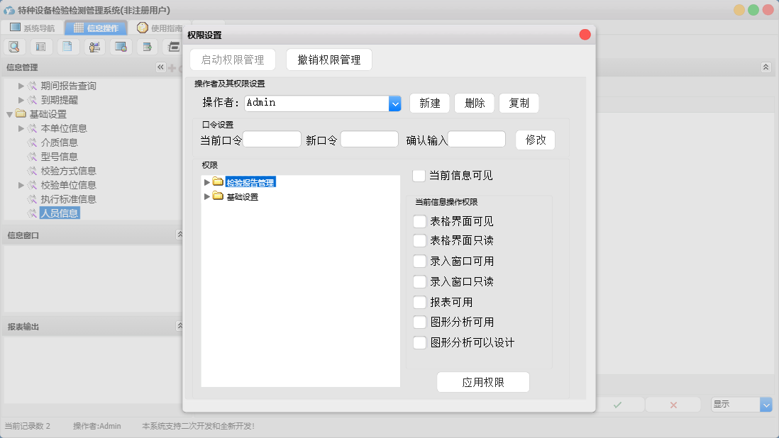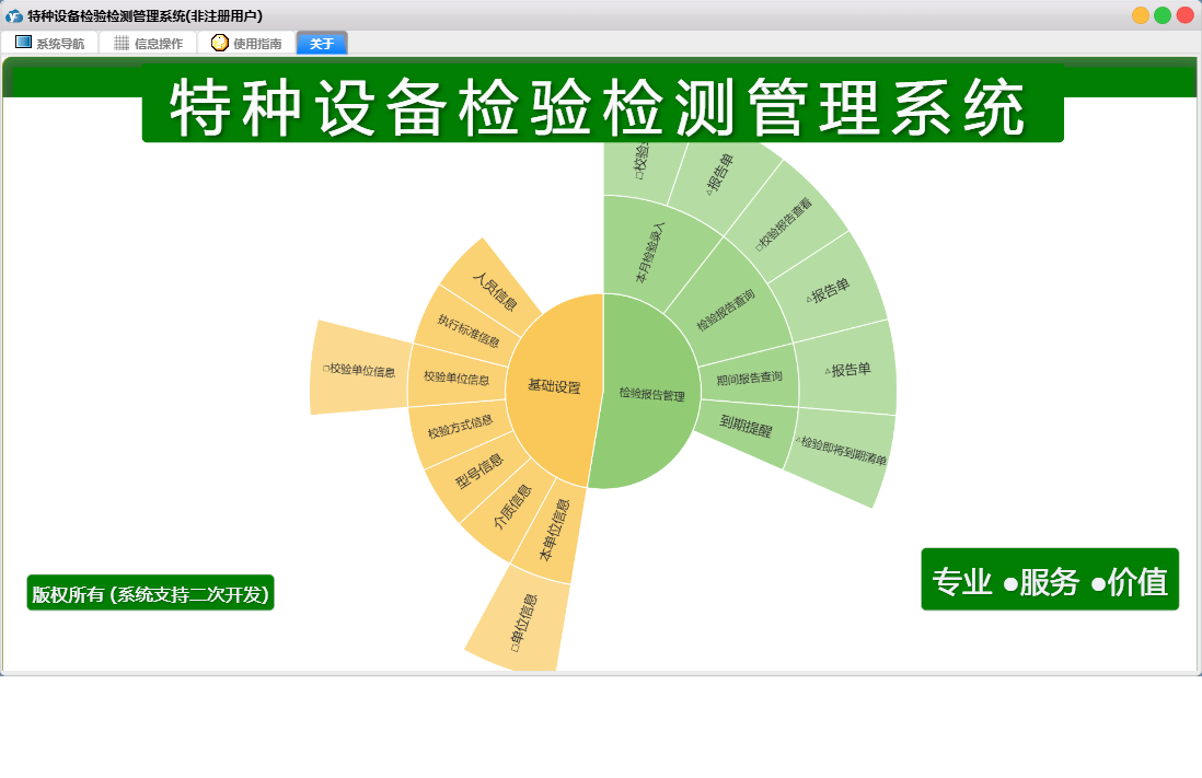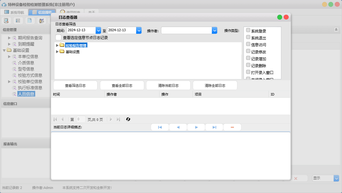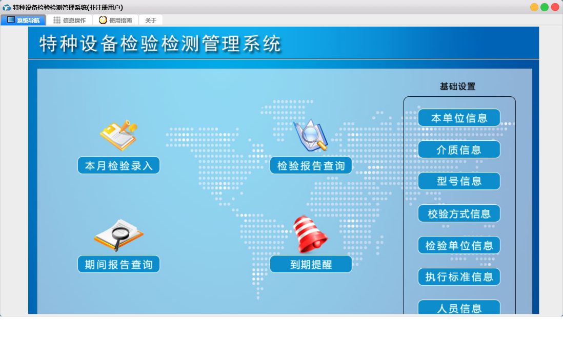 特种设备检验检测管理系统包含以下功能:本月检验录入、面板、校验单位信息、日志、检验报告查询、关于、权限设置、本单位信息等