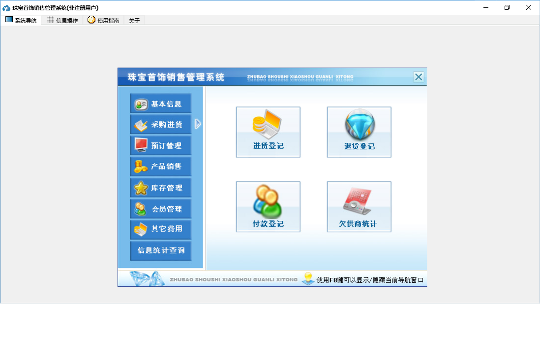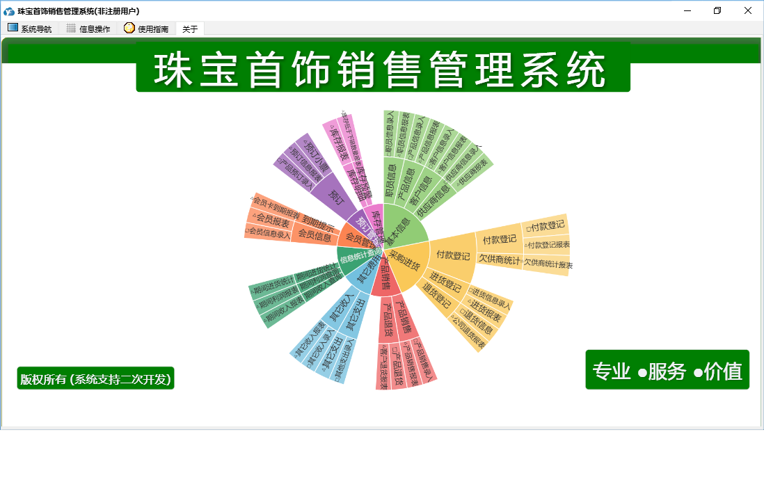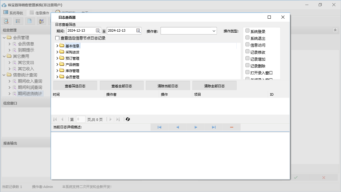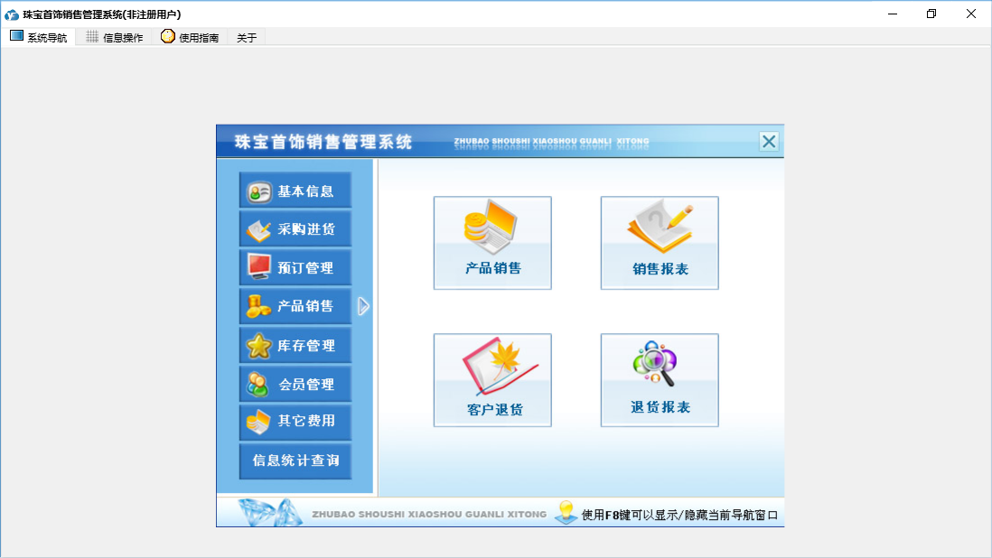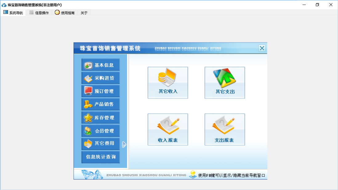 珠宝首饰销售管理系统包含以下功能:会员信息、产品信息、退货登记、采购进货、其它支出、付款登记、产品退货、预订管理、权限设置、进货登记、供应商信息、职员信息、库存管理、关于、基本信息、客户信息、产品销售、其它收入、其它费用、会员管理、日志、预订、信息统计查询等