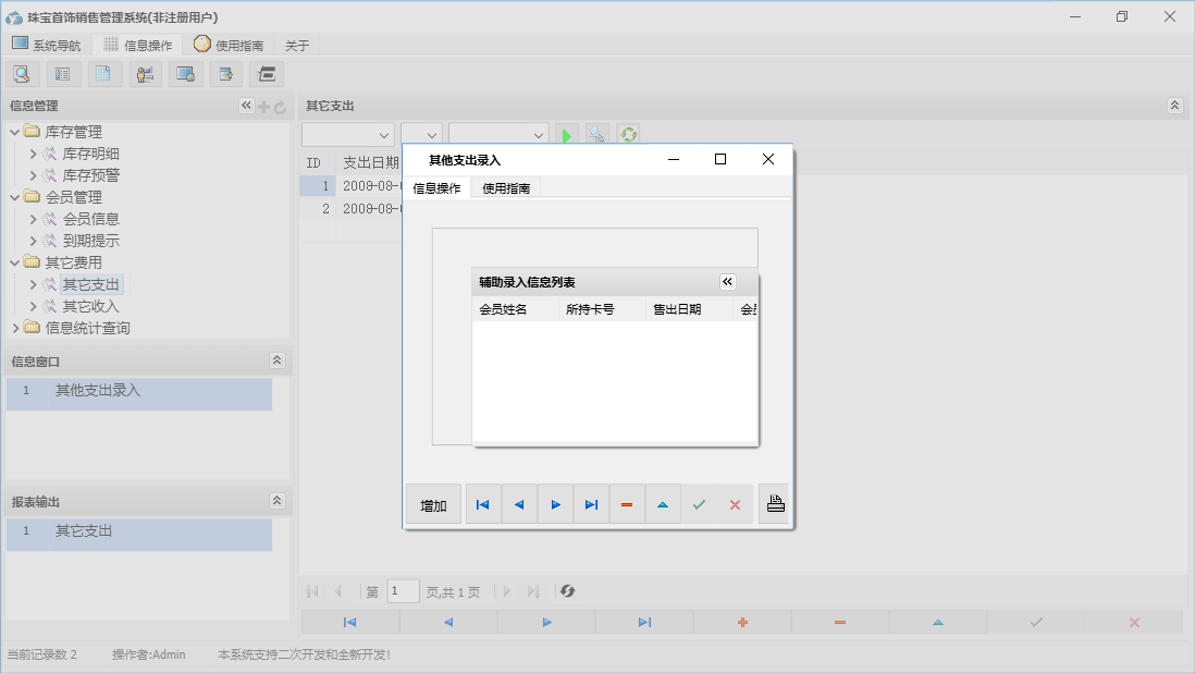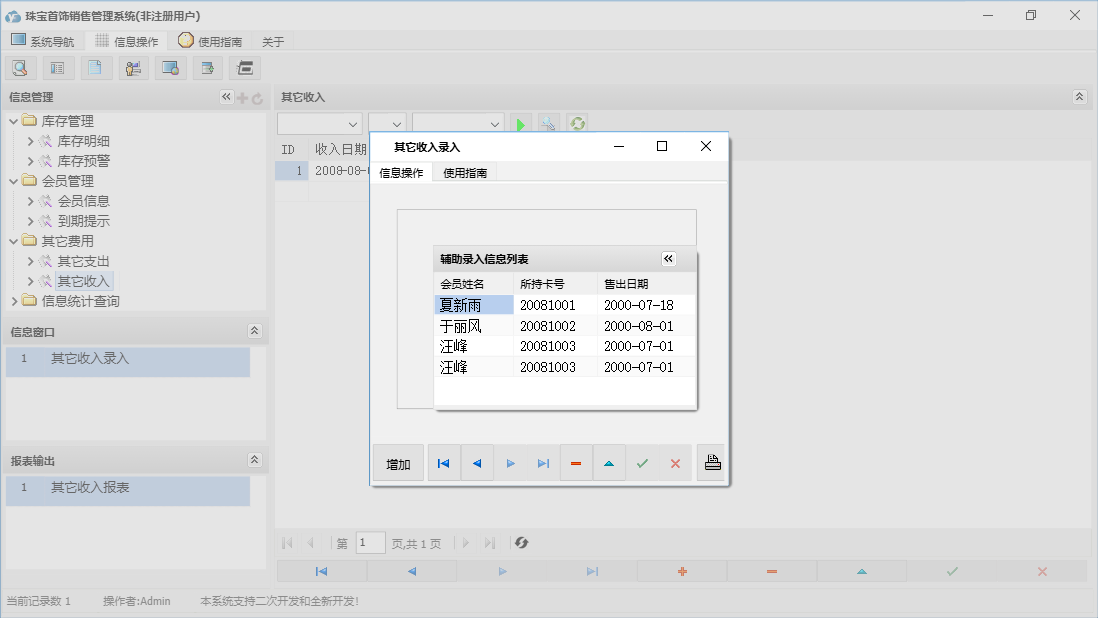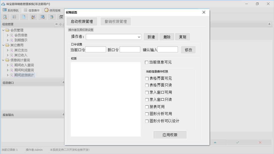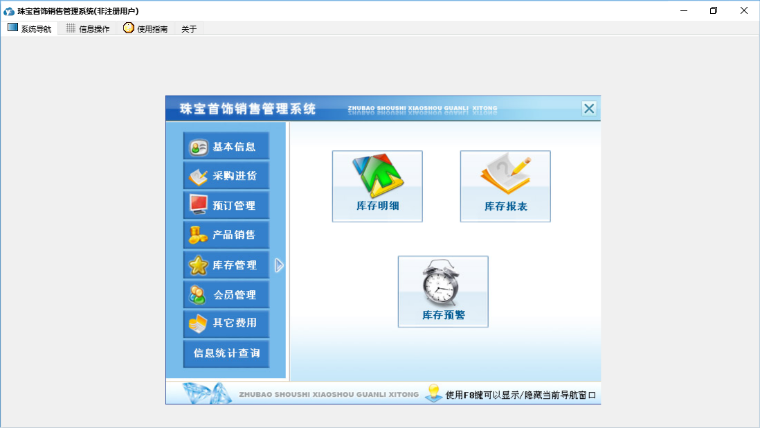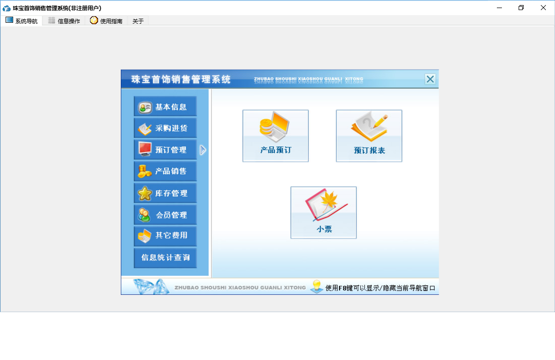 珠宝首饰销售管理系统包含以下功能:会员信息、产品信息、退货登记、采购进货、其它支出、付款登记、产品退货、预订管理、权限设置、进货登记、供应商信息、职员信息、库存管理、关于、基本信息、客户信息、产品销售、其它收入、其它费用、会员管理、日志、预订、信息统计查询等