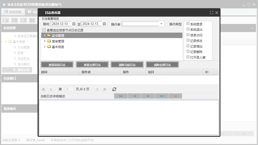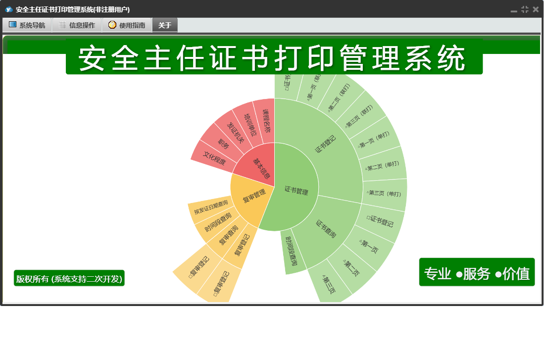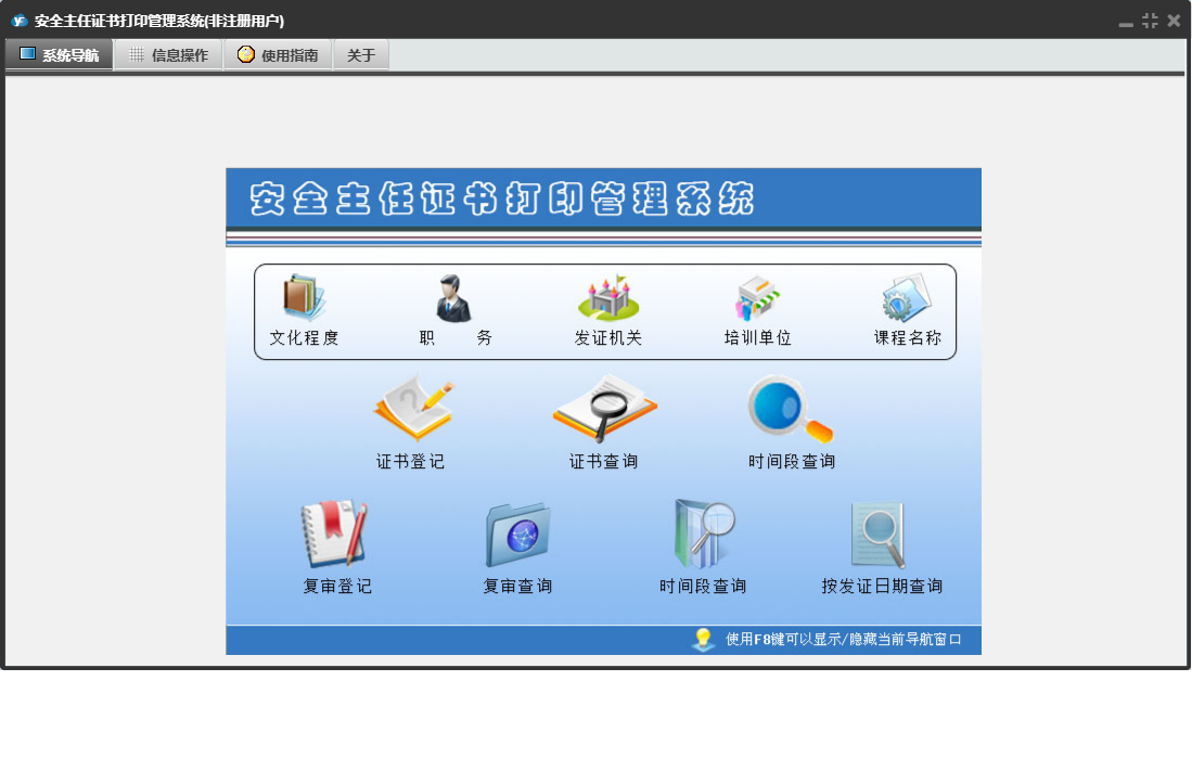 安全主任证书打印管理系统包含以下功能:证书查询、面板、复审查询、日志、关于、权限设置、复审登记、证书登记等