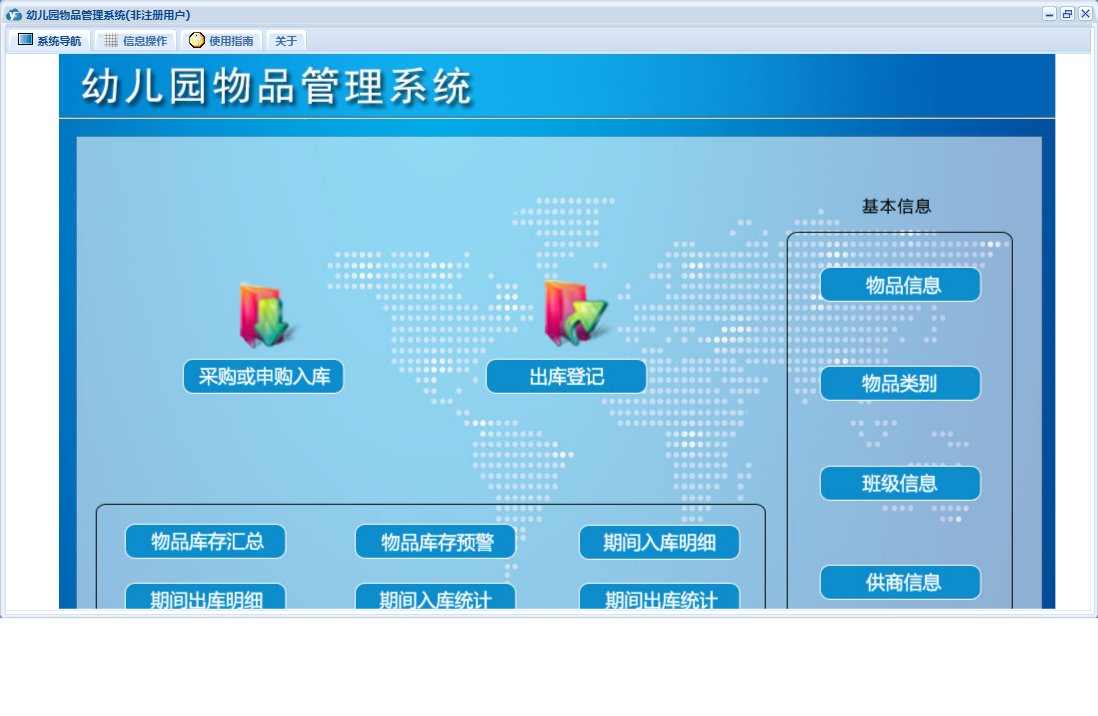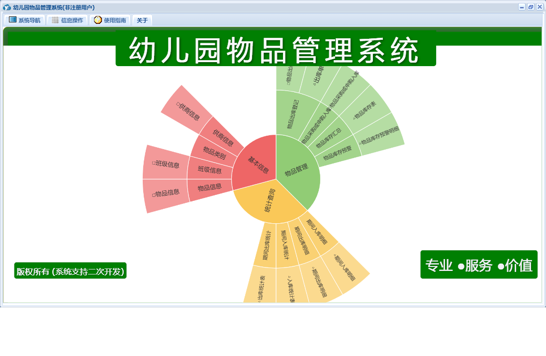 幼儿园物品管理系统包含以下功能:面板、物品采购或申购入库、日志、关于、权限设置等