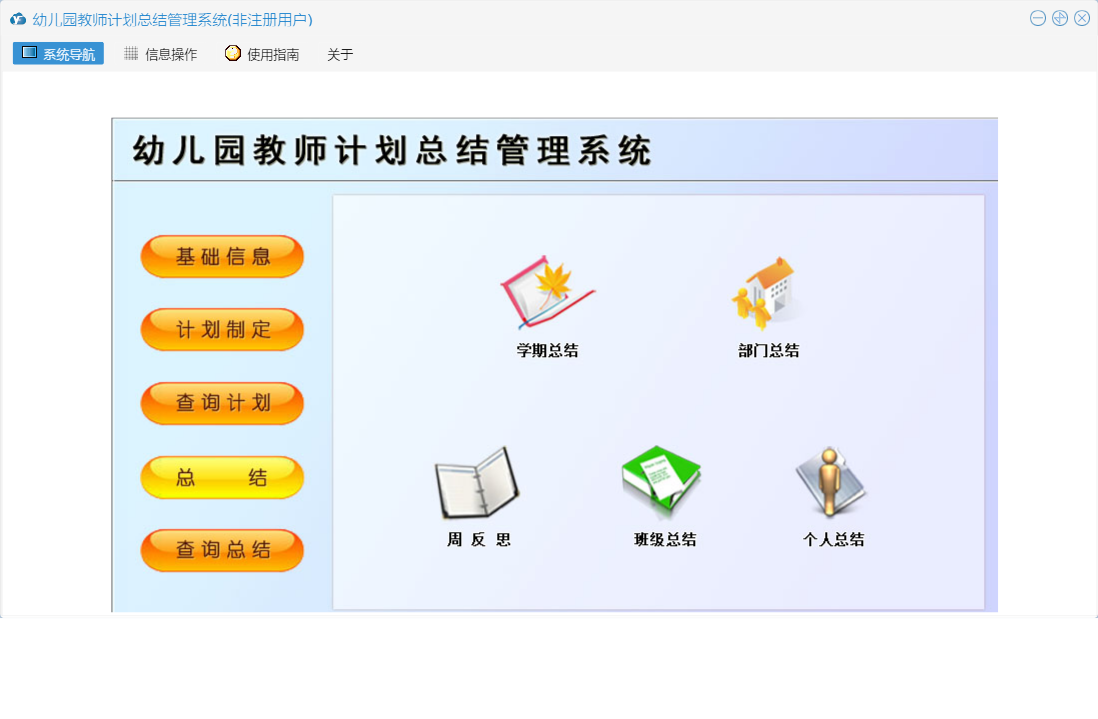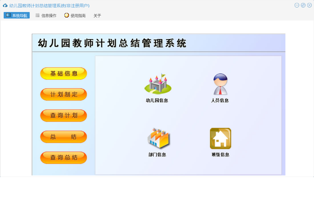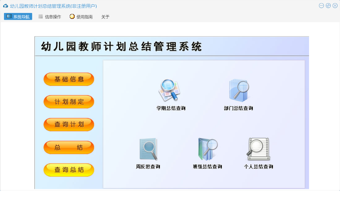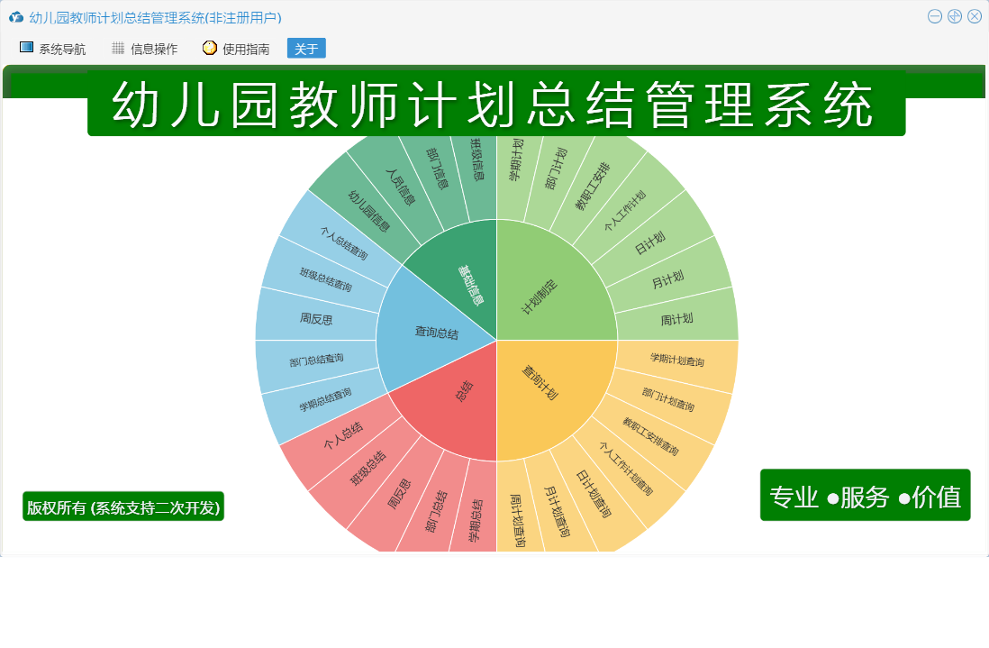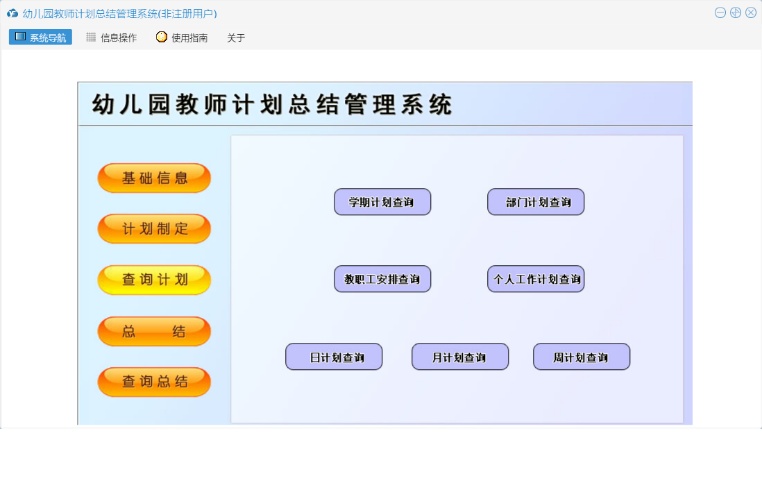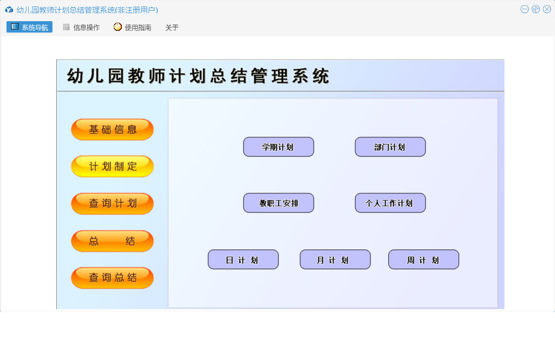 幼儿园教师计划总结管理系统包含以下功能:个人工作计划、周计划查询、班级总结、月计划查询、周计划、总结、学期计划查询、部门计划、教职工安排查询、周反思、部门总结查询、学期计划、权限设置、部门信息、学期总结查询、日计划、查询总结、关于、个人工作计划查询、部门总结、幼儿园信息、个人总结查询、日计划查询、教职工安排、基础信息、计划制定、部门计划查询、学期总结、个人总结、日志、月计划、查询计划、班级总结查询、人员信息等