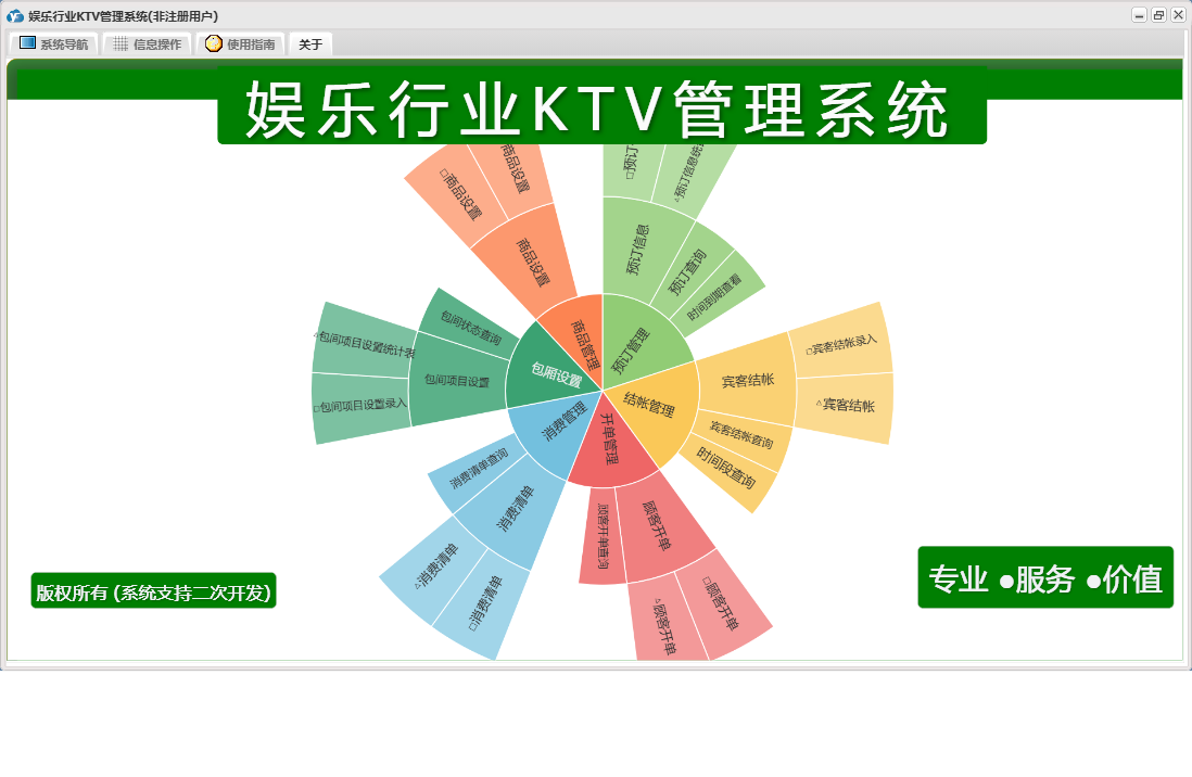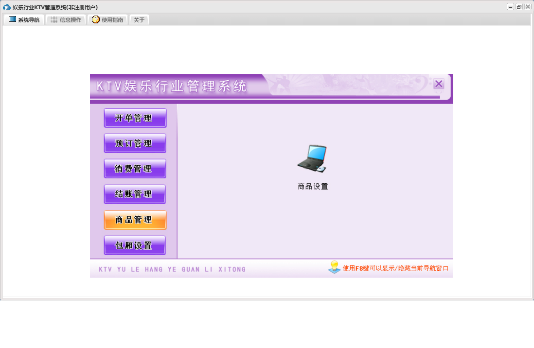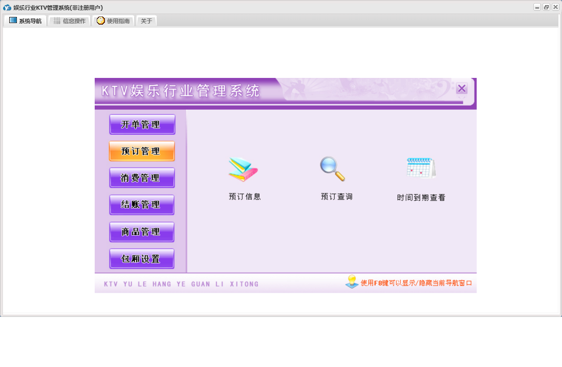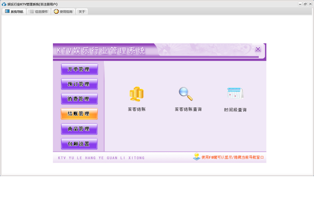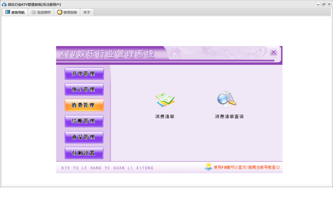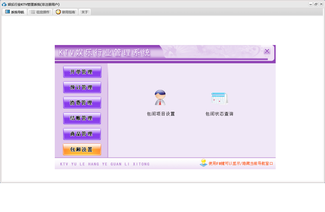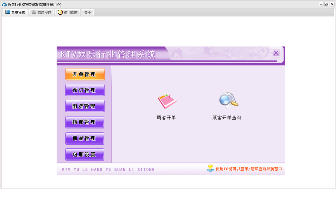 娱乐行业KTV管理系统包含以下功能:顾客开单、商品设置、结账管理、商品管理、消费管理、消费清单、包间项目设置、日志、关于、开单管理、权限设置、预订管理、包厢设置、预订信息、宾客结帐等